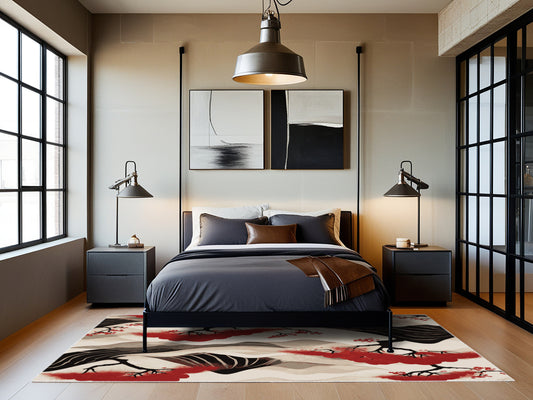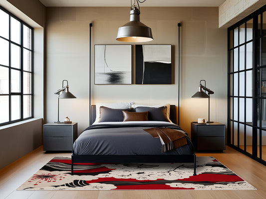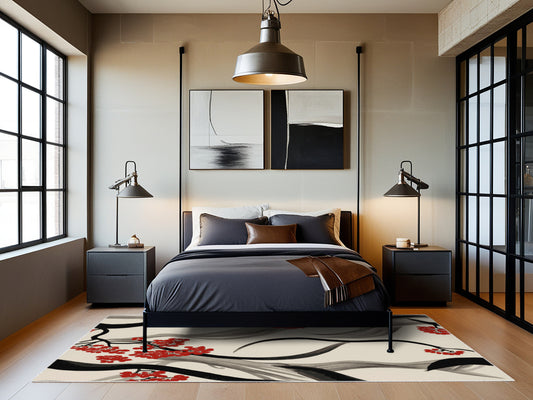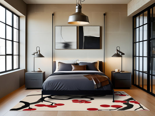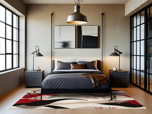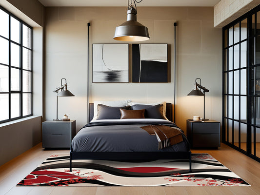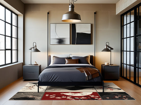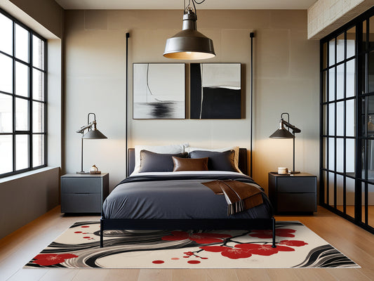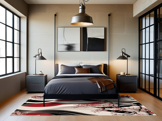 The Sakura Waves Collection encapsulates the timeless elegance of Japanese artistry, blending flowing brushstrokes with delicate cherry blossom motifs for a serene yet dynamic aesthetic. These rugs feature a harmonious palette of soft whites, crimson reds, and deep blacks, intertwined with intricate wave-like patterns and blooming sakura designs. Perfect for creating a tranquil ambiance, this collection draws inspiration from traditional Japanese ink art and nature's fleeting beauty. Ideal for living rooms, bedrooms, or zen-inspired spaces, the Sakura Waves Collection adds a refined, cultural touch to any interior. Optimize your decor with these modern, versatile rugs that balance artistic expression and functionality seamlessly.