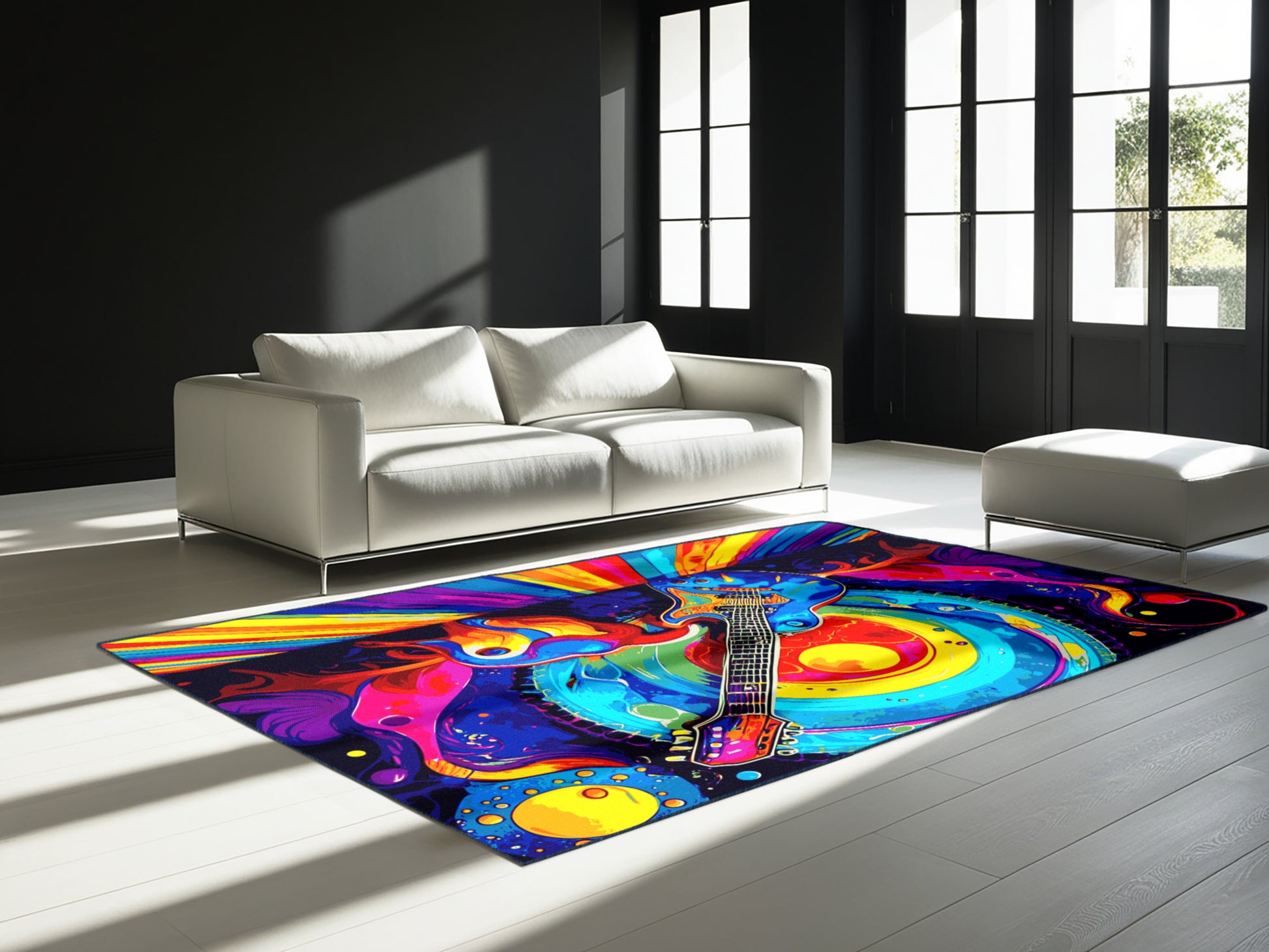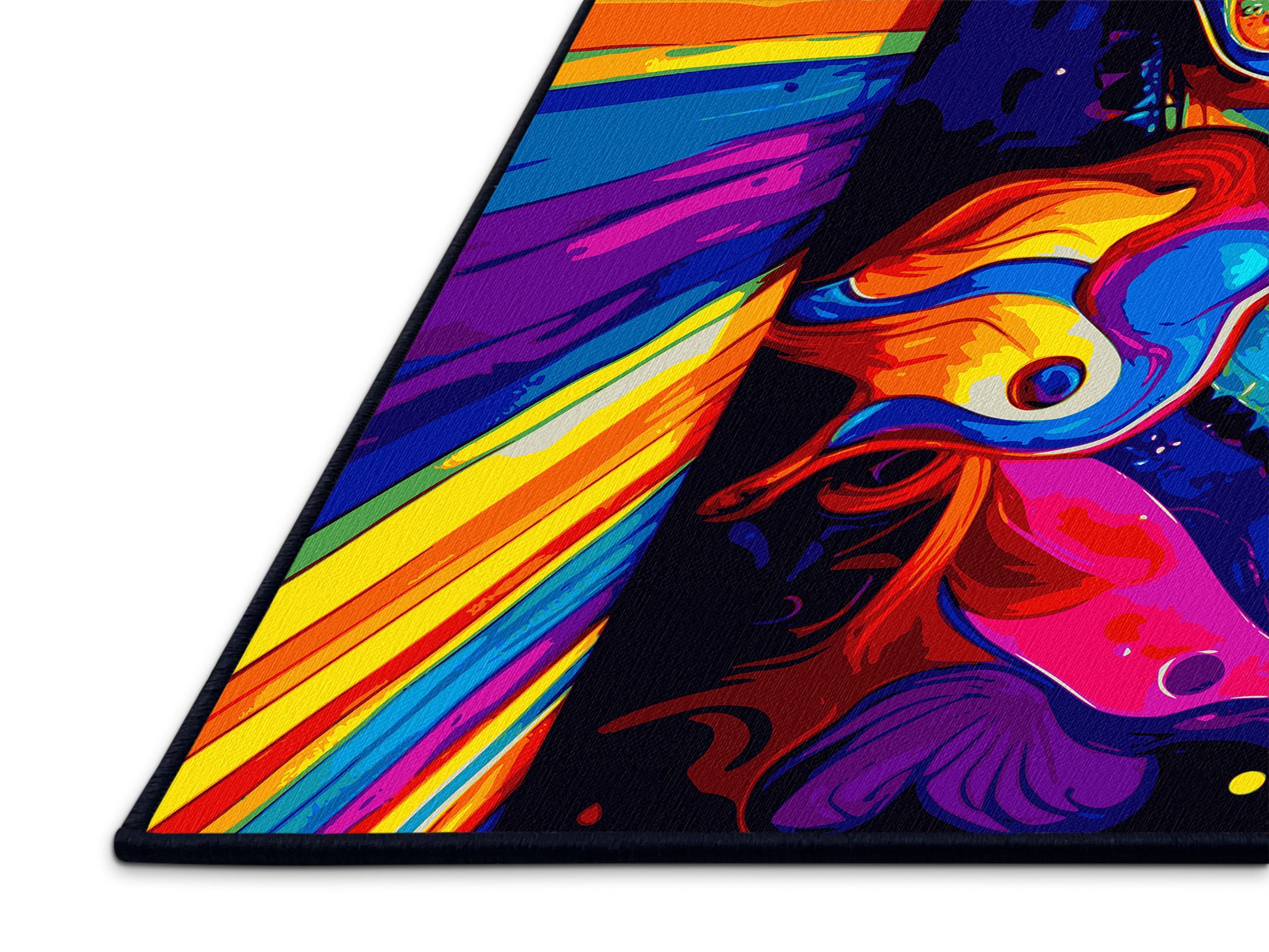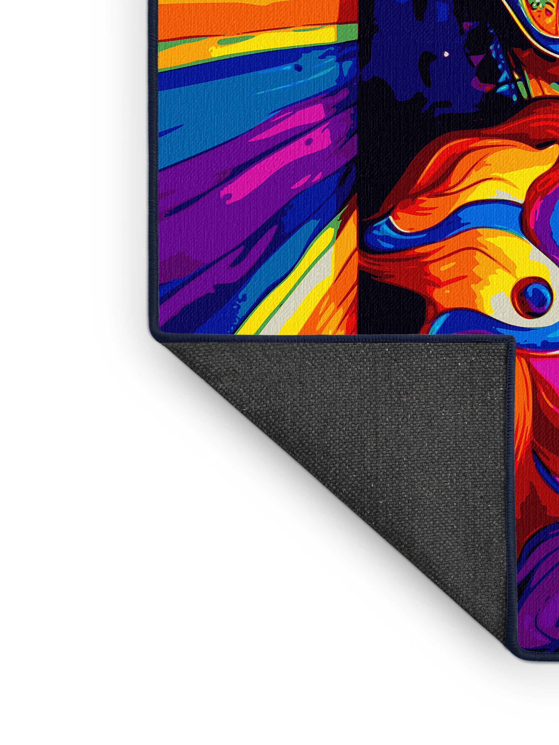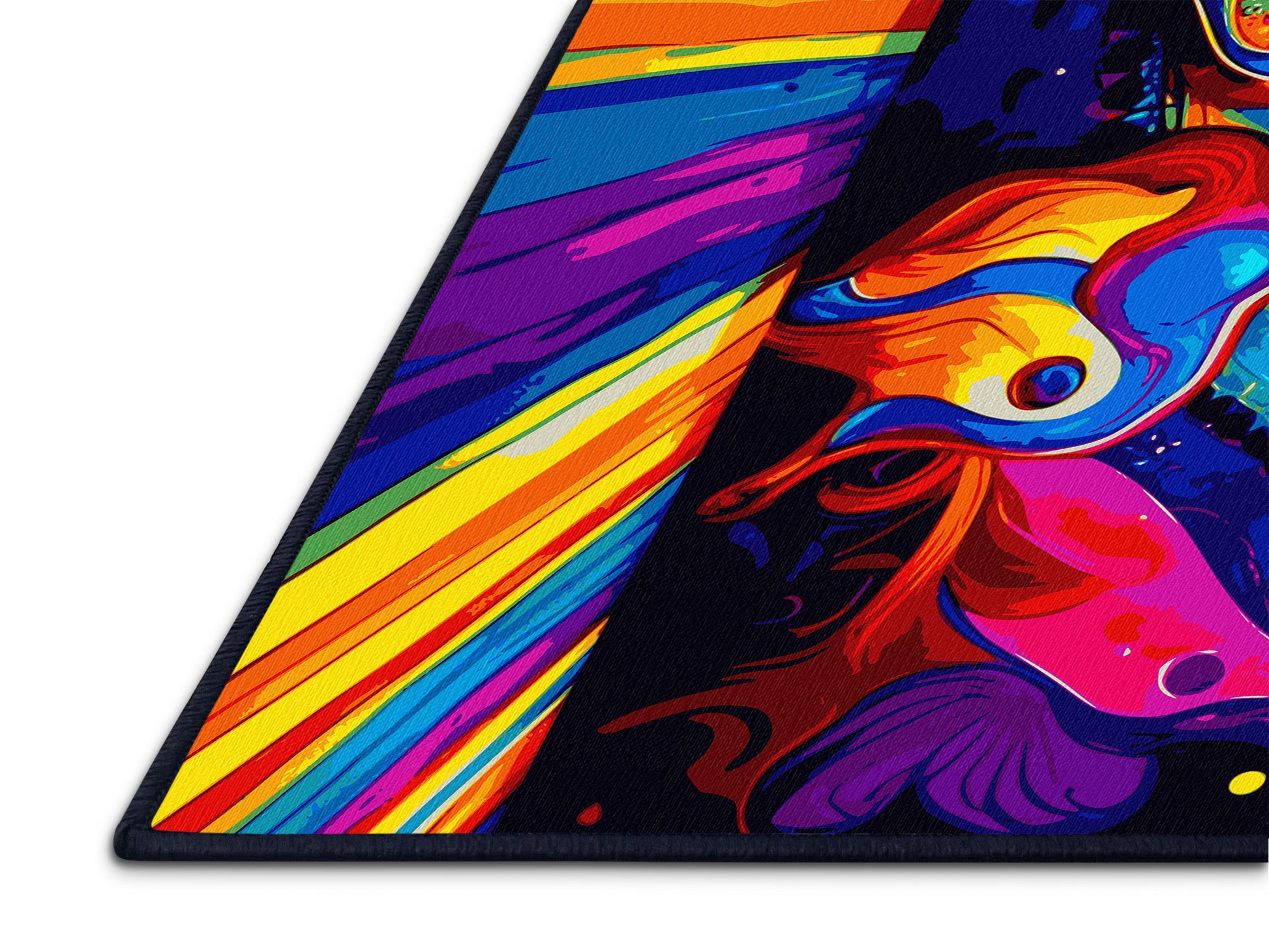 Abstract Inferno from the Psychedelia Peaks collection radiates vibrant energy with its bold Purple Iris color (A rich and elegant purple inspired by iris flowers.), a striking tone in the Purple color family. Featuring swirling, kaleidoscopic patterns and electrifying neon hues inspired by the psychedelic art movement, this rug brings a sense of dynamic motion and artistic expression to your space. Finished with Navy serging a durable edge that enhances its playful and vibrant aesthetic this rug is crafted from premium polyester and machine-made in the USA with imported materials. Perfect for eclectic living rooms, retro-inspired spaces, or creative studios, this design transforms any room into a lively haven of individuality and boldness. Available in multiple sizes, the Psychedelia Peaks collection adds a dramatic, colorful statement to your decor, turning your home into a canvas of unrestrained creativity.