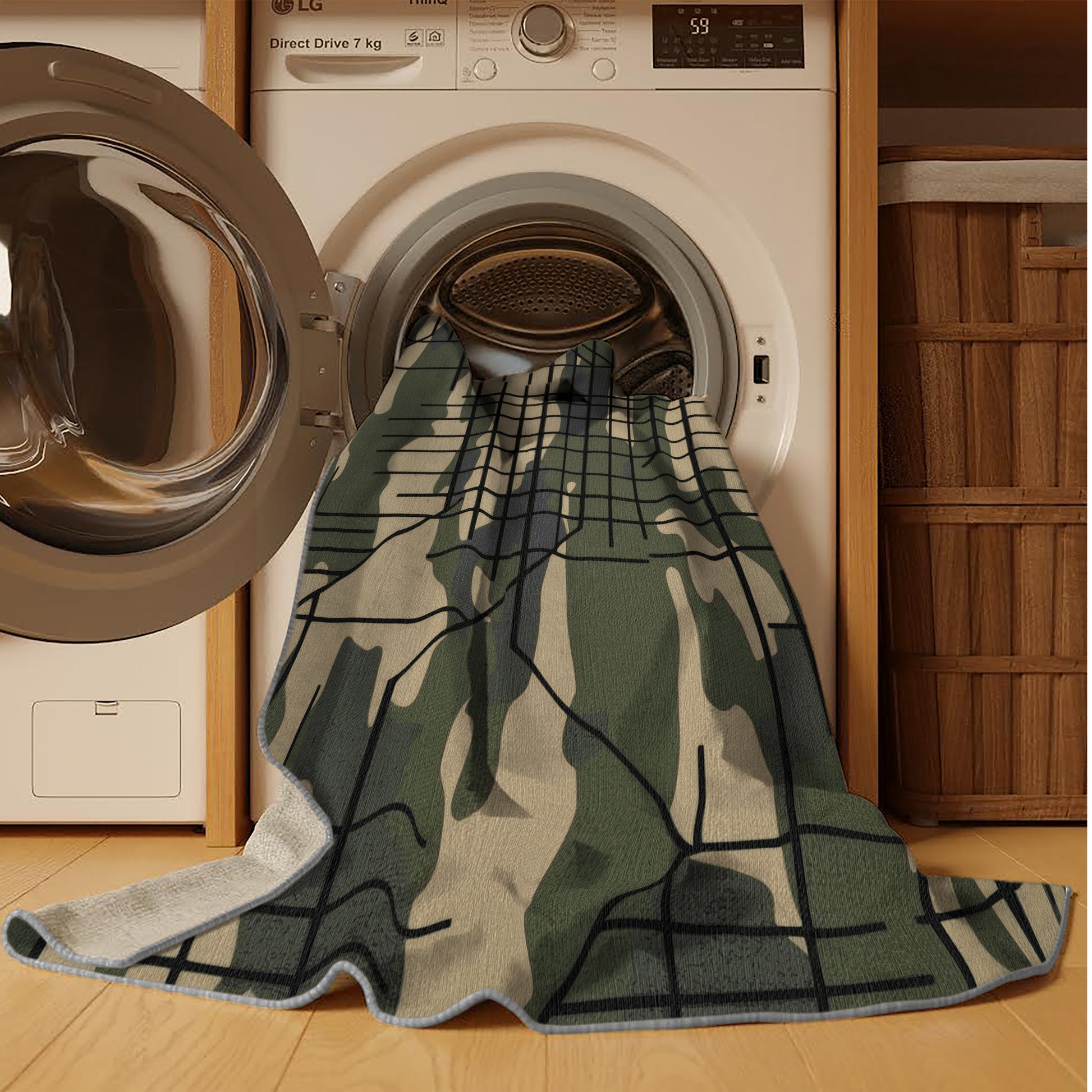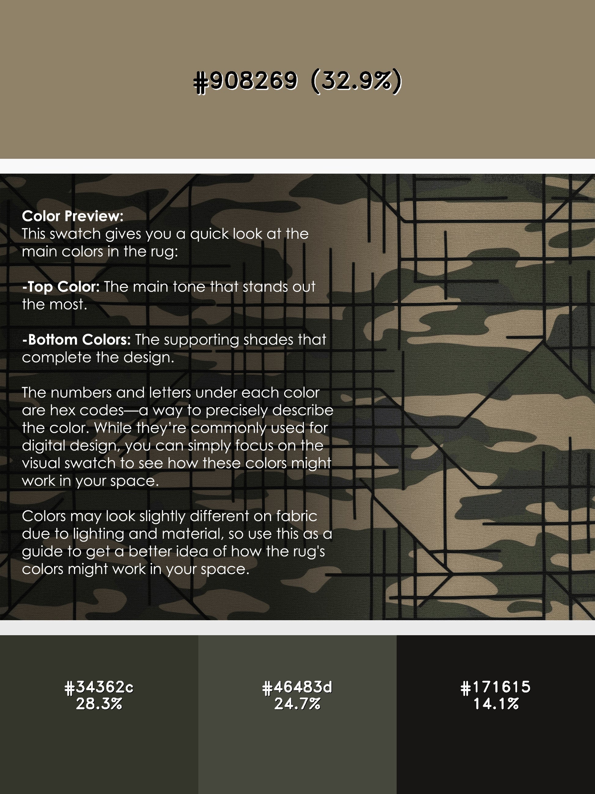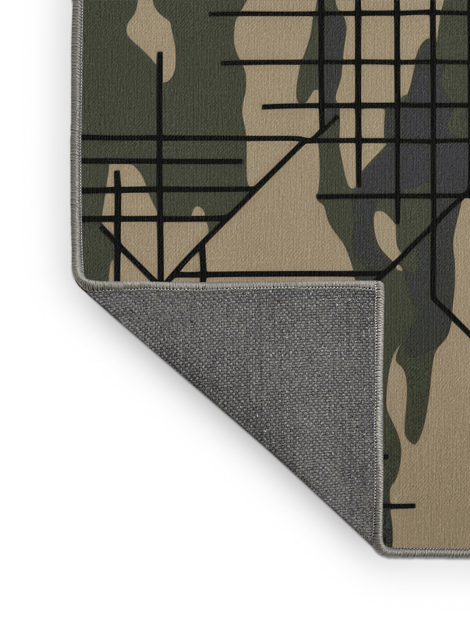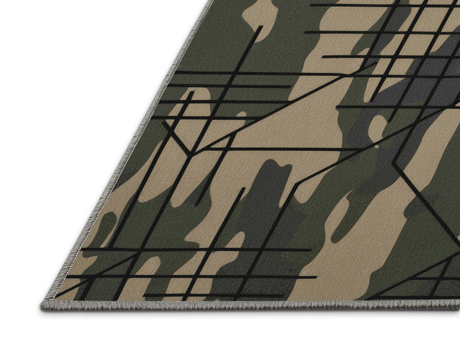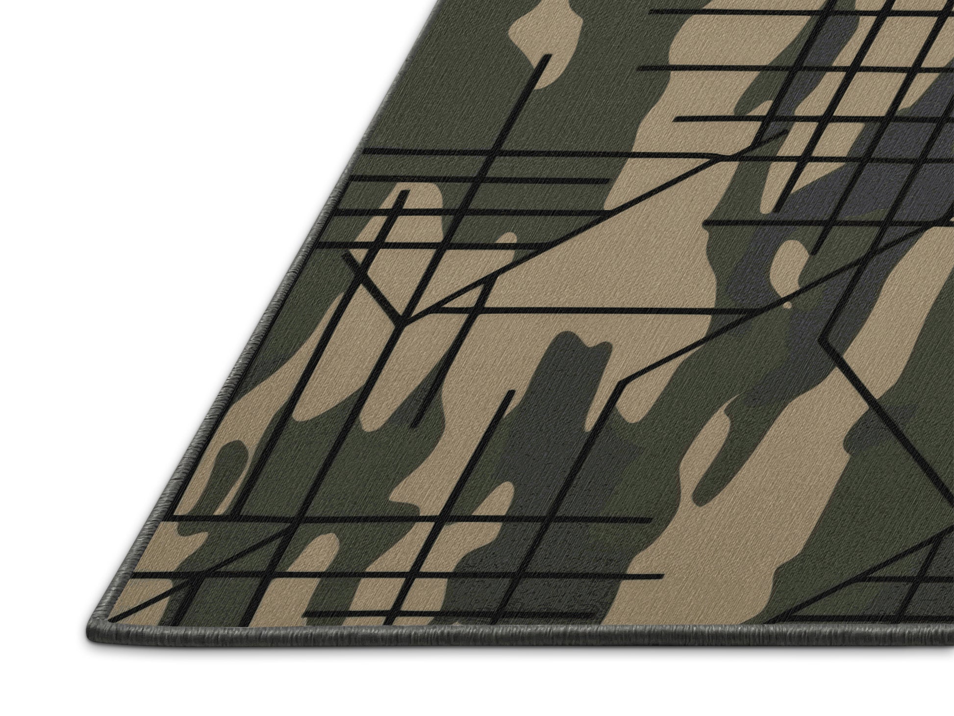Apex Gridlock from the Tactical Terrain collection brings rugged sophistication to your space with its striking Sage Green color (A soft and muted green with a touch of gray, calm and soothing.), a bold tone in the Green color family. Inspired by military camouflage and geometric precision, this rug features angular motifs, sharp black gridlines, and a muted palette that evokes strength and resilience. Finished with Gray serging a durable edge that enhances its contemporary aesthetic this rug is crafted from premium polyester and machine-made in the USA with imported materials. Perfect for modern living rooms, industrial home offices, or creative studios, this design blends tactical flair with versatile style. Available in multiple sizes, the Tactical Terrain collection transforms your home with a distinctive edge and bold character, elevating any decor scheme.