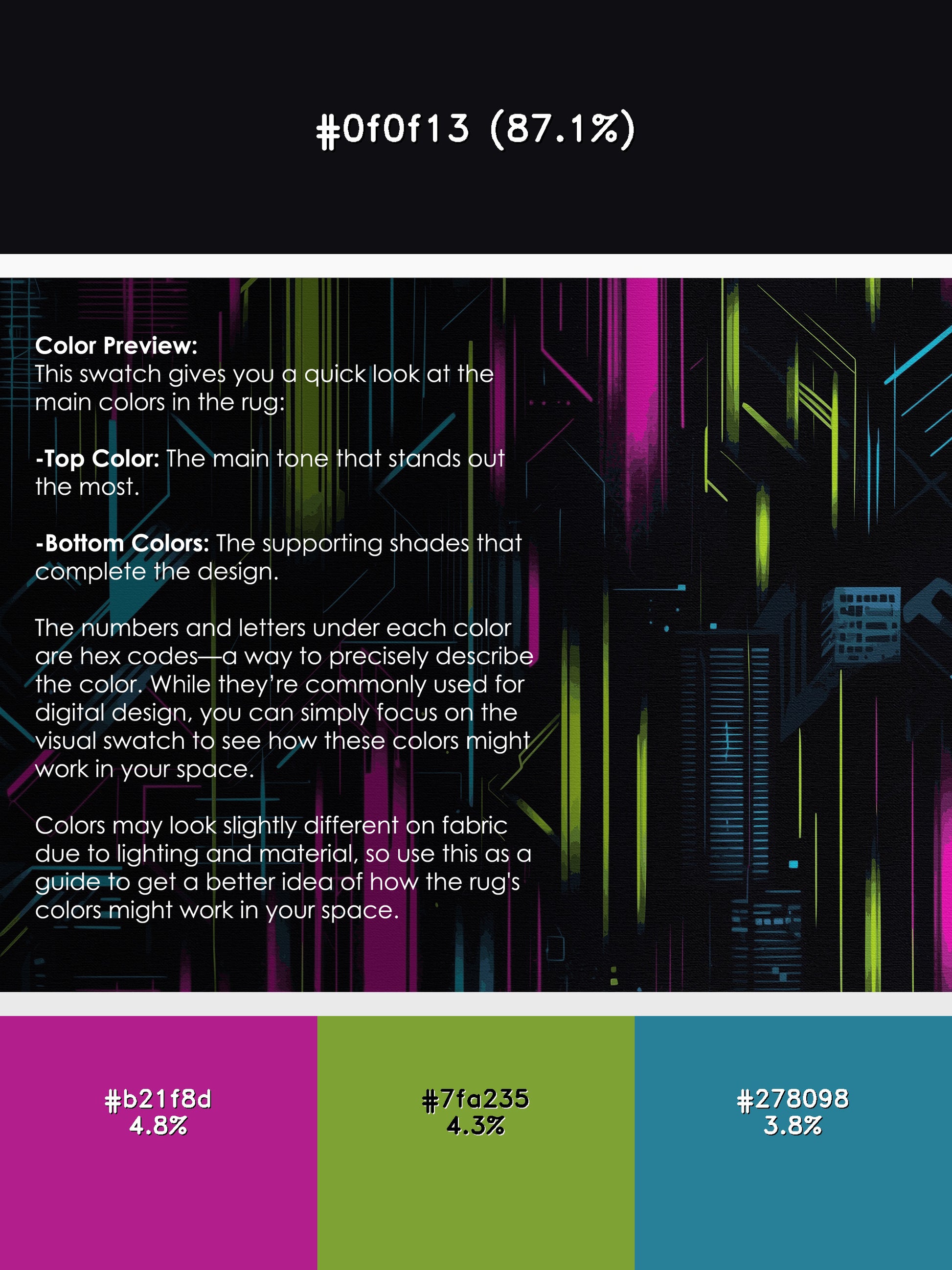 Aurora Circuit from the Neon Nexus collection electrifies your space with its bold Charcoal Blue color (A dark, muted blue with gray undertones, sleek and understated.), a striking tone in the Blue color family. Inspired by neon-lit cityscapes and cyberpunk design, this rug features sharp geometric patterns and dynamic lines illuminated by vibrant, electric hues. Finished with Black serging a sleek edge that enhances its futuristic appeal this rug is crafted from premium polyester and machine-made in the USA with imported materials. Perfect for modern gaming rooms, creative studios, or contemporary living spaces, this design balances cutting-edge energy with adaptable elegance. Available in multiple sizes, the Neon Nexus collection transforms any room into a bold statement of innovation and style, channeling the vibrant glow of a cyberpunk universe.