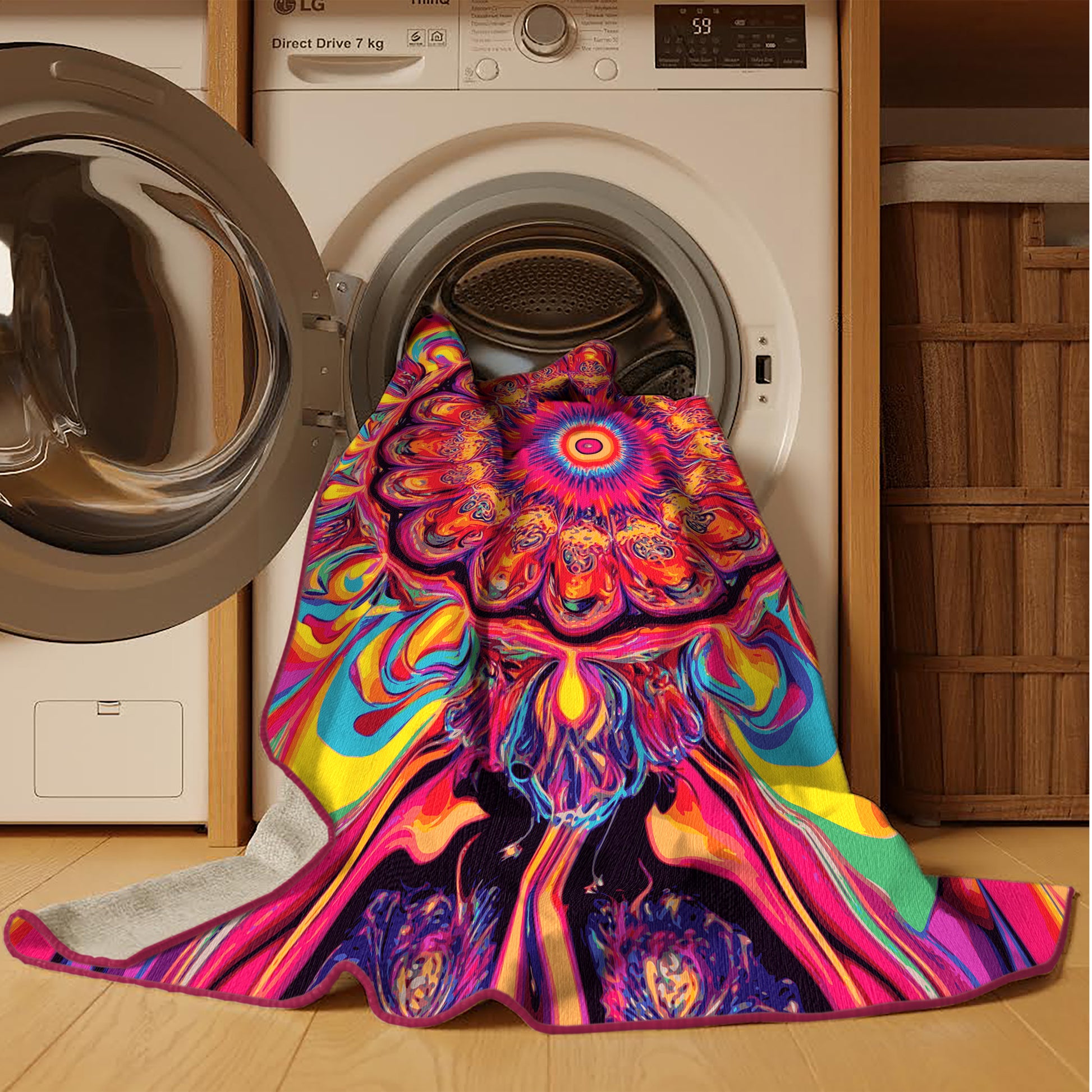 Aurora Spiral from the Psychedelia Peaks collection radiates vibrant energy with its bold Dark Pink color (A bold and deep pink, perfect for dramatic designs.), a striking tone in the Pink color family. Featuring swirling, kaleidoscopic patterns and electrifying neon hues inspired by the psychedelic art movement, this rug brings a sense of dynamic motion and artistic expression to your space. Finished with Rose serging a durable edge that enhances its playful and vibrant aesthetic this rug is crafted from premium polyester and machine-made in the USA with imported materials. Perfect for eclectic living rooms, retro-inspired spaces, or creative studios, this design transforms any room into a lively haven of individuality and boldness. Available in multiple sizes, the Psychedelia Peaks collection adds a dramatic, colorful statement to your decor, turning your home into a canvas of unrestrained creativity.