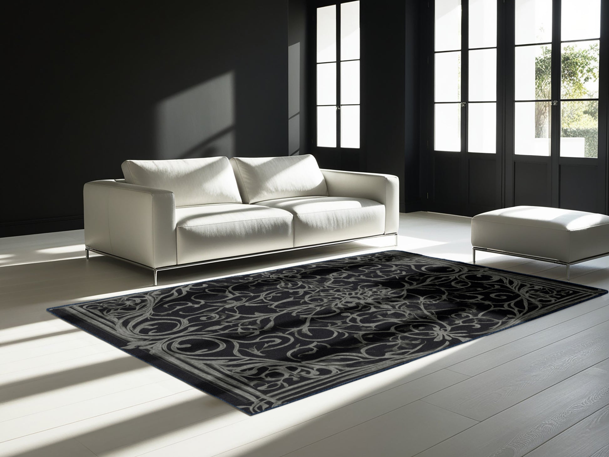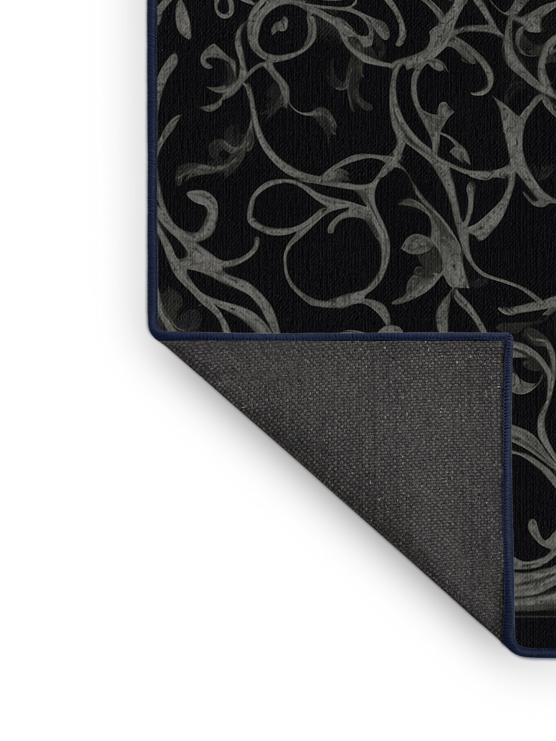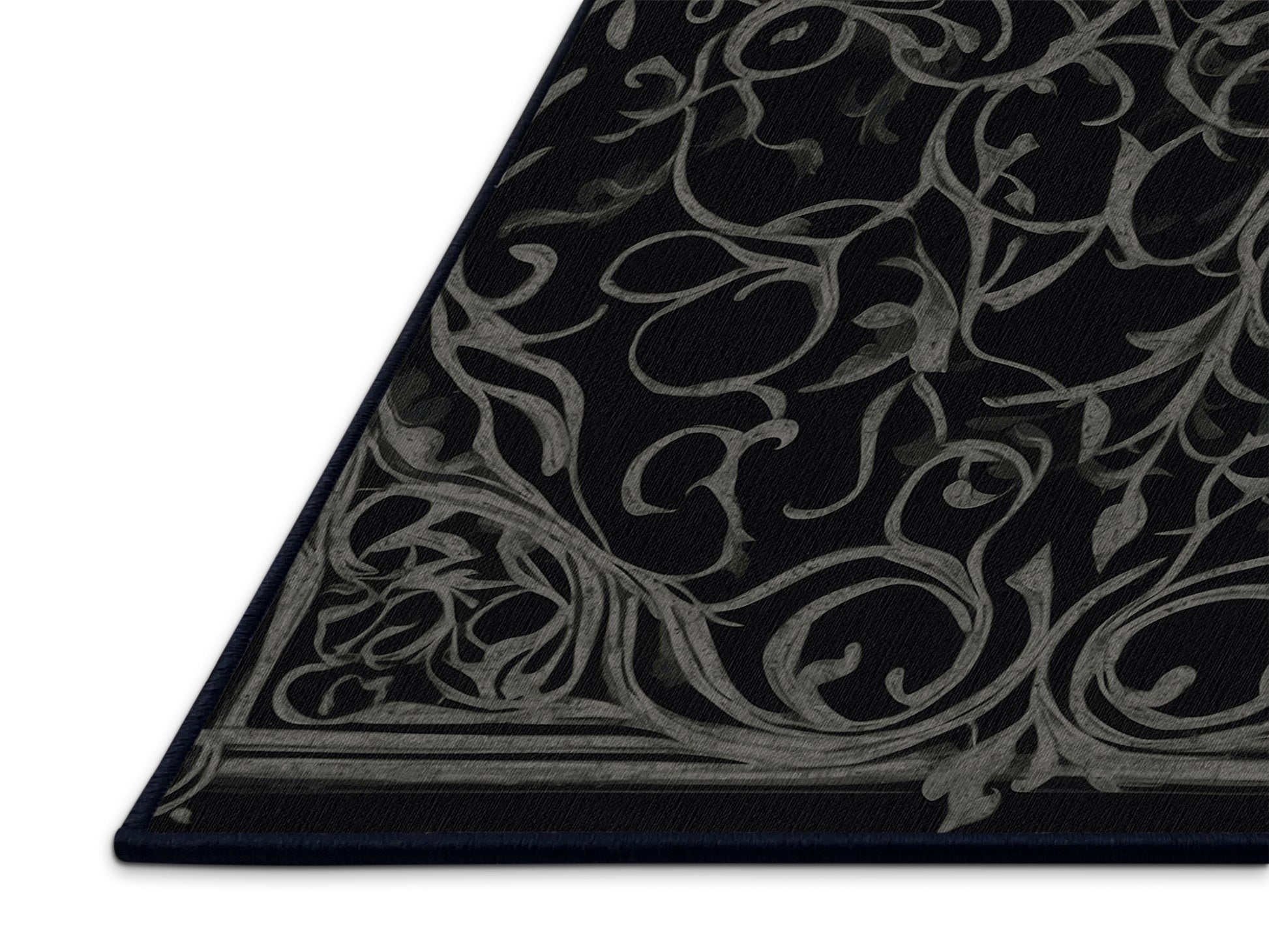 Black Elegance from the Nocturne Elegance collection exudes timeless sophistication with its captivating Night color (A rich, dark black with a hint of depth, evoking the stillness of night.), a rich tone in the Black color family. Featuring intricate baroque-inspired patterns and swirling vine designs, this rug creates a sense of depth and refined elegance. Finished with Navy serging a durable edge that enhances its luxurious aesthetic this rug is crafted from premium polyester and machine-made in the USA with imported materials. Perfect for formal dining rooms, chic living areas, or cozy bedrooms, this design balances bold drama with subtle charm, complementing both contemporary and traditional interiors. Available in multiple sizes, the Nocturne Elegance collection transforms your home into a haven of understated grandeur and classic refinement.