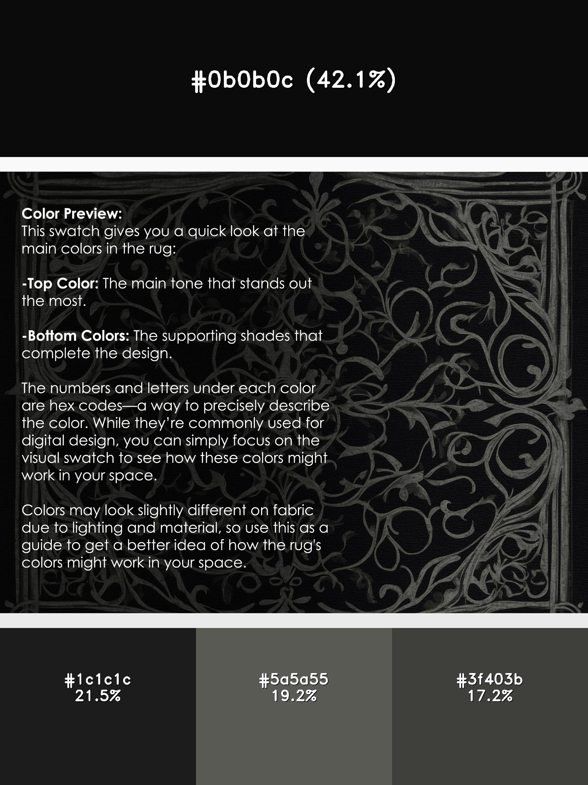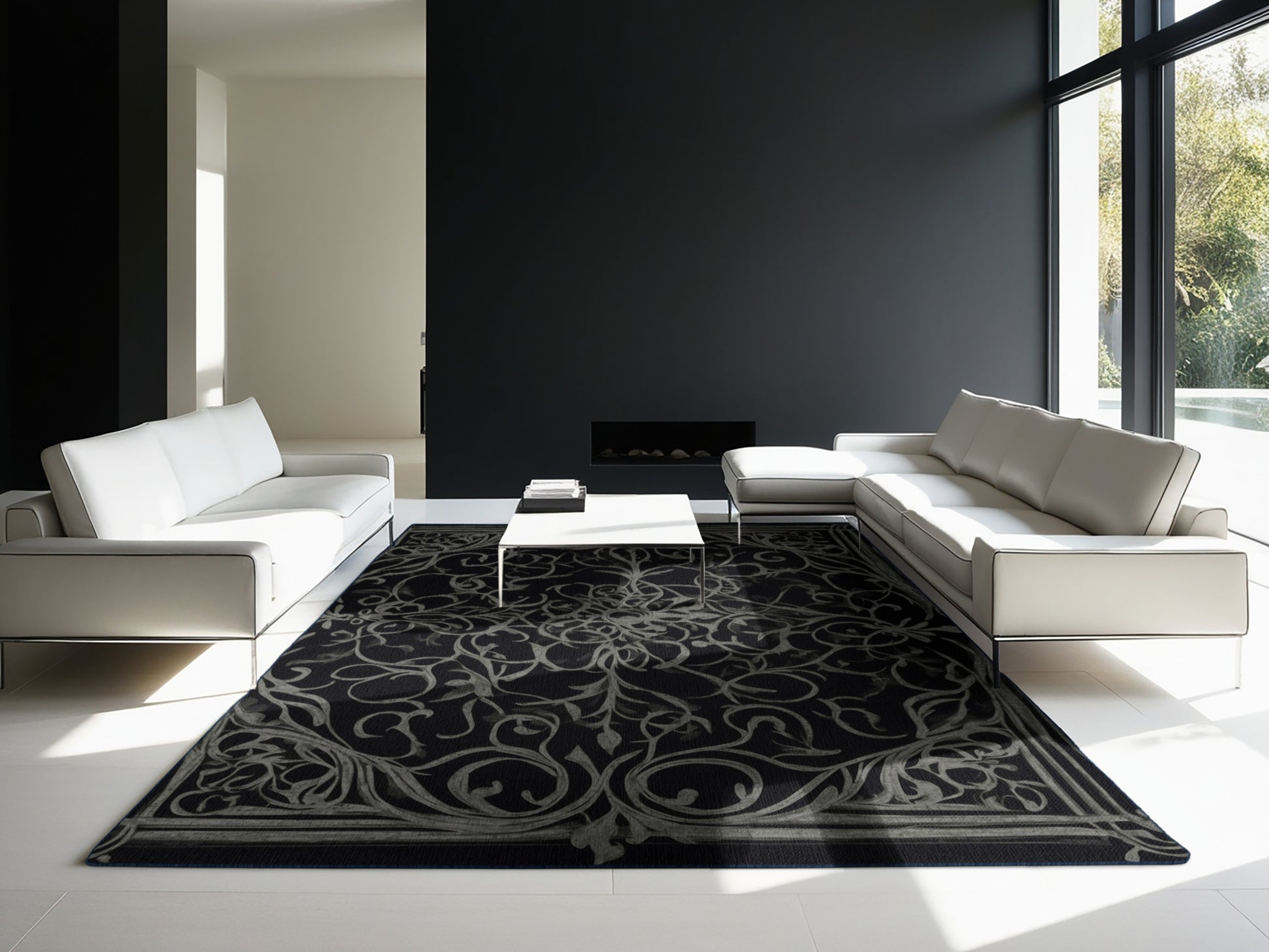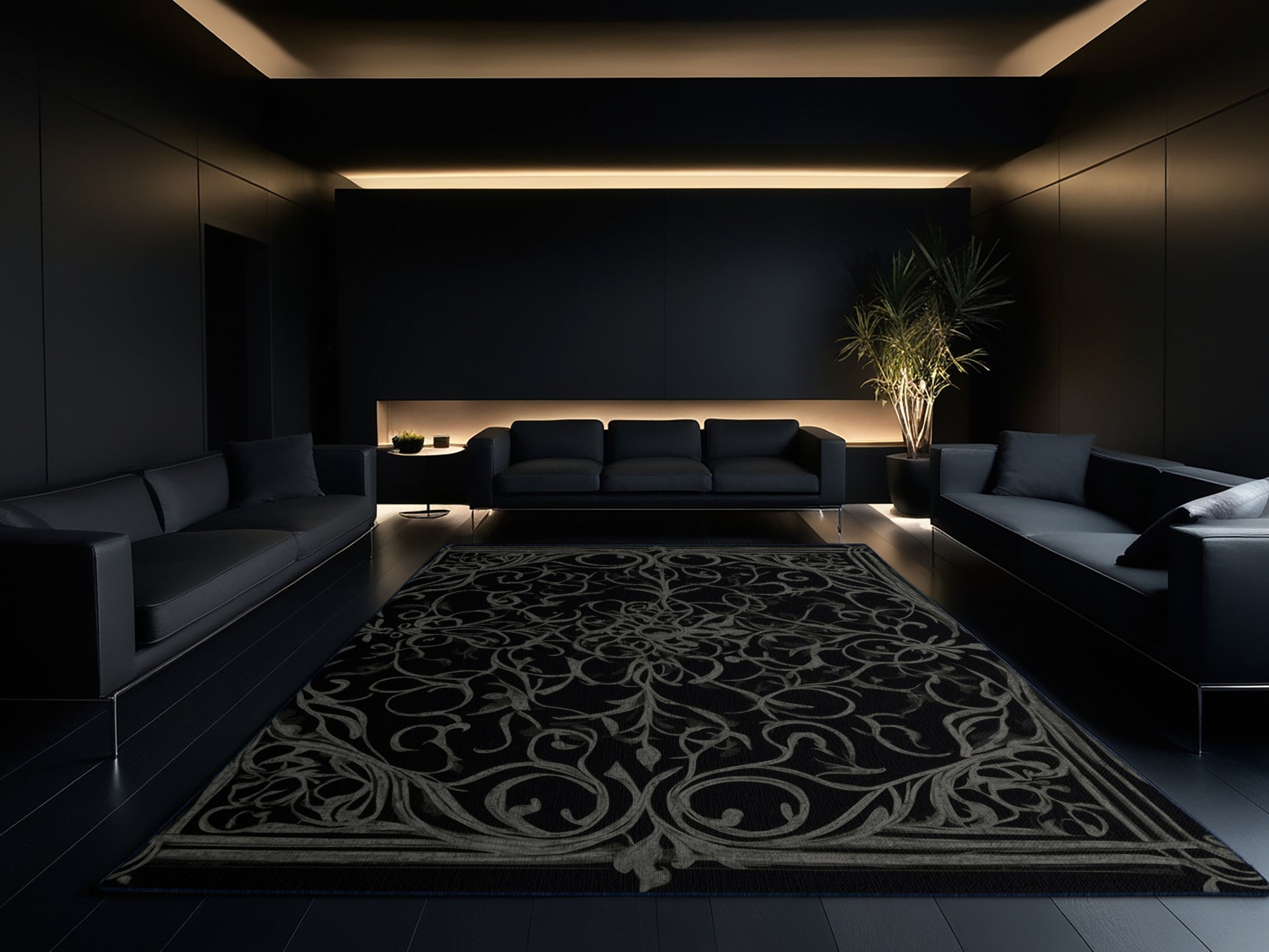 Black Elegance from the Nocturne Elegance collection exudes timeless sophistication with its captivating Night color (A rich, dark black with a hint of depth, evoking the stillness of night.), a rich tone in the Black color family. Featuring intricate baroque-inspired patterns and swirling vine designs, this rug creates a sense of depth and refined elegance. Finished with Navy serging a durable edge that enhances its luxurious aesthetic this rug is crafted from premium polyester and machine-made in the USA with imported materials. Perfect for formal dining rooms, chic living areas, or cozy bedrooms, this design balances bold drama with subtle charm, complementing both contemporary and traditional interiors. Available in multiple sizes, the Nocturne Elegance collection transforms your home into a haven of understated grandeur and classic refinement.