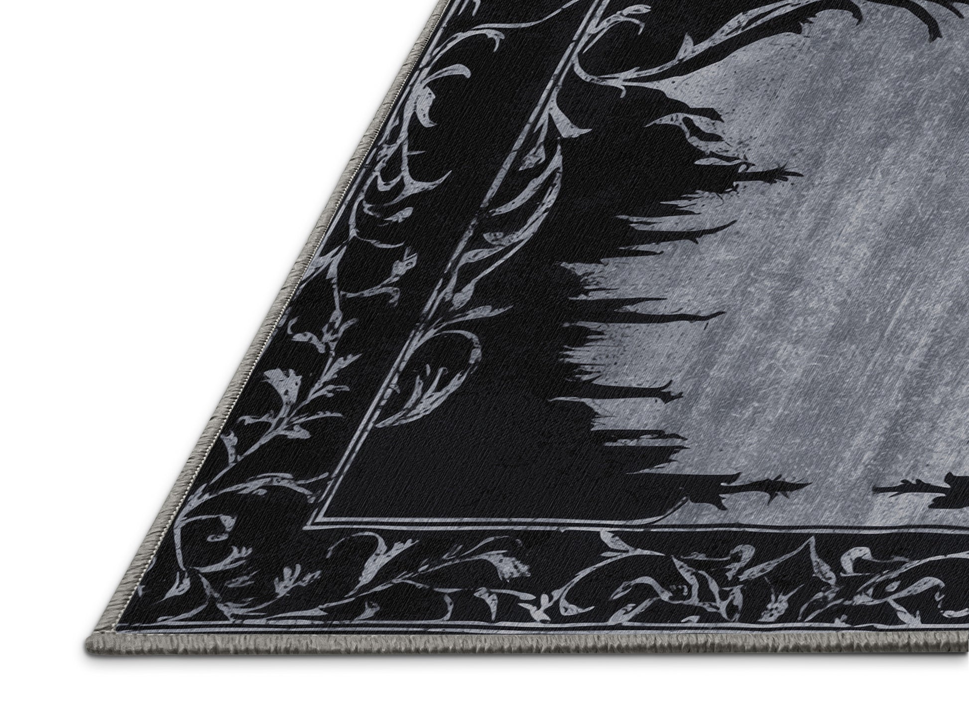 Black Rosewood from the Nocturne Elegance collection exudes timeless sophistication with its captivating Night color (A rich, dark black with a hint of depth, evoking the stillness of night.), a rich tone in the Black color family. Featuring intricate baroque-inspired patterns and swirling vine designs, this rug creates a sense of depth and refined elegance. Finished with Gray serging a durable edge that enhances its luxurious aesthetic this rug is crafted from premium polyester and machine-made in the USA with imported materials. Perfect for formal dining rooms, chic living areas, or cozy bedrooms, this design balances bold drama with subtle charm, complementing both contemporary and traditional interiors. Available in multiple sizes, the Nocturne Elegance collection transforms your home into a haven of understated grandeur and classic refinement.
