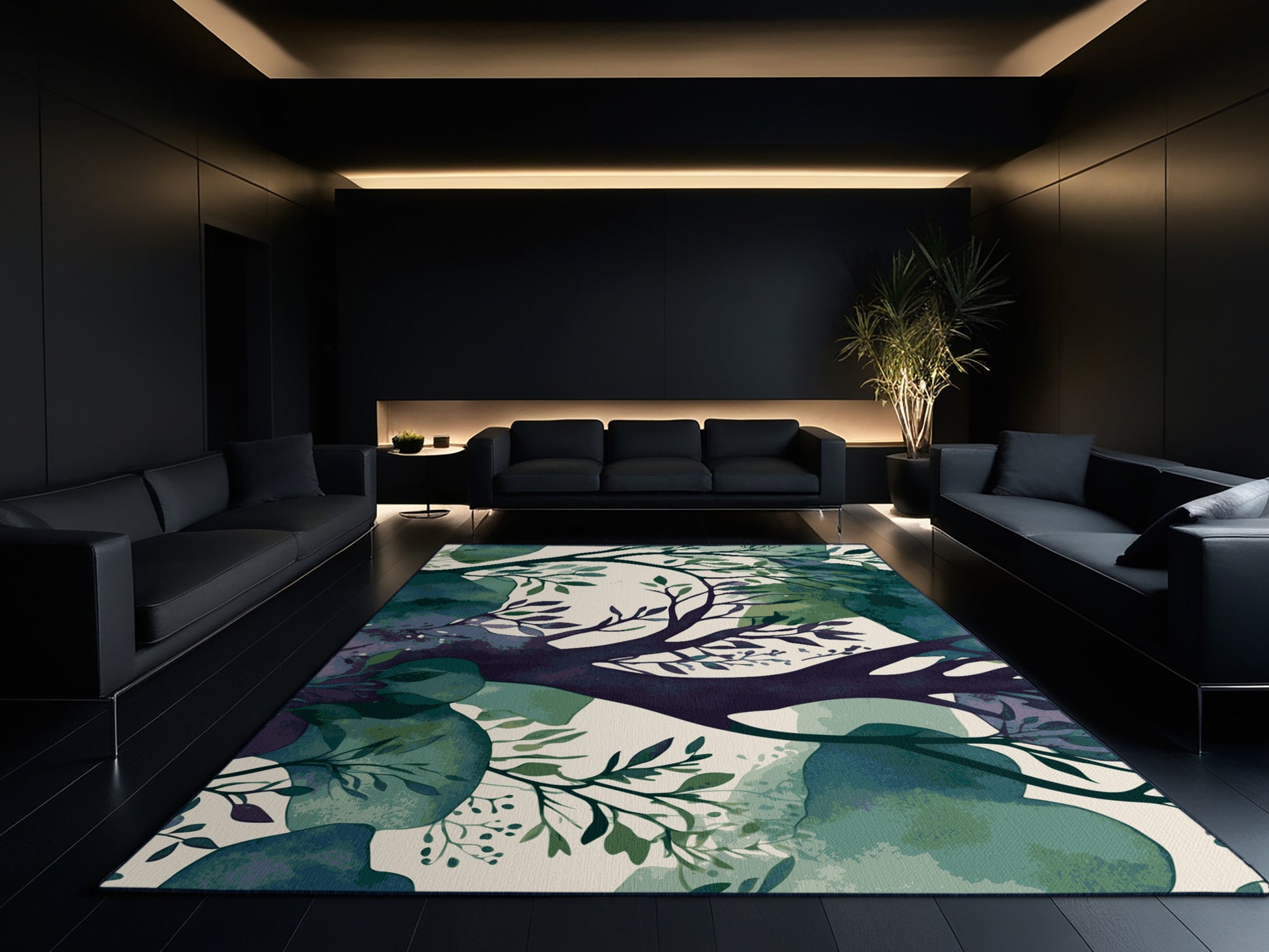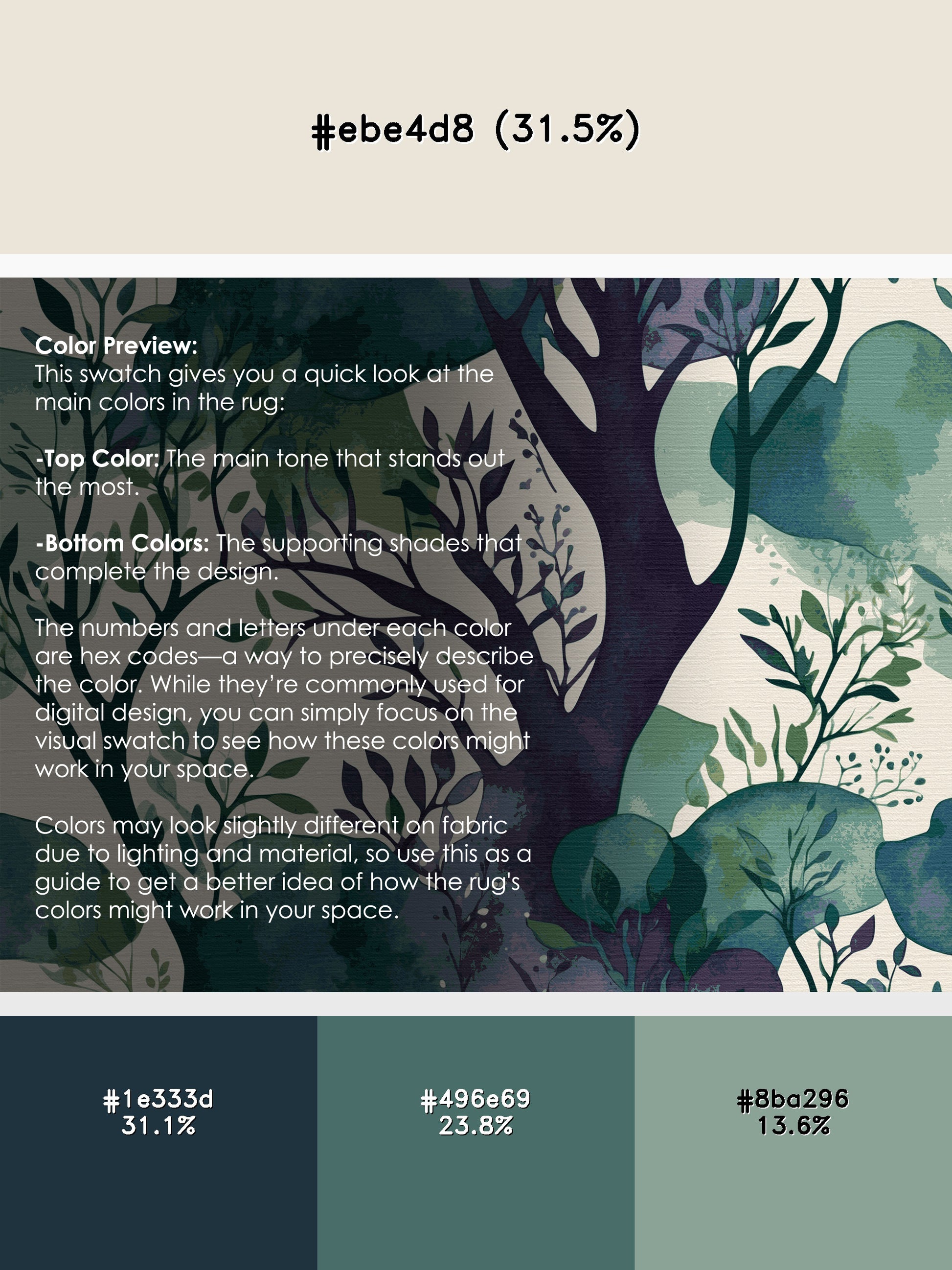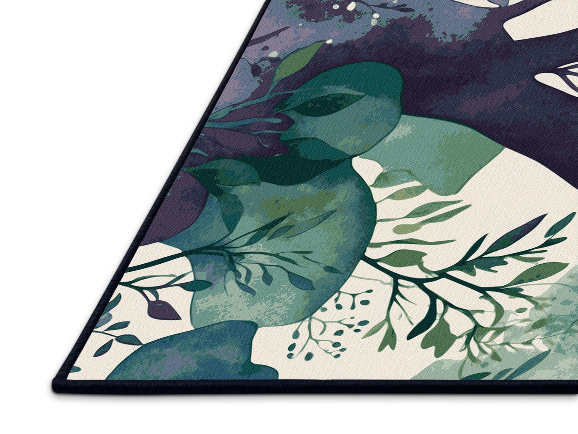 Celestial Woods from the Mystic Grove collection captures the tranquil essence of lush forest canopies with its stunning DarkSlateGray or DarkSlateGrey color (A dark and muted gray with strong green undertones.), a calming tone in the Gray color family. Inspired by flourishing greenery and woodland shadows, this rug features intricate leaf patterns, organic shapes, and layered designs that evoke depth and elegance. Finished with Navy serging a durable edge that enhances its artisanal look this rug is crafted from premium polyester and machine-made in the USA with imported materials. Perfect for creating a serene retreat in living rooms, calming bedrooms, or artistic reading corners, this design brings a harmonious blend of nature and refinement to your space. Available in multiple sizes, the Mystic Grove collection transforms your home into a tranquil haven, offering timeless beauty and versatile style for modern or nature-inspired interiors.