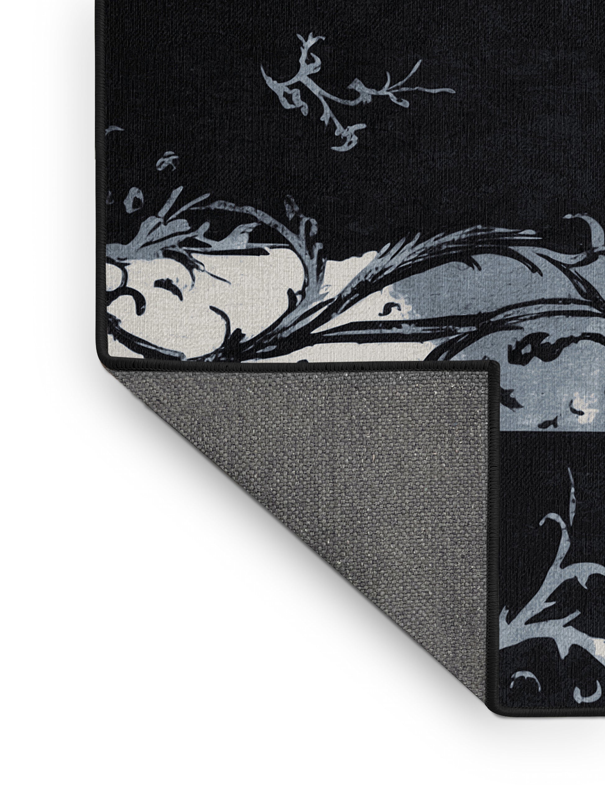Charcoal Garden from the Nocturne Elegance collection exudes timeless sophistication with its captivating Gunmetal color (A deep, metallic gray with hints of green and blue.), a rich tone in the Gray color family. Featuring intricate baroque-inspired patterns and swirling vine designs, this rug creates a sense of depth and refined elegance. Finished with Black serging a durable edge that enhances its luxurious aesthetic this rug is crafted from premium polyester and machine-made in the USA with imported materials. Perfect for formal dining rooms, chic living areas, or cozy bedrooms, this design balances bold drama with subtle charm, complementing both contemporary and traditional interiors. Available in multiple sizes, the Nocturne Elegance collection transforms your home into a haven of understated grandeur and classic refinement.