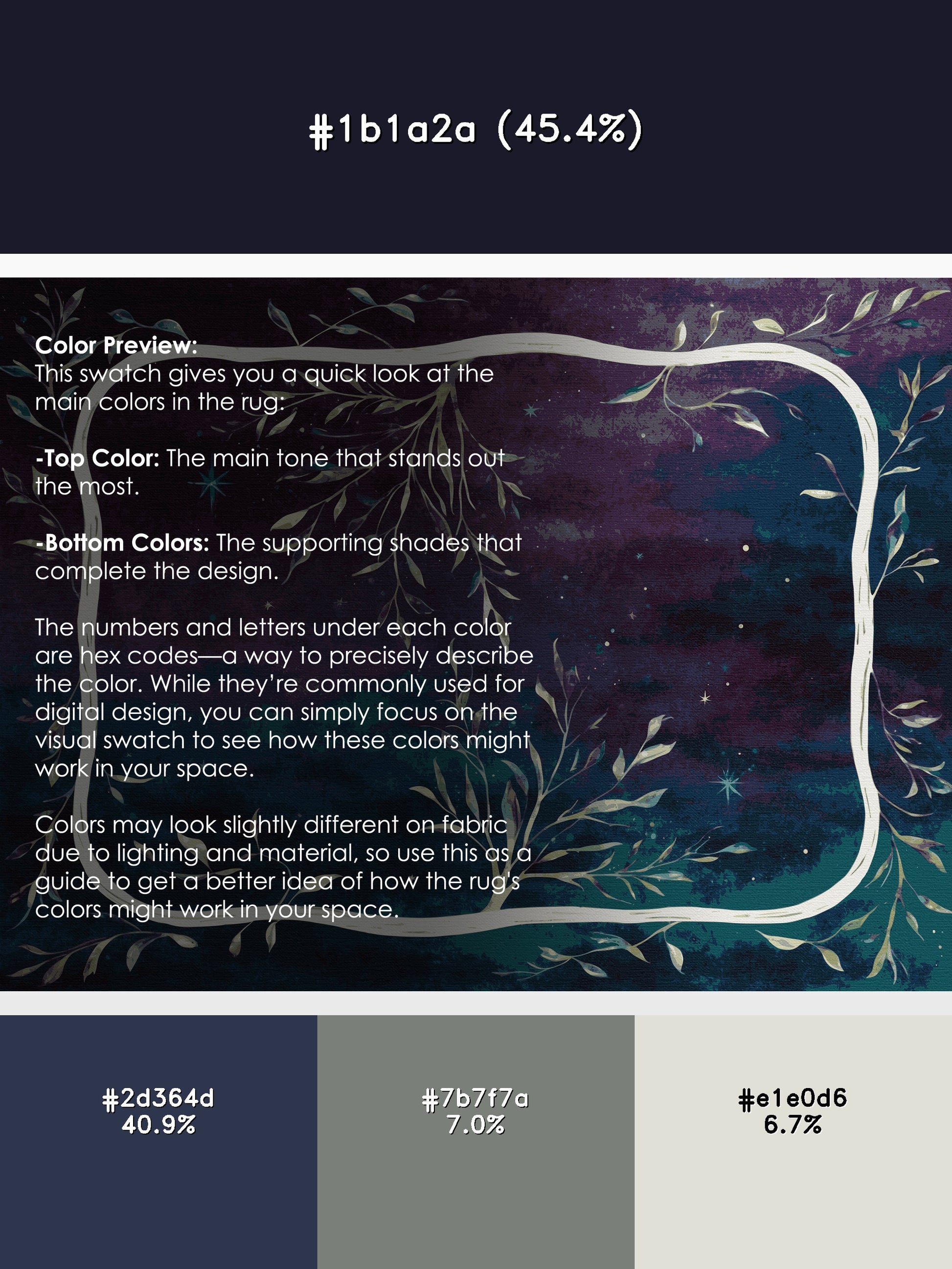 Cosmic Bloom from the Mystic Grove collection captures the tranquil essence of lush forest canopies with its stunning Purple Navy color (A dark purple with strong navy undertones, sophisticated and deep.), a calming tone in the Purple color family. Inspired by flourishing greenery and woodland shadows, this rug features intricate leaf patterns, organic shapes, and layered designs that evoke depth and elegance. Finished with Navy serging a durable edge that enhances its artisanal look this rug is crafted from premium polyester and machine-made in the USA with imported materials. Perfect for creating a serene retreat in living rooms, calming bedrooms, or artistic reading corners, this design brings a harmonious blend of nature and refinement to your space. Available in multiple sizes, the Mystic Grove collection transforms your home into a tranquil haven, offering timeless beauty and versatile style for modern or nature-inspired interiors.