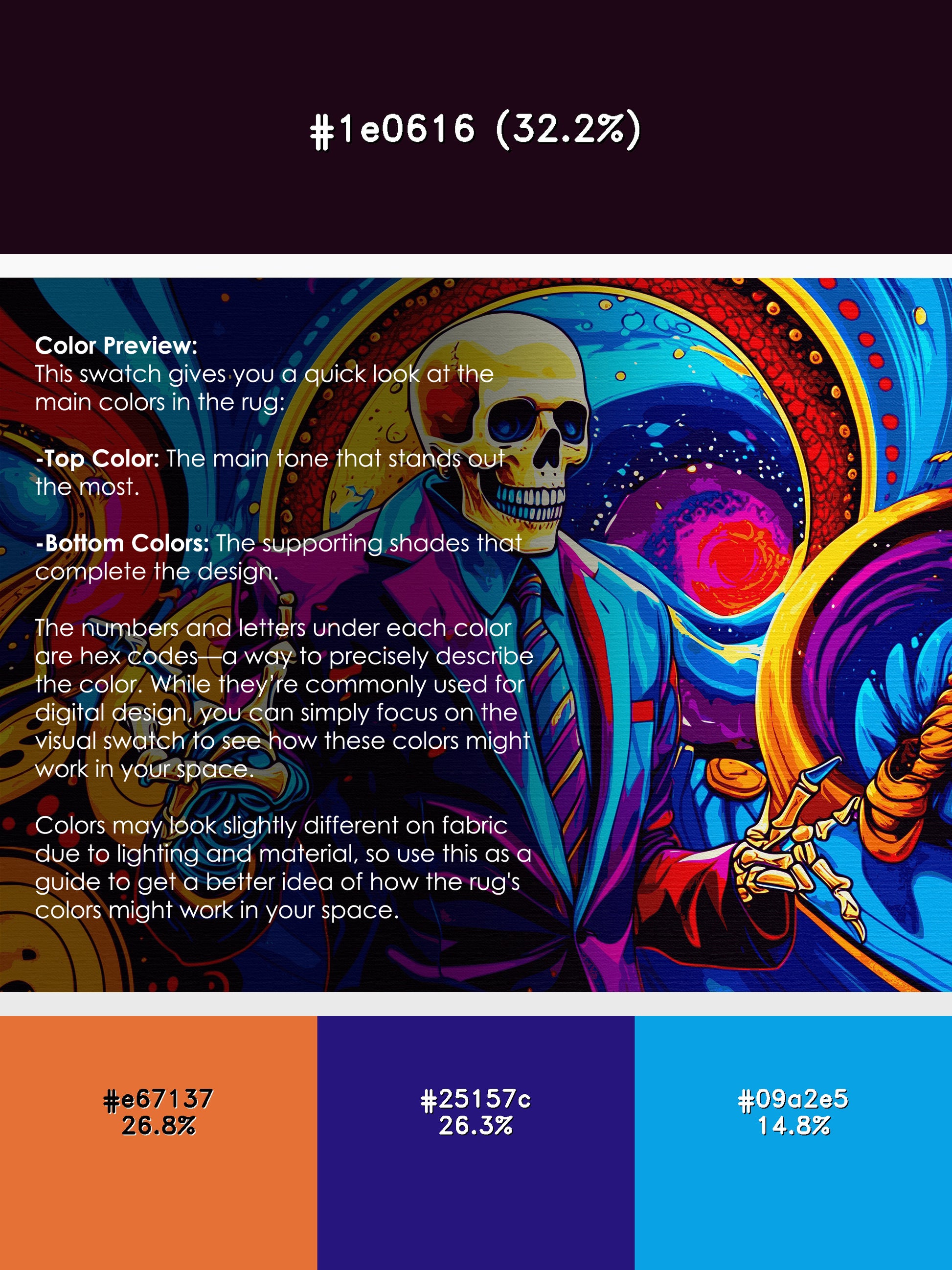 Cosmic Resonance from the Psychedelia Peaks collection radiates vibrant energy with its bold Purple Iris color (A rich and elegant purple inspired by iris flowers.), a striking tone in the Purple color family. Featuring swirling, kaleidoscopic patterns and electrifying neon hues inspired by the psychedelic art movement, this rug brings a sense of dynamic motion and artistic expression to your space. Finished with Navy serging a durable edge that enhances its playful and vibrant aesthetic this rug is crafted from premium polyester and machine-made in the USA with imported materials. Perfect for eclectic living rooms, retro-inspired spaces, or creative studios, this design transforms any room into a lively haven of individuality and boldness. Available in multiple sizes, the Psychedelia Peaks collection adds a dramatic, colorful statement to your decor, turning your home into a canvas of unrestrained creativity.
