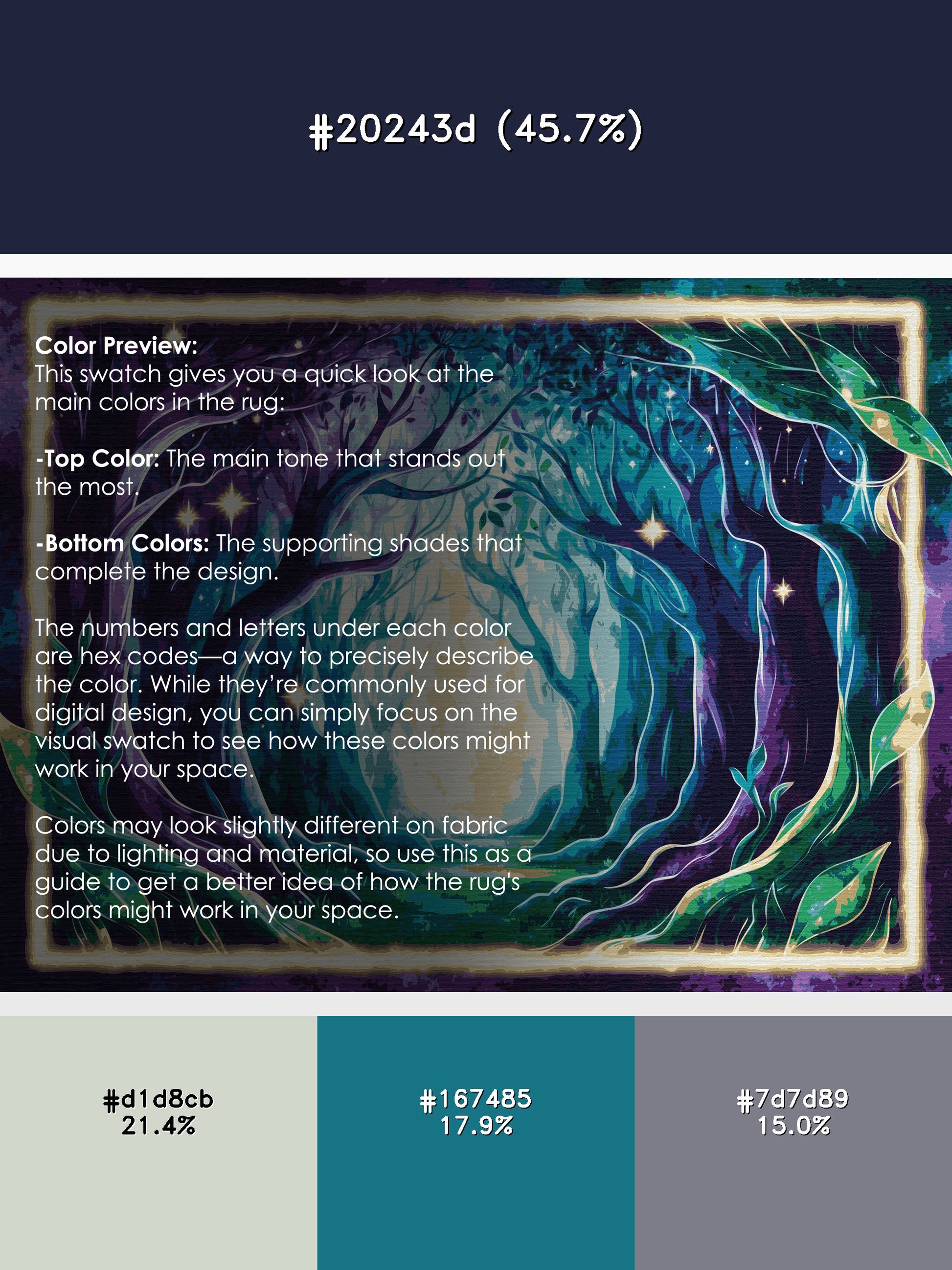 Cosmic Sprouts from the Mystic Grove collection captures the tranquil essence of lush forest canopies with its stunning Purple Navy color (A dark purple with strong navy undertones, sophisticated and deep.), a calming tone in the Purple color family. Inspired by flourishing greenery and woodland shadows, this rug features intricate leaf patterns, organic shapes, and layered designs that evoke depth and elegance. Finished with Navy serging a durable edge that enhances its artisanal look this rug is crafted from premium polyester and machine-made in the USA with imported materials. Perfect for creating a serene retreat in living rooms, calming bedrooms, or artistic reading corners, this design brings a harmonious blend of nature and refinement to your space. Available in multiple sizes, the Mystic Grove collection transforms your home into a tranquil haven, offering timeless beauty and versatile style for modern or nature-inspired interiors.
