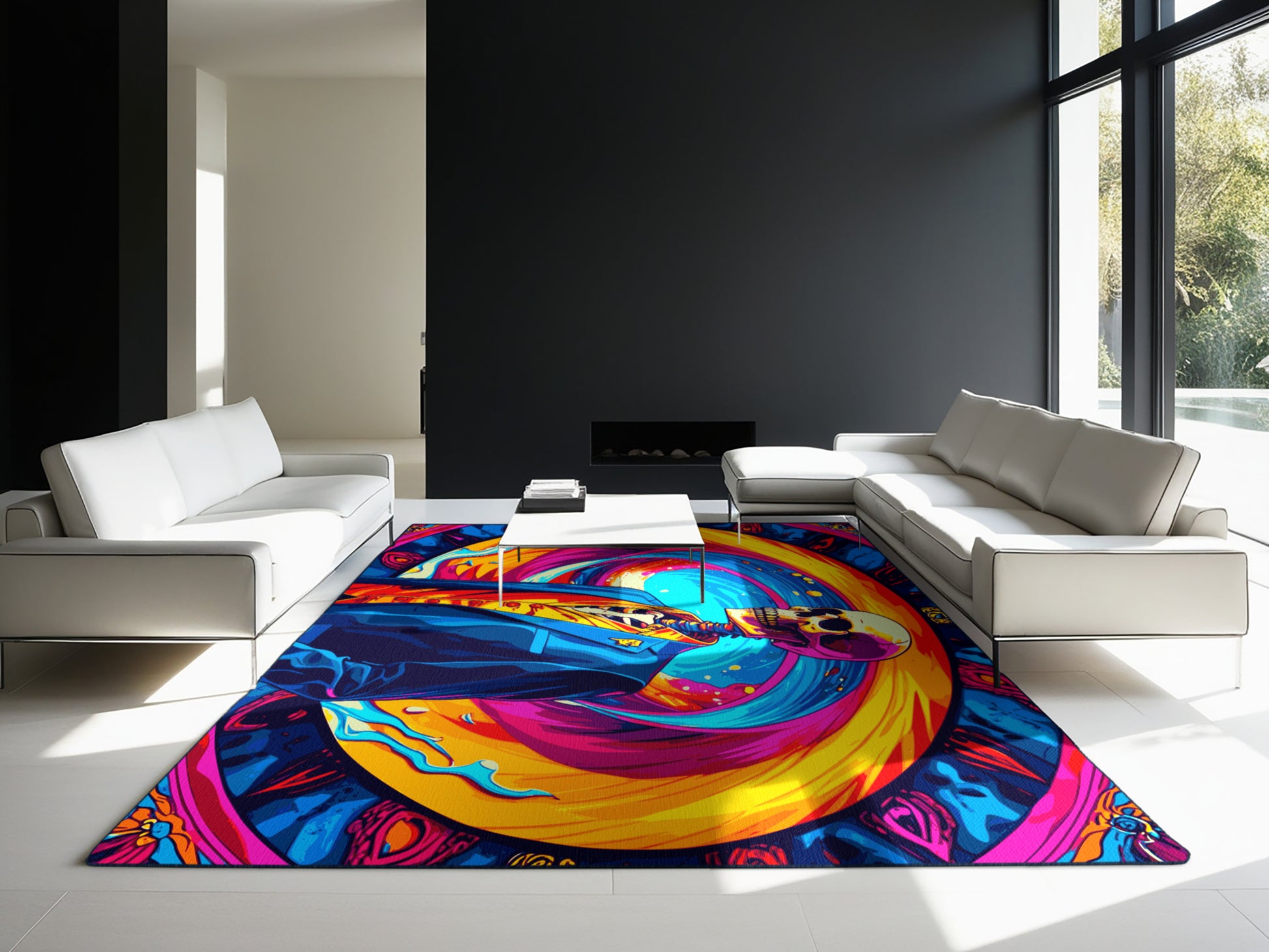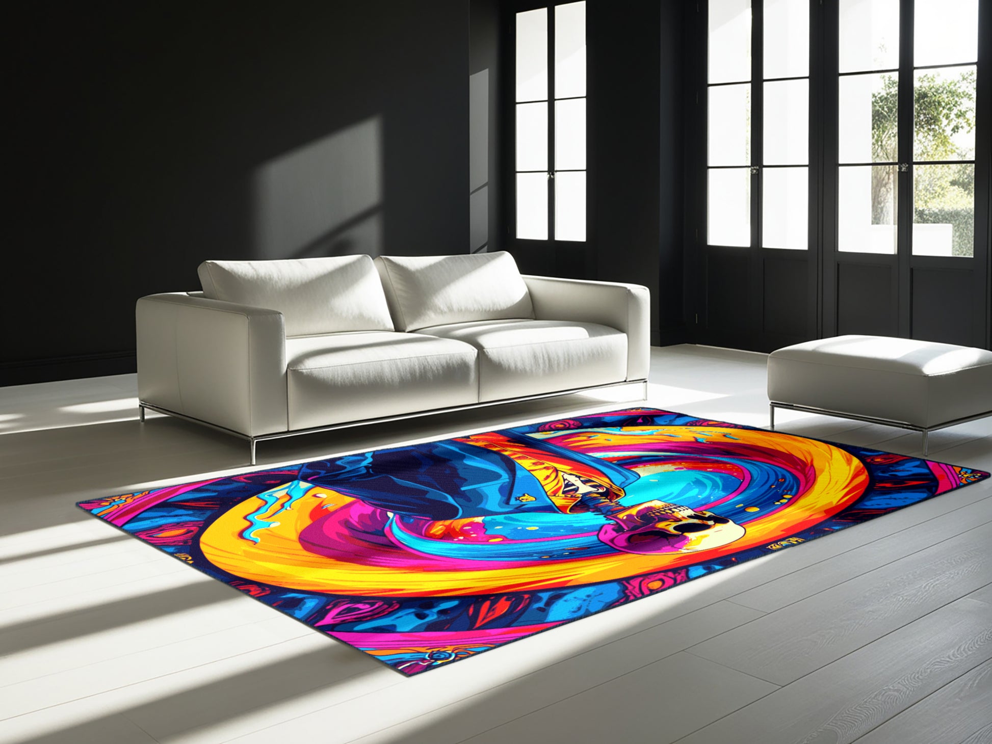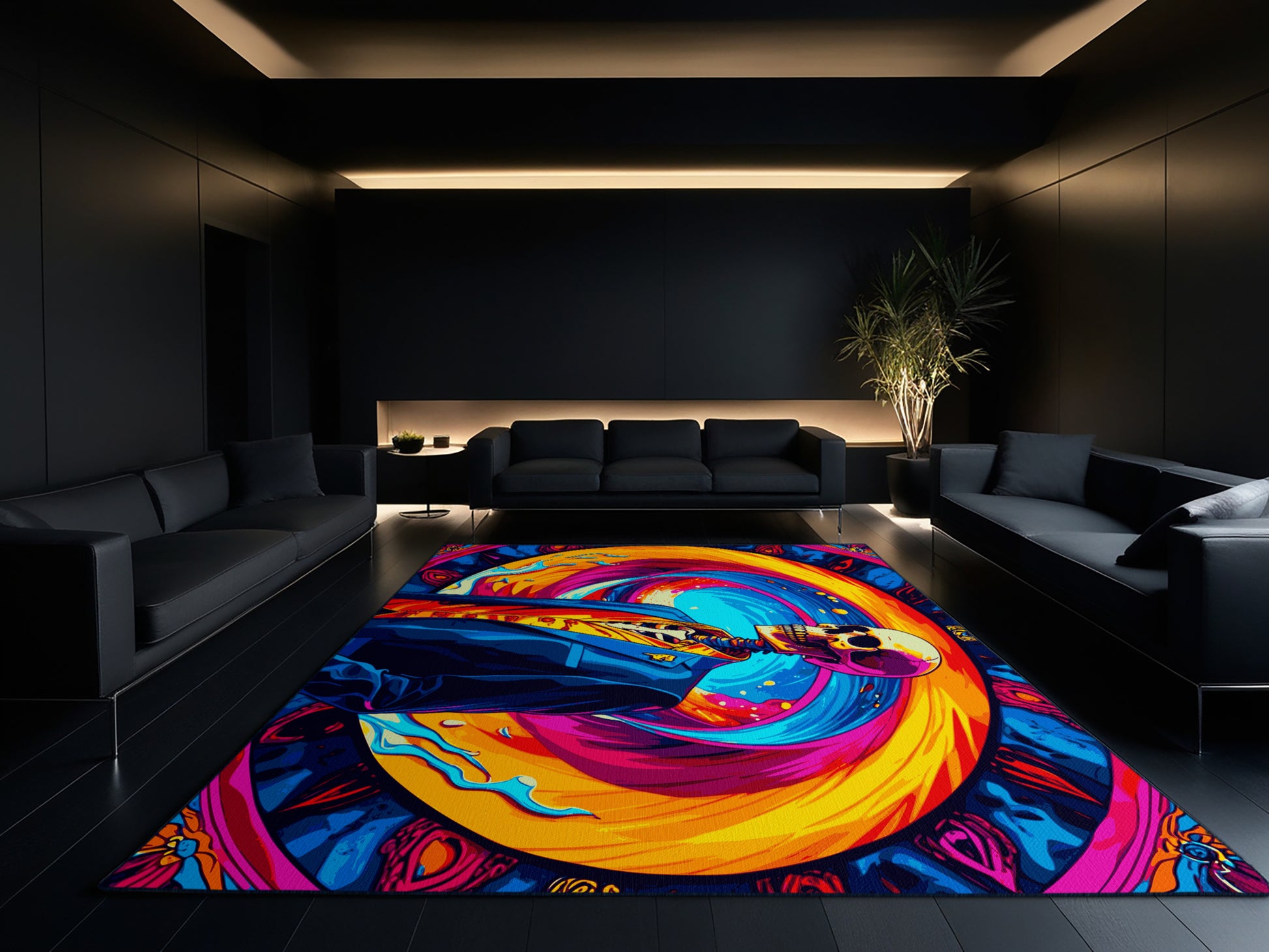 Cosmic Twist from the Psychedelia Peaks collection radiates vibrant energy with its bold Blue Whale color (A dark blue with soft purple undertones, deep and elegant.), a striking tone in the Blue color family. Featuring swirling, kaleidoscopic patterns and electrifying neon hues inspired by the psychedelic art movement, this rug brings a sense of dynamic motion and artistic expression to your space. Finished with Navy serging a durable edge that enhances its playful and vibrant aesthetic this rug is crafted from premium polyester and machine-made in the USA with imported materials. Perfect for eclectic living rooms, retro-inspired spaces, or creative studios, this design transforms any room into a lively haven of individuality and boldness. Available in multiple sizes, the Psychedelia Peaks collection adds a dramatic, colorful statement to your decor, turning your home into a canvas of unrestrained creativity.