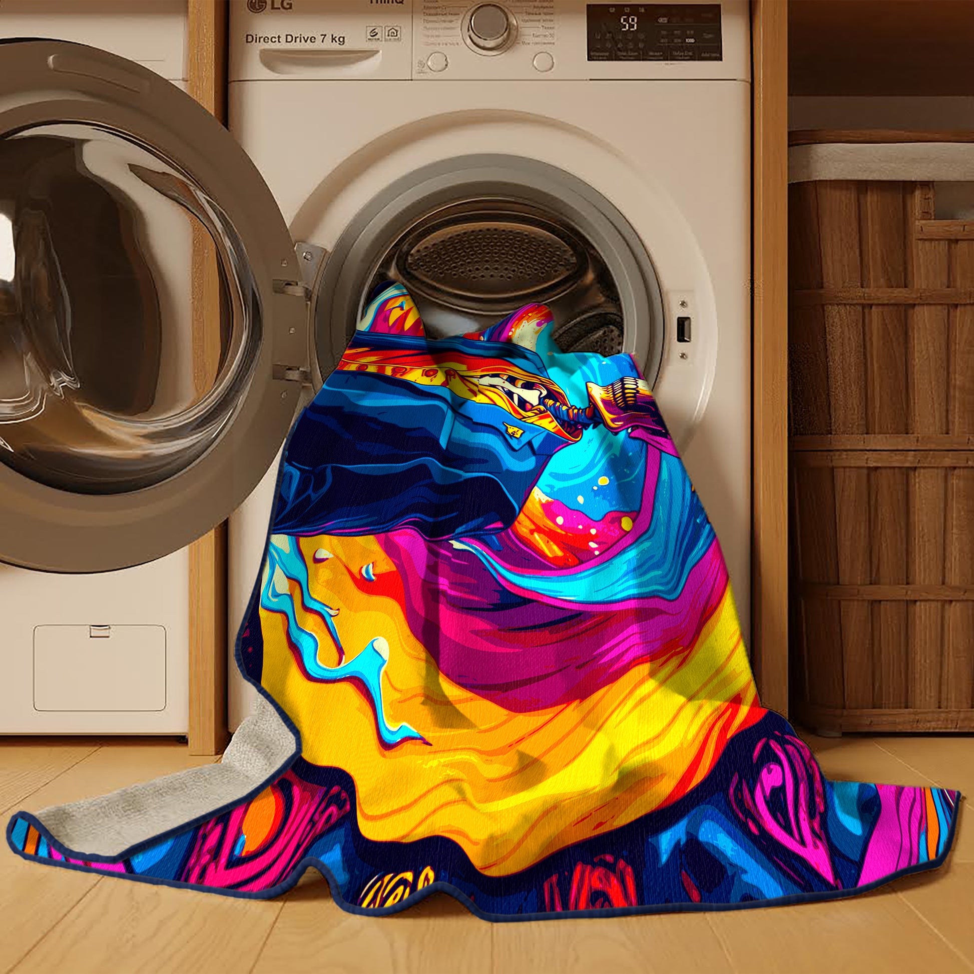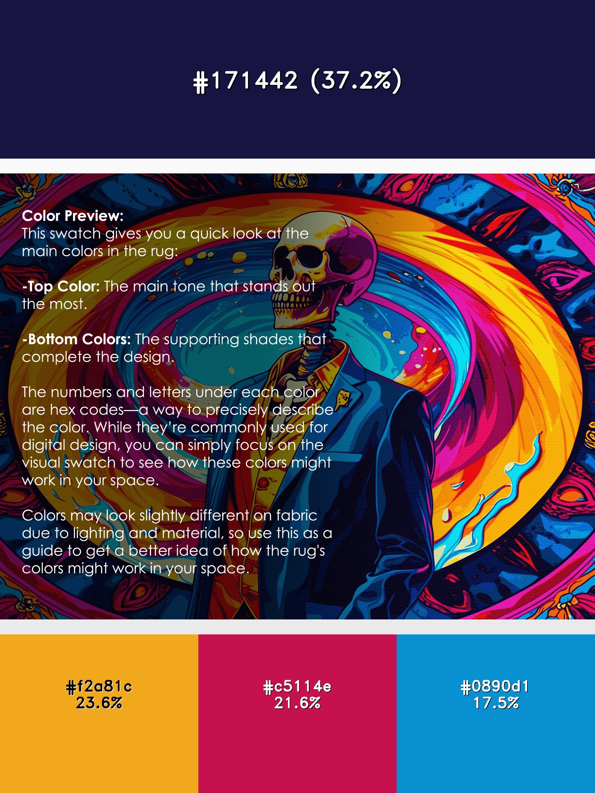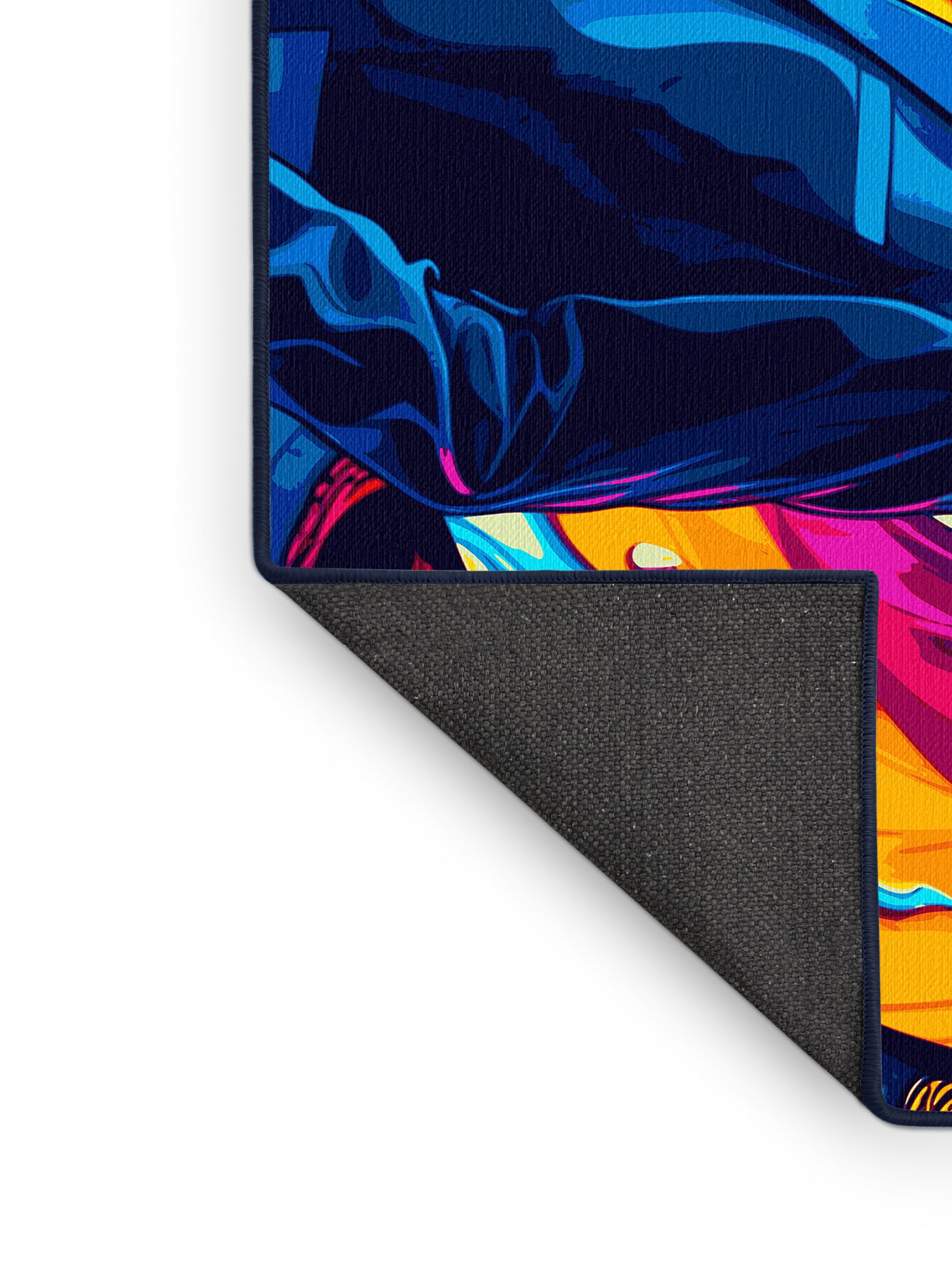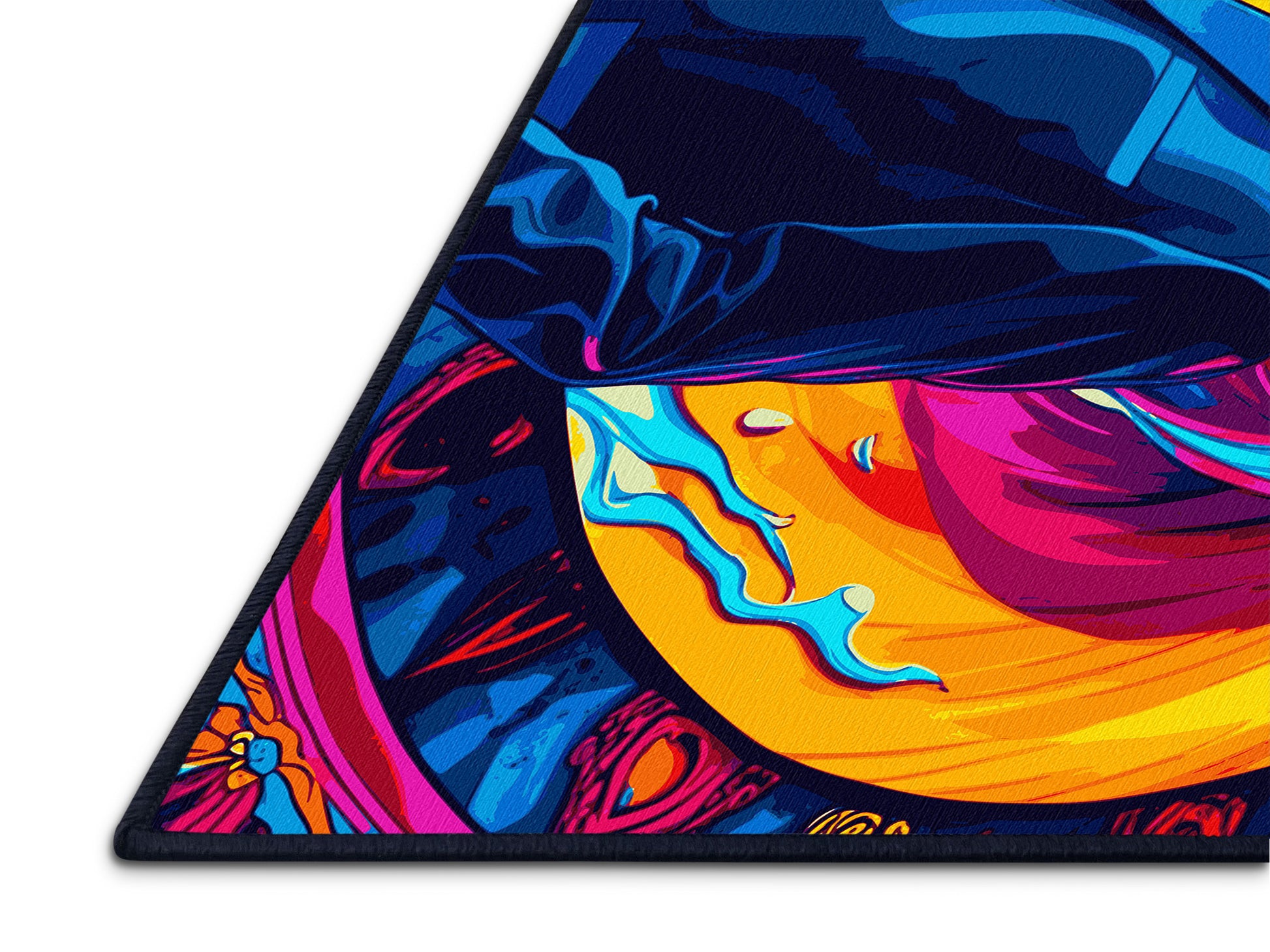Cosmic Twist from the Psychedelia Peaks collection radiates vibrant energy with its bold Blue Whale color (A dark blue with soft purple undertones, deep and elegant.), a striking tone in the Blue color family. Featuring swirling, kaleidoscopic patterns and electrifying neon hues inspired by the psychedelic art movement, this rug brings a sense of dynamic motion and artistic expression to your space. Finished with Navy serging a durable edge that enhances its playful and vibrant aesthetic this rug is crafted from premium polyester and machine-made in the USA with imported materials. Perfect for eclectic living rooms, retro-inspired spaces, or creative studios, this design transforms any room into a lively haven of individuality and boldness. Available in multiple sizes, the Psychedelia Peaks collection adds a dramatic, colorful statement to your decor, turning your home into a canvas of unrestrained creativity.