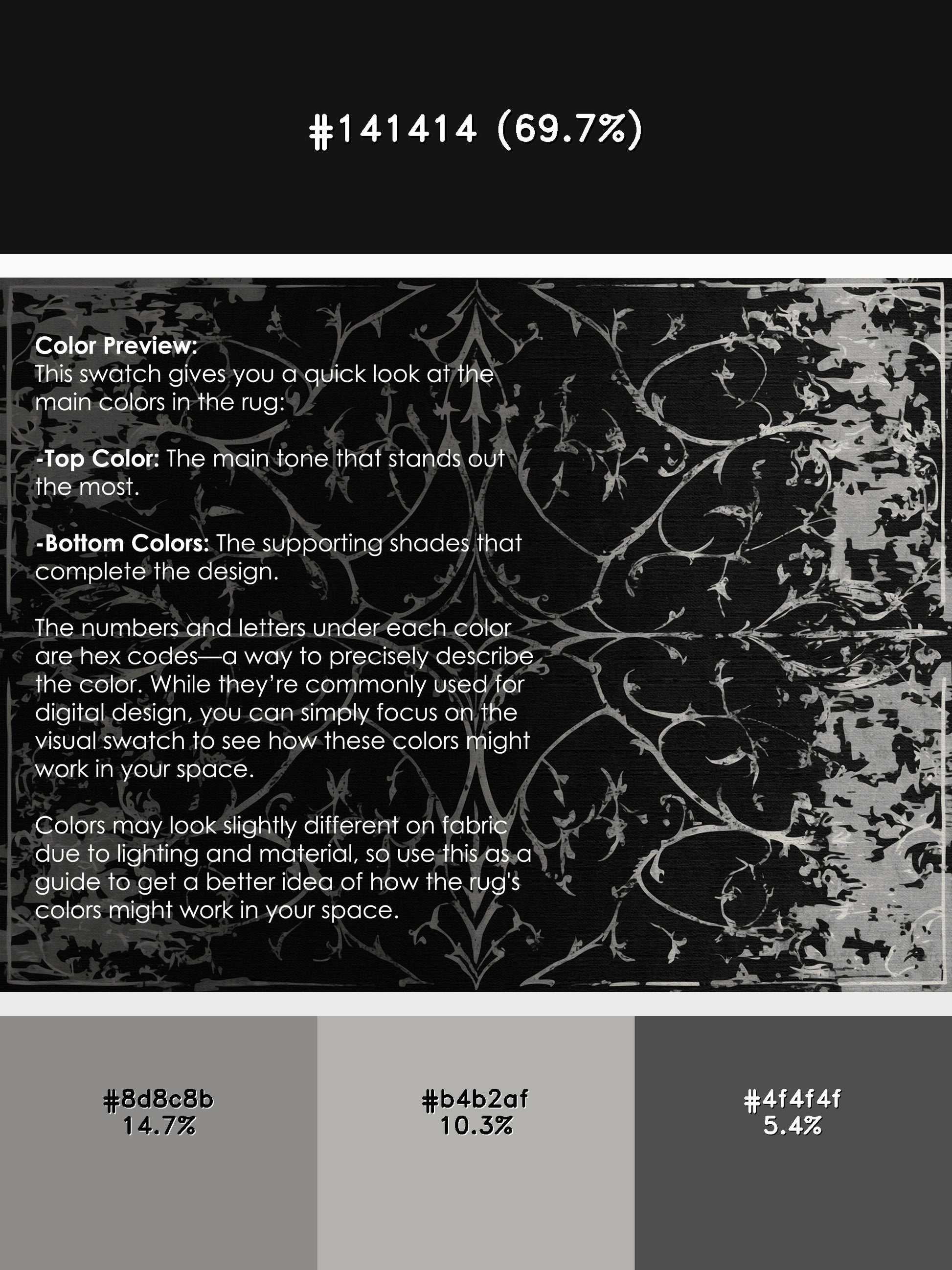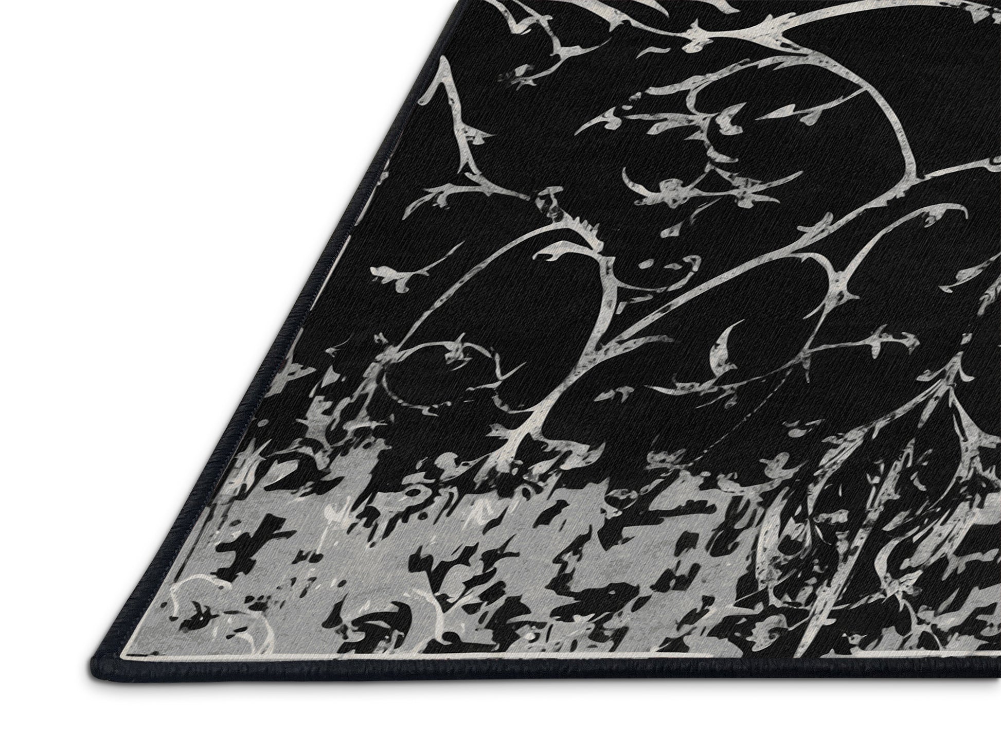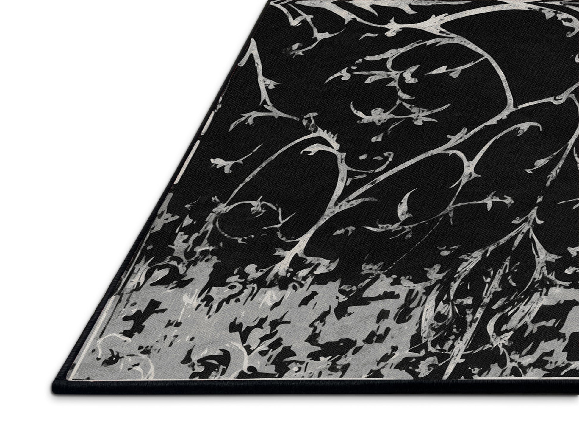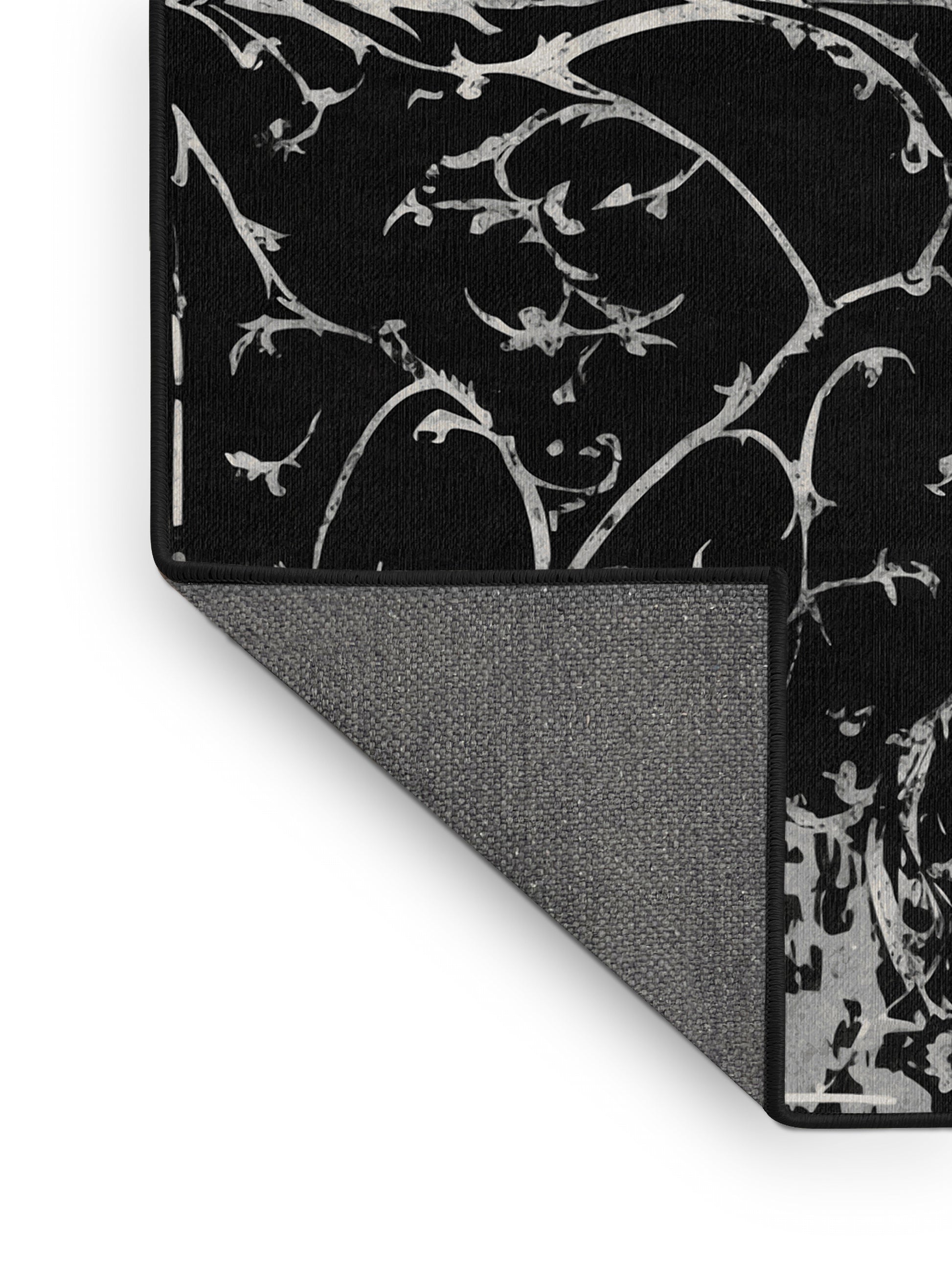 Crescent Charm from the Nocturne Elegance collection exudes timeless sophistication with its captivating Gunmetal color (A deep, metallic gray with hints of green and blue.), a rich tone in the Gray color family. Featuring intricate baroque-inspired patterns and swirling vine designs, this rug creates a sense of depth and refined elegance. Finished with Black serging a durable edge that enhances its luxurious aesthetic this rug is crafted from premium polyester and machine-made in the USA with imported materials. Perfect for formal dining rooms, chic living areas, or cozy bedrooms, this design balances bold drama with subtle charm, complementing both contemporary and traditional interiors. Available in multiple sizes, the Nocturne Elegance collection transforms your home into a haven of understated grandeur and classic refinement.