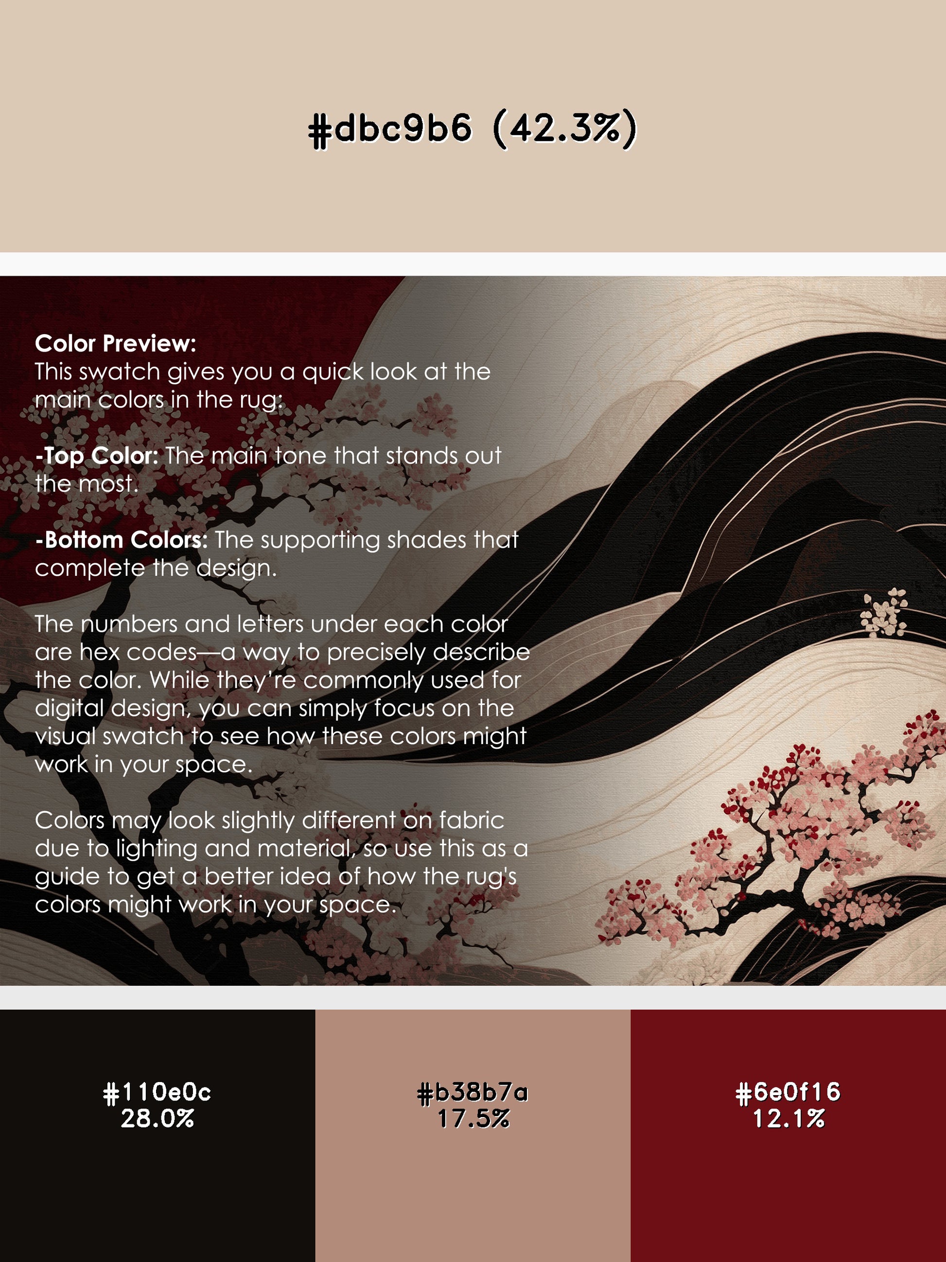 Dawn Bloom from the Sakura Waves collection captures the timeless elegance of Japanese artistry with its captivating Desert Sand color (A muted beige with warm, sandy undertones.), a refined tone in the Beige color family. Featuring delicate cherry blossom motifs and flowing wave-inspired patterns, this rug evokes the serene beauty of nature and the transient charm of sakura in bloom. Finished with Beige serging a durable edge that enhances its artistic appeal this rug is crafted from premium polyester and machine-made in the USA with imported materials. Perfect for minimalist living rooms, tranquil bedrooms, or zen-inspired spaces, this design blends cultural sophistication with modern functionality. Available in multiple sizes, the Sakura Waves collection transforms your home into a serene retreat, balancing artistic expression and versatile style seamlessly.