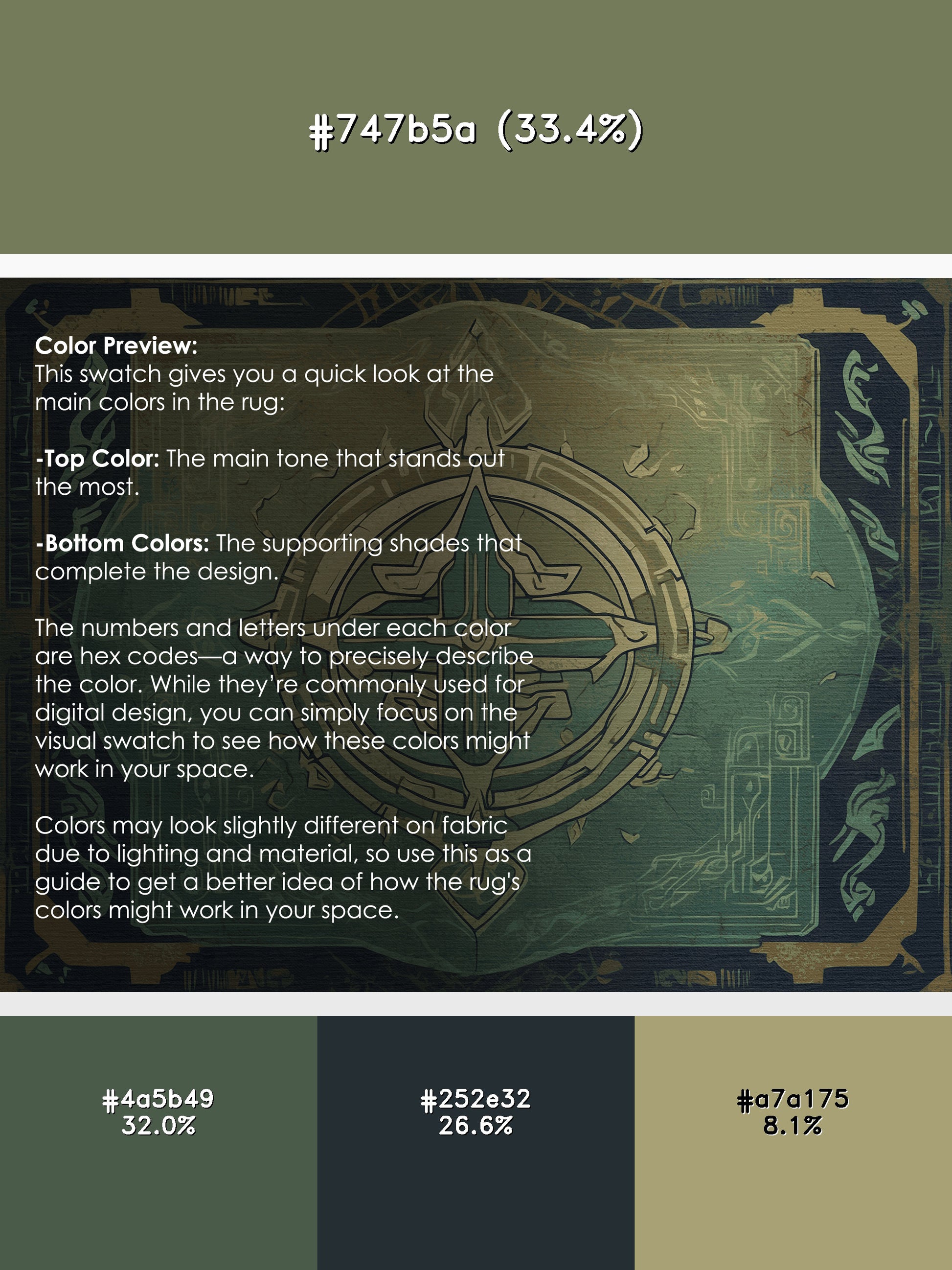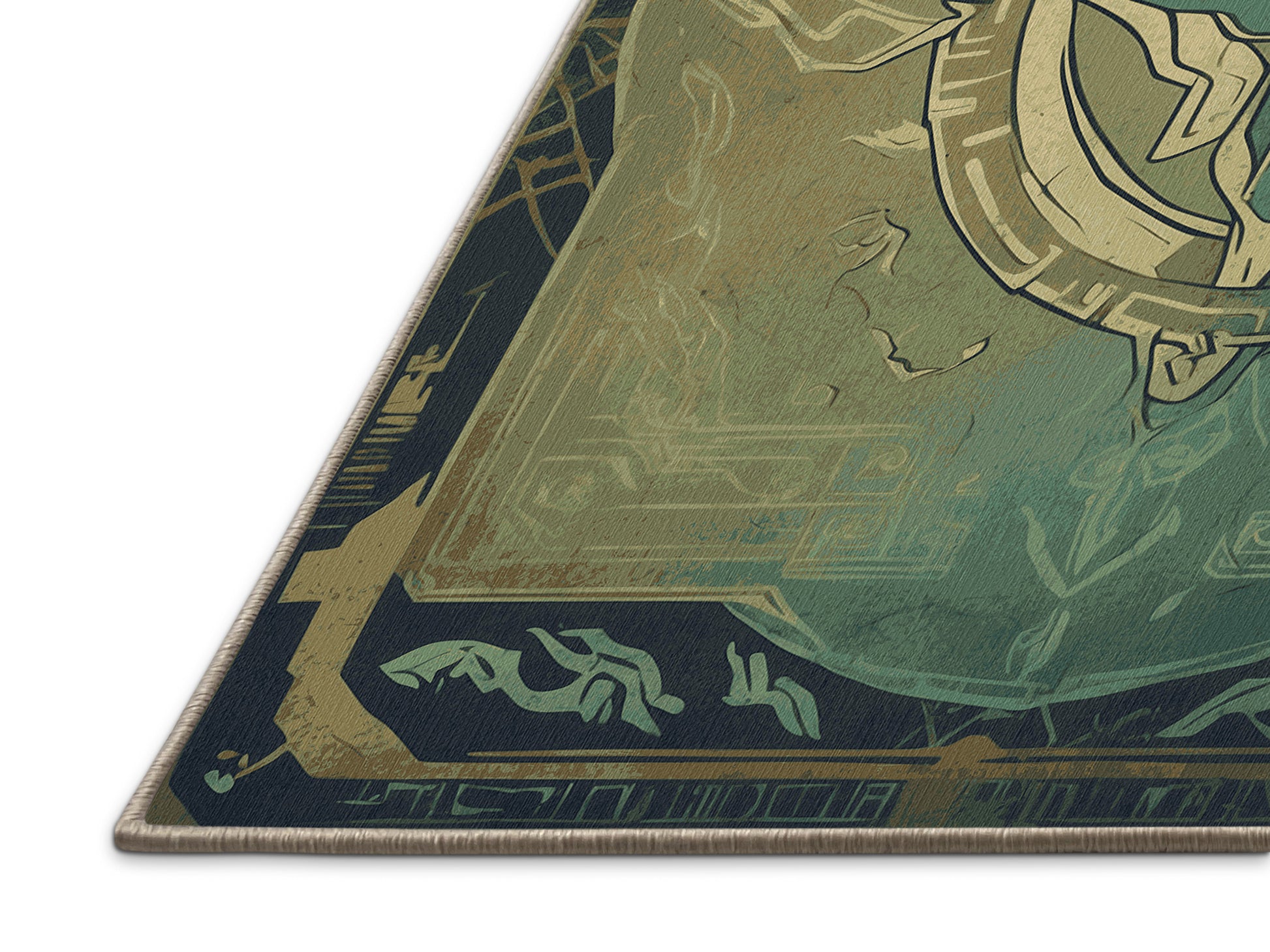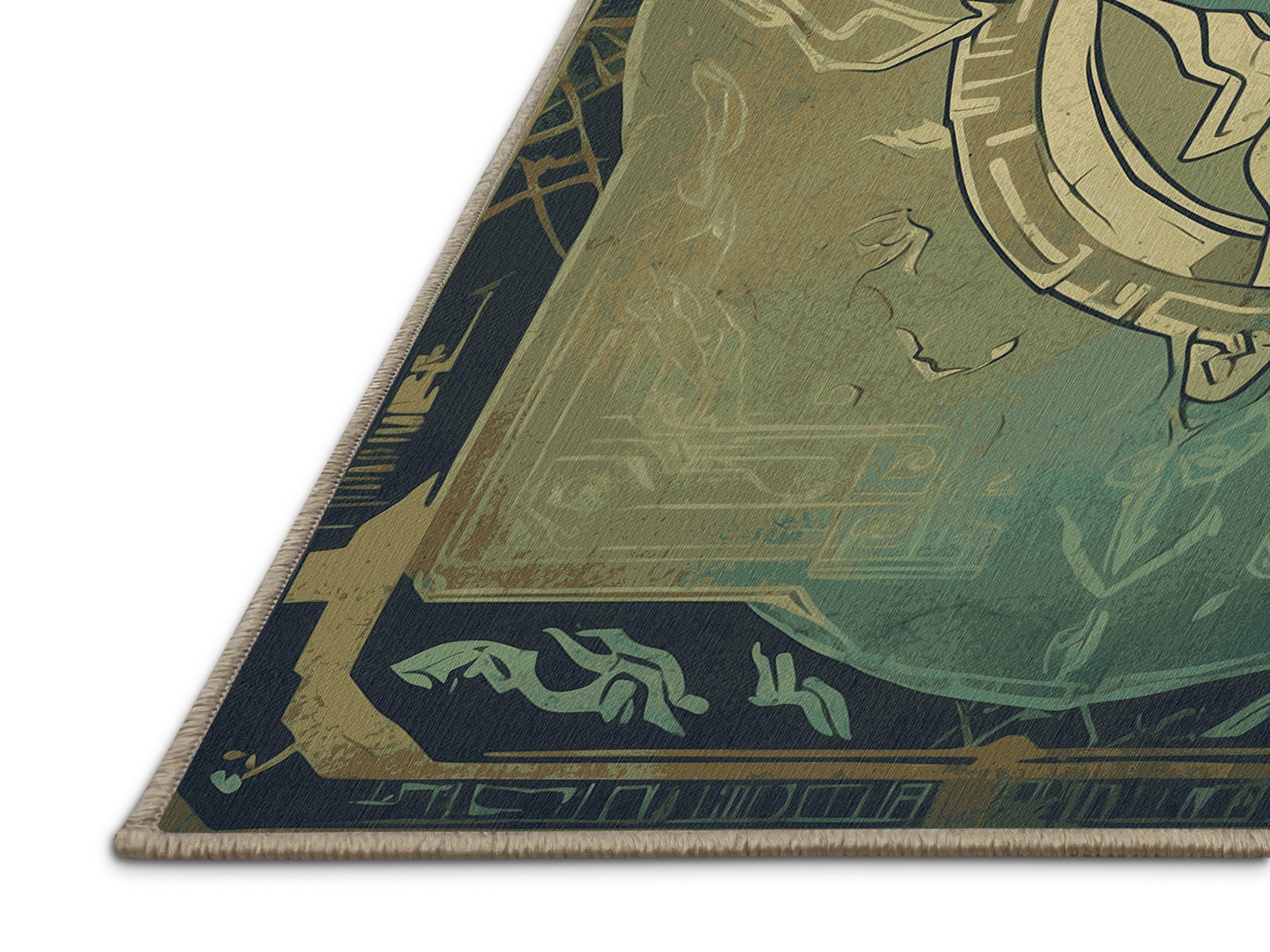 Divine Compass from the Hero's Path collection takes you on an epic journey of adventure and timeless wonder with its captivating Khaki Green color (A muted green with khaki-inspired tones, versatile and natural.), a bold tone in the Green color family. Inspired by mythical quests and heroic landscapes, this rug features intricate symbols and dynamic designs that evoke a sense of exploration and creativity. Finished with Beige serging a durable stitched edge that prevents fraying and enhances its artistic appeal this rug is crafted from premium polyester and machine-made in the USA with imported materials. Perfect for creating a bold statement in living rooms, inspiring creativity in home offices, or elevating entertainment areas, this design combines fantasy, elegance, and practicality. Available in multiple sizes, the Hero's Path collection transforms your space into a realm of imagination and discovery with its adventurous spirit and artistic flair.