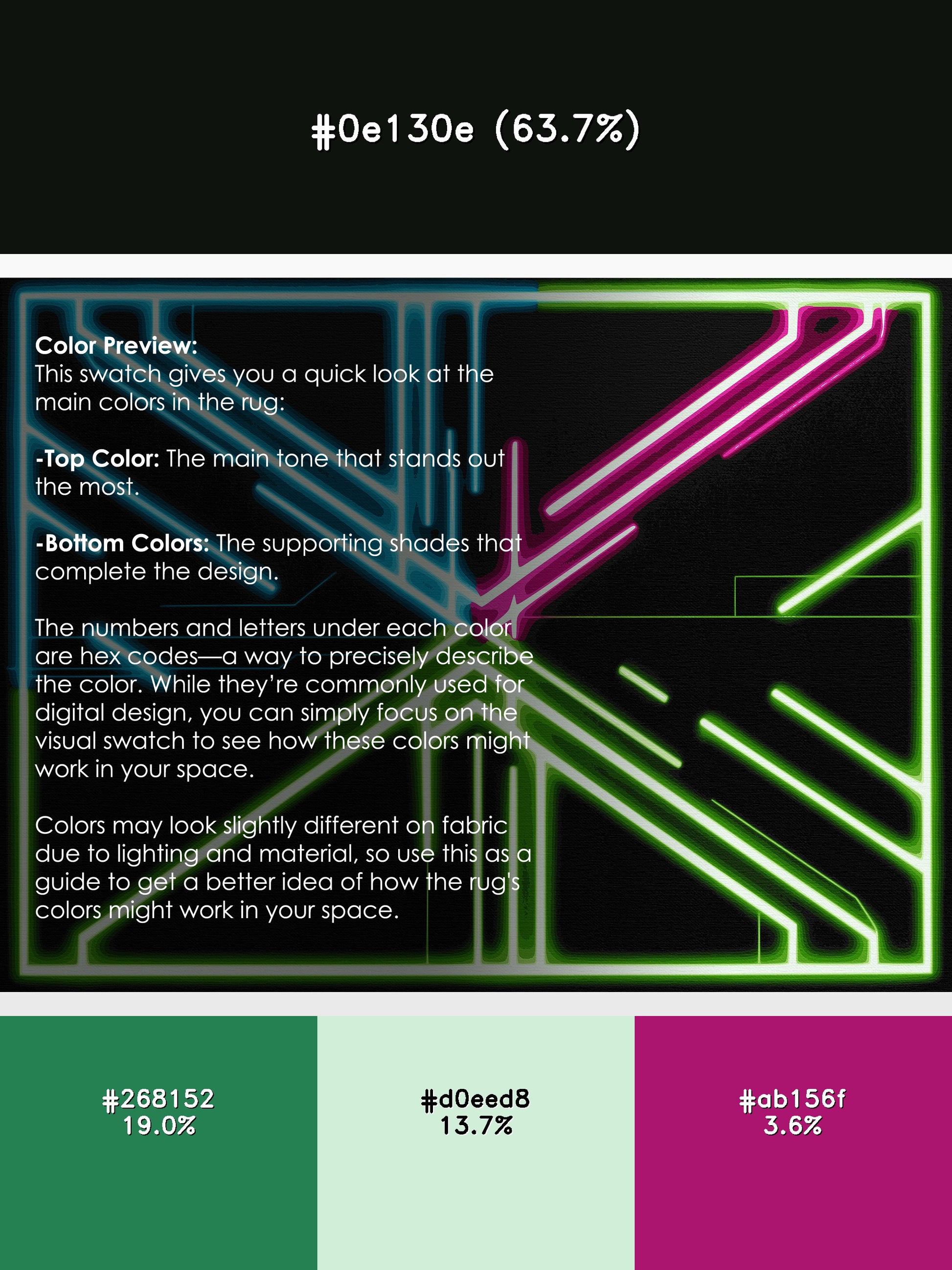 Dusk Fusion from the Neon Nexus collection electrifies your space with its bold Grayish Turquoise color (A soft turquoise with gray undertones, cool and calming.), a striking tone in the Green color family. Inspired by neon-lit cityscapes and cyberpunk design, this rug features sharp geometric patterns and dynamic lines illuminated by vibrant, electric hues. Finished with Gray serging a sleek edge that enhances its futuristic appeal this rug is crafted from premium polyester and machine-made in the USA with imported materials. Perfect for modern gaming rooms, creative studios, or contemporary living spaces, this design balances cutting-edge energy with adaptable elegance. Available in multiple sizes, the Neon Nexus collection transforms any room into a bold statement of innovation and style, channeling the vibrant glow of a cyberpunk universe.