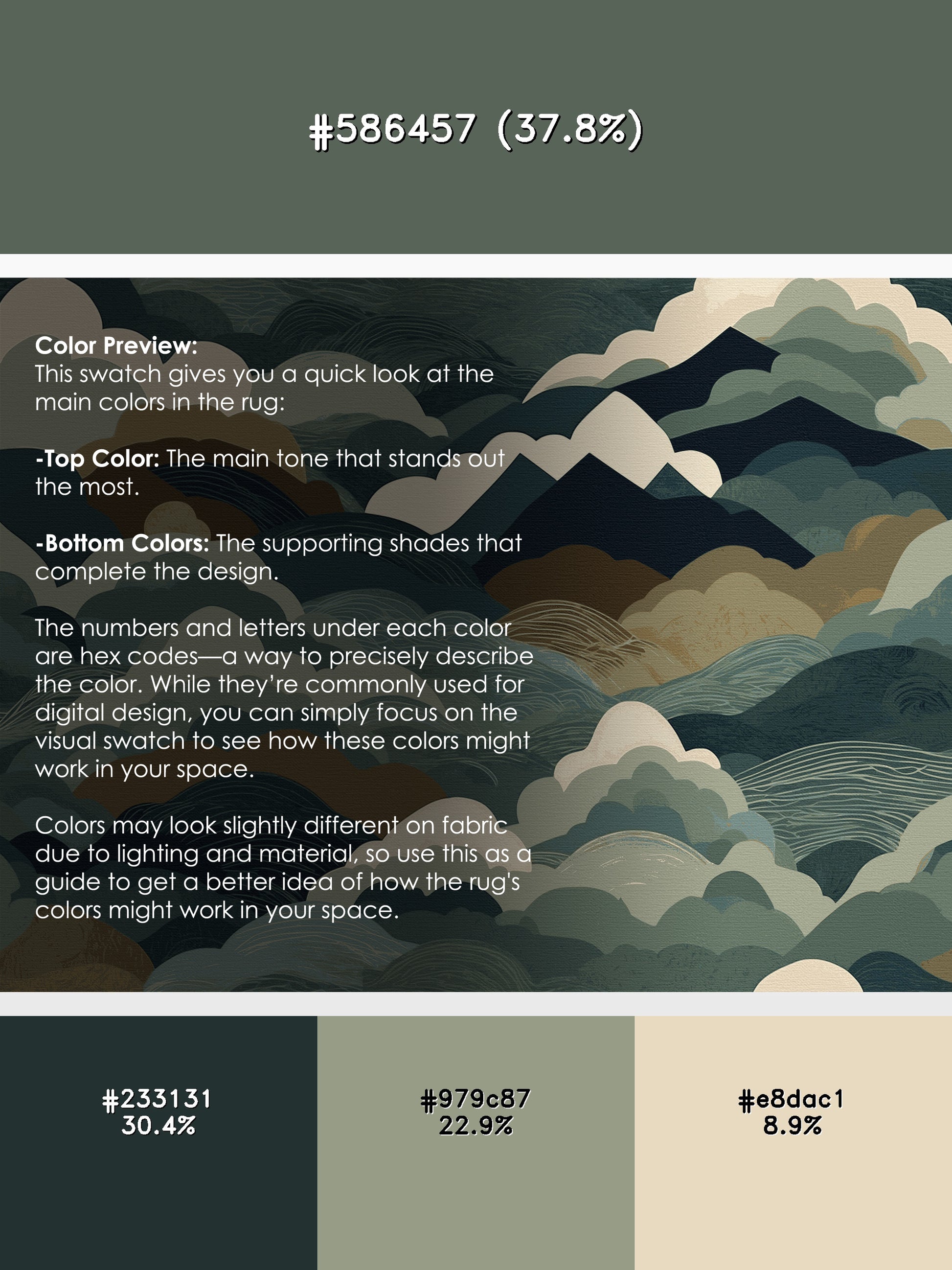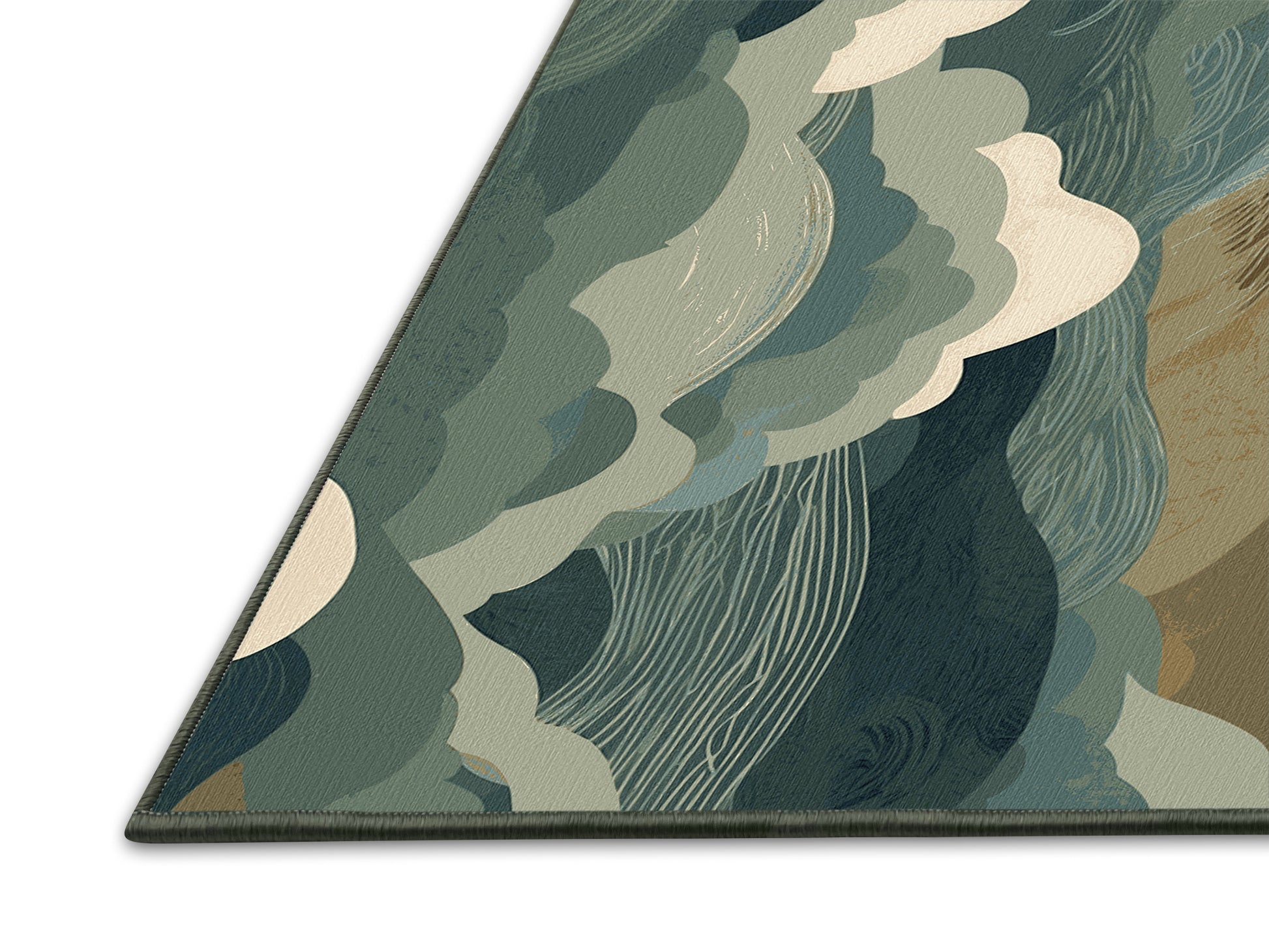 Dusk Glow from the Mystical Horizons collection captures the serene beauty of nature's fluidity with its captivating Camouflage Green color (A muted and earthy green, perfect for outdoor and natural themes.), a calming tone in the Green color family. Inspired by sweeping vistas and flowing patterns, this rug features abstract, organic designs that mimic the movement of wind, water, and rolling landscapes. Finished with SageGreen serging a durable edge that enhances its refined aesthetic this rug is crafted from premium polyester and machine-made in the USA with imported materials. Perfect for creating a tranquil atmosphere in modern living rooms, serene bedrooms, or stylish home offices, this design blends natural inspiration with sophisticated artistry. Available in multiple sizes, the Mystical Horizons collection transforms any space into a serene retreat, offering a harmonious balance of style and tranquility.