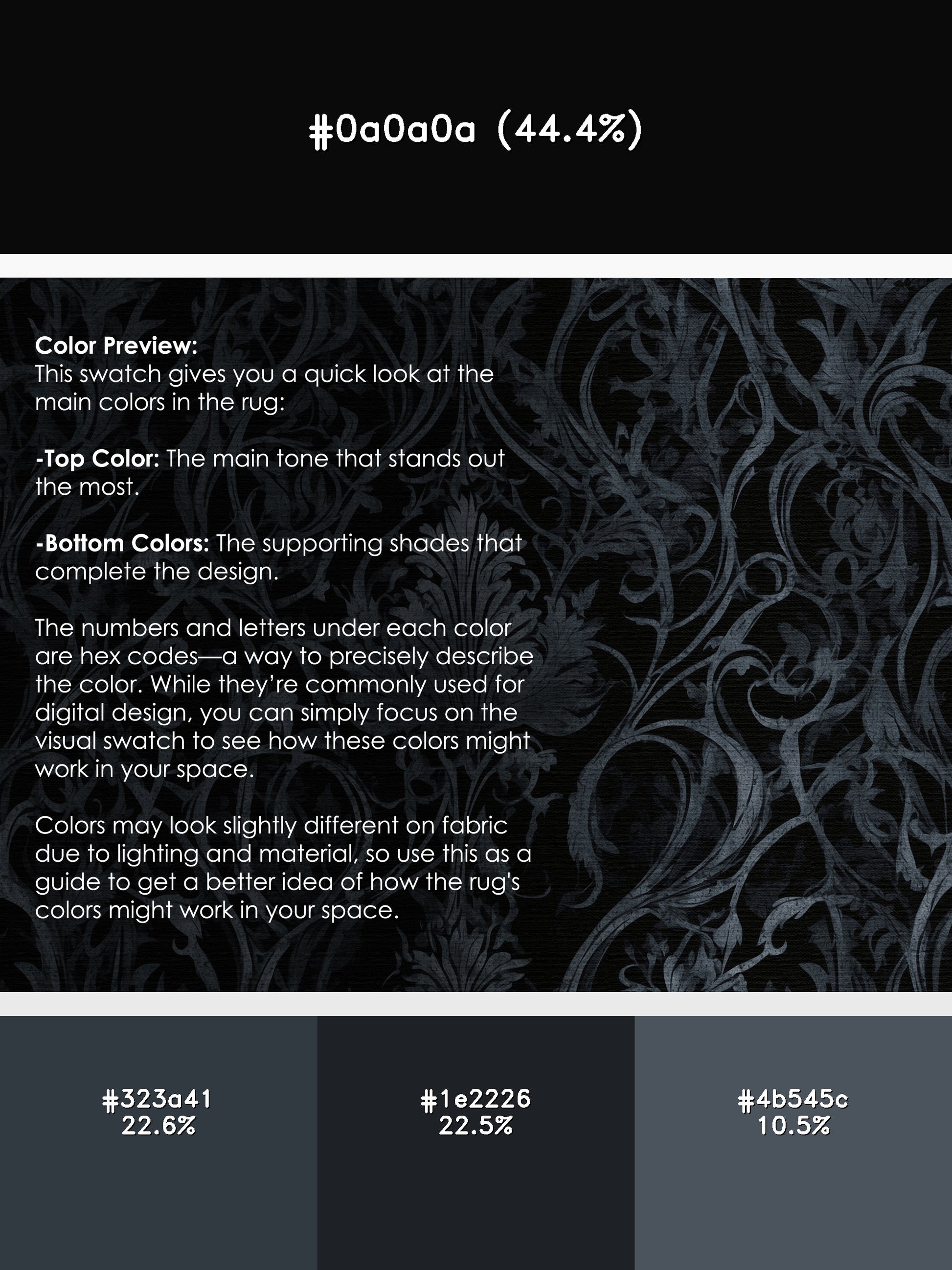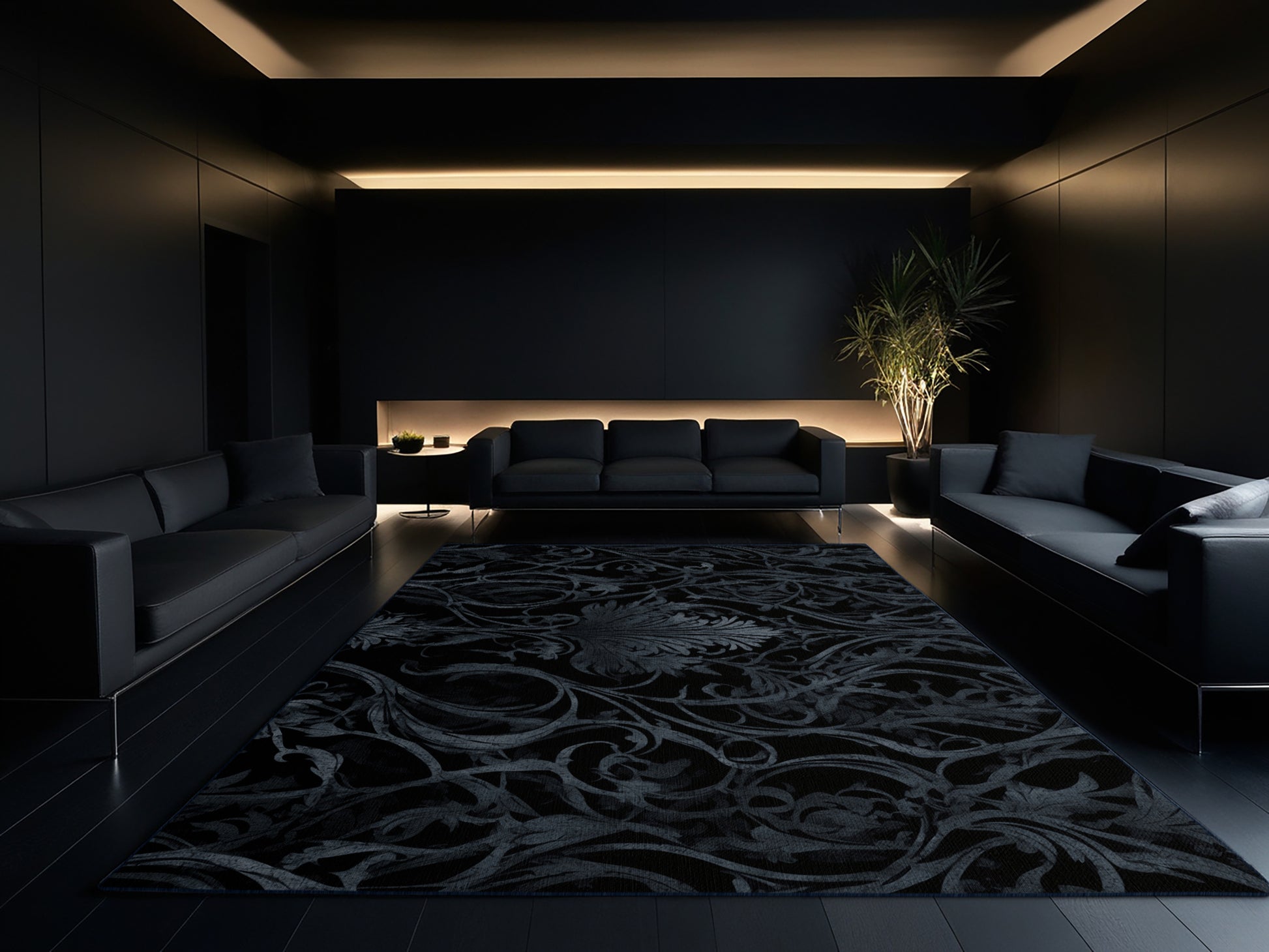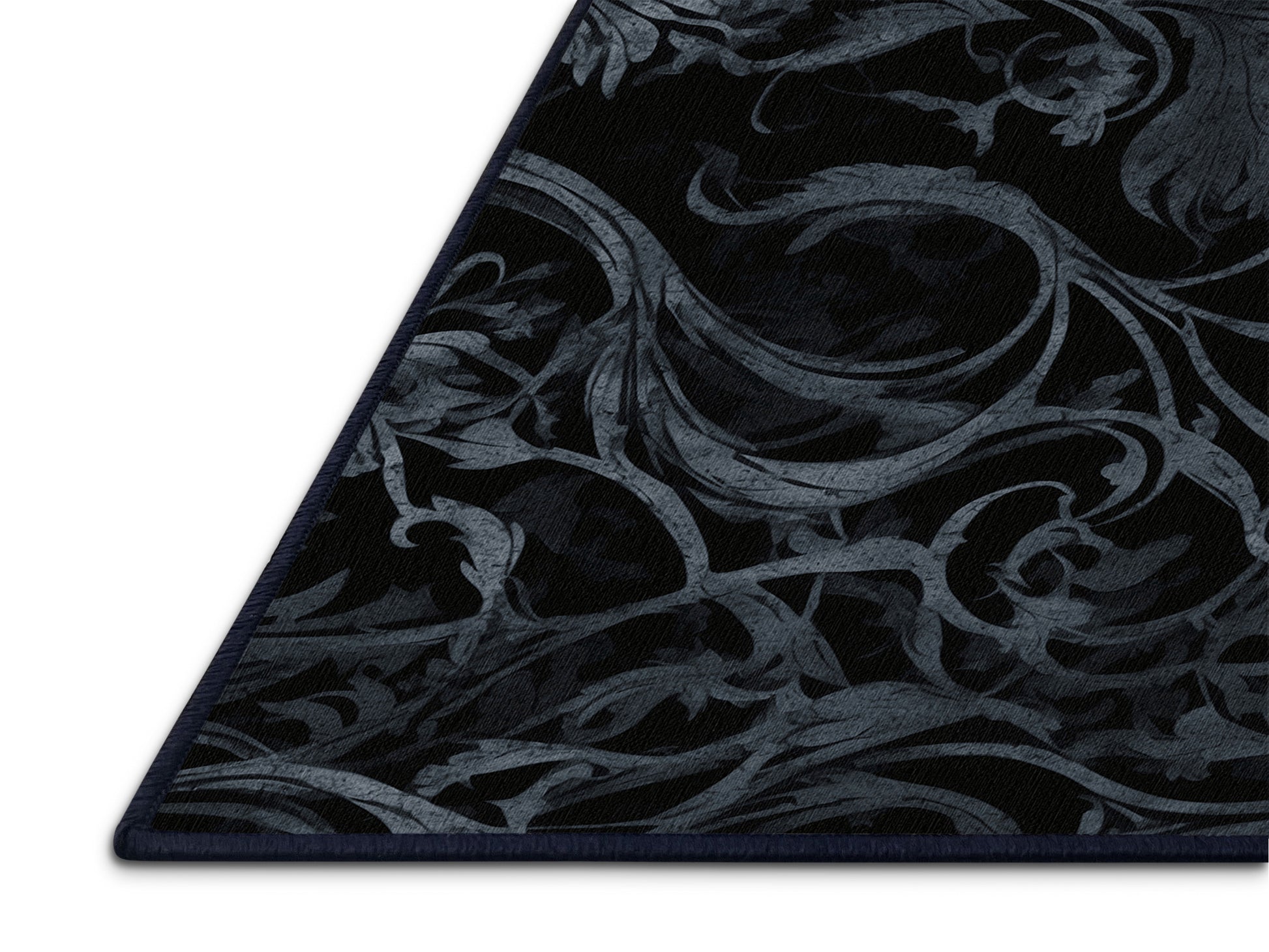 Dusken Veil from the Nocturne Elegance collection exudes timeless sophistication with its captivating Night color (A rich, dark black with a hint of depth, evoking the stillness of night.), a rich tone in the Black color family. Featuring intricate baroque-inspired patterns and swirling vine designs, this rug creates a sense of depth and refined elegance. Finished with Navy serging a durable edge that enhances its luxurious aesthetic this rug is crafted from premium polyester and machine-made in the USA with imported materials. Perfect for formal dining rooms, chic living areas, or cozy bedrooms, this design balances bold drama with subtle charm, complementing both contemporary and traditional interiors. Available in multiple sizes, the Nocturne Elegance collection transforms your home into a haven of understated grandeur and classic refinement.
