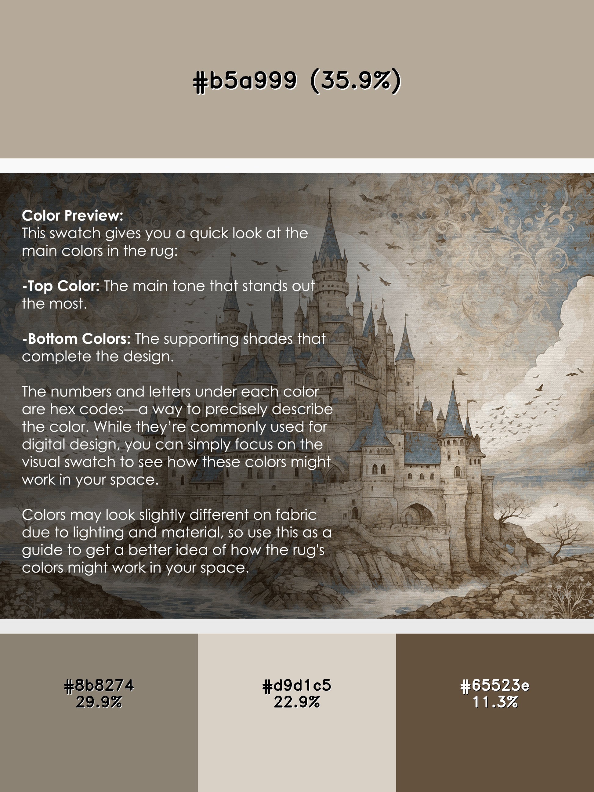 Eagle's Perch from the Castle Chronicles collection brings the timeless grandeur of medieval elegance to your space with its striking Sandstone color (A soft and warm beige inspired by natural sandstone.), a rich tone in the Beige color family. Featuring intricate castle motifs and ornate detailing, this rug is finished with Gray serging a durable stitched edge that prevents fraying and enhances its refined look. Crafted from premium polyester and machine-made in the USA with imported materials, it delivers lasting quality and effortless sophistication. Perfect for study rooms, traditional living spaces, luxurious offices, and dining areas, this design combines heraldic patterns, vintage artistry, and everyday practicality. Available in multiple sizes, the Castle Chronicles collection offers a stately yet versatile style to transform your home into a regal retreat steeped in history and charm.