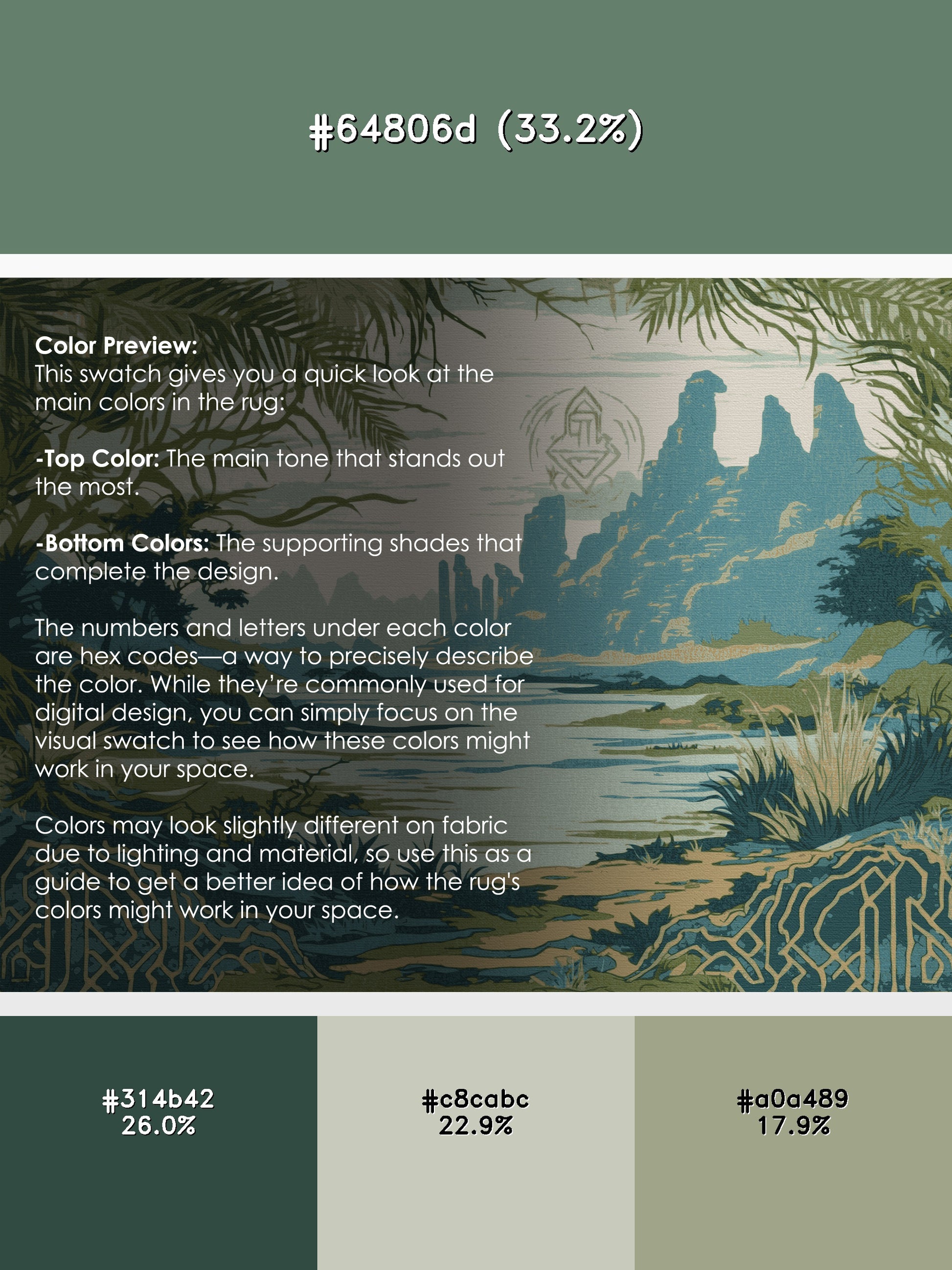 Echoes of Hyrule from the Hero's Path collection takes you on an epic journey of adventure and timeless wonder with its captivating Camouflage Green color (A muted and earthy green, perfect for outdoor and natural themes.), a bold tone in the Green color family. Inspired by mythical quests and heroic landscapes, this rug features intricate symbols and dynamic designs that evoke a sense of exploration and creativity. Finished with SageGreen serging a durable stitched edge that prevents fraying and enhances its artistic appeal this rug is crafted from premium polyester and machine-made in the USA with imported materials. Perfect for creating a bold statement in living rooms, inspiring creativity in home offices, or elevating entertainment areas, this design combines fantasy, elegance, and practicality. Available in multiple sizes, the Hero's Path collection transforms your space into a realm of imagination and discovery with its adventurous spirit and artistic flair.