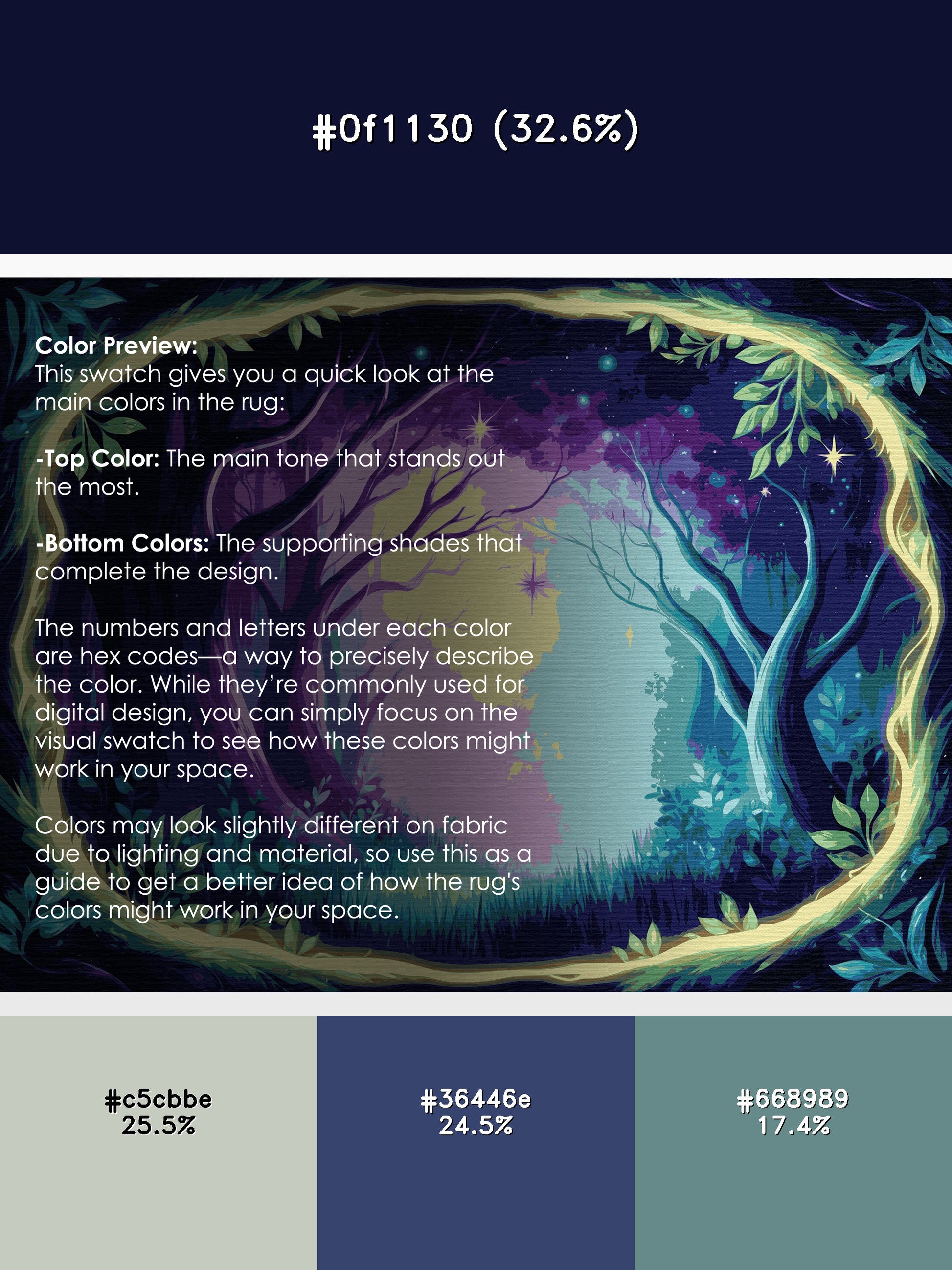 Eclipsed Meadow from the Mystic Grove collection captures the tranquil essence of lush forest canopies with its stunning Blue Whale color (A dark blue with soft purple undertones, deep and elegant.), a calming tone in the Blue color family. Inspired by flourishing greenery and woodland shadows, this rug features intricate leaf patterns, organic shapes, and layered designs that evoke depth and elegance. Finished with Navy serging a durable edge that enhances its artisanal look this rug is crafted from premium polyester and machine-made in the USA with imported materials. Perfect for creating a serene retreat in living rooms, calming bedrooms, or artistic reading corners, this design brings a harmonious blend of nature and refinement to your space. Available in multiple sizes, the Mystic Grove collection transforms your home into a tranquil haven, offering timeless beauty and versatile style for modern or nature-inspired interiors.