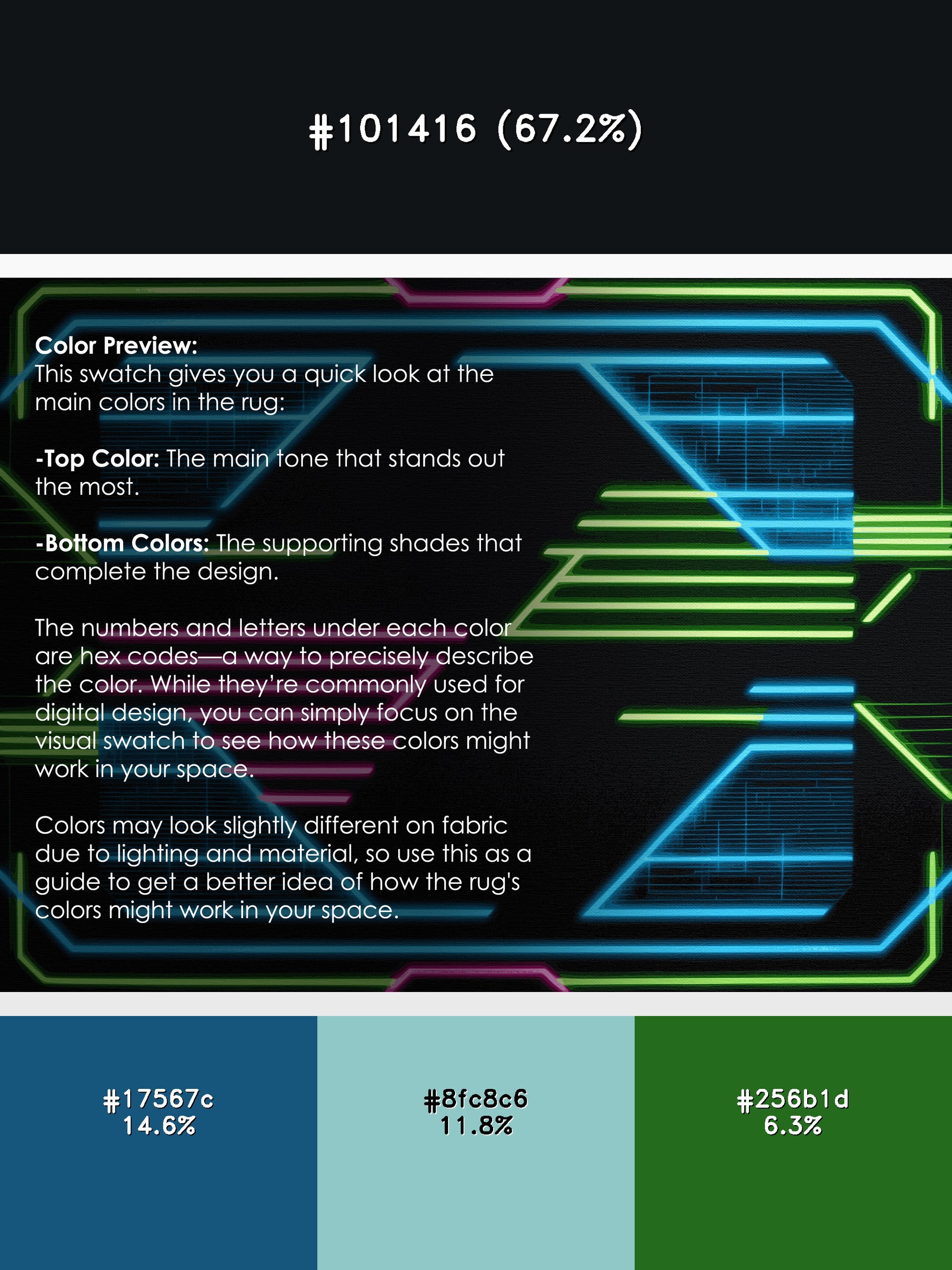 Electric Gradient from the Neon Nexus collection electrifies your space with its bold Night color (A rich, dark black with a hint of depth, evoking the stillness of night.), a striking tone in the Black color family. Inspired by neon-lit cityscapes and cyberpunk design, this rug features sharp geometric patterns and dynamic lines illuminated by vibrant, electric hues. Finished with Navy serging a sleek edge that enhances its futuristic appeal this rug is crafted from premium polyester and machine-made in the USA with imported materials. Perfect for modern gaming rooms, creative studios, or contemporary living spaces, this design balances cutting-edge energy with adaptable elegance. Available in multiple sizes, the Neon Nexus collection transforms any room into a bold statement of innovation and style, channeling the vibrant glow of a cyberpunk universe.