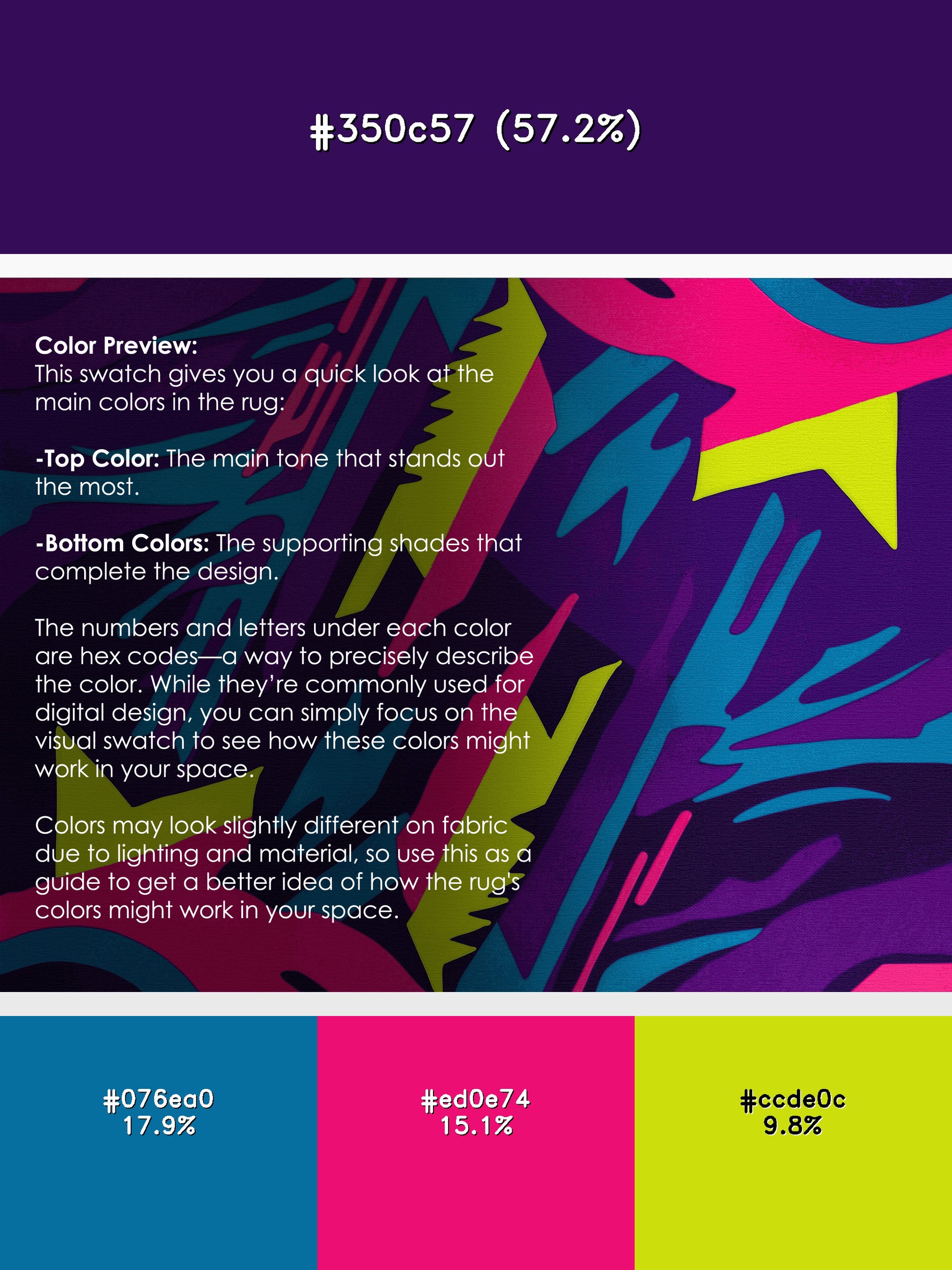 Electric Mirage from the Neon Nexus collection electrifies your space with its bold Purple Monster color (A bold and vibrant purple with a playful, lively character.), a striking tone in the Purple color family. Inspired by neon-lit cityscapes and cyberpunk design, this rug features sharp geometric patterns and dynamic lines illuminated by vibrant, electric hues. Finished with Navy serging a sleek edge that enhances its futuristic appeal this rug is crafted from premium polyester and machine-made in the USA with imported materials. Perfect for modern gaming rooms, creative studios, or contemporary living spaces, this design balances cutting-edge energy with adaptable elegance. Available in multiple sizes, the Neon Nexus collection transforms any room into a bold statement of innovation and style, channeling the vibrant glow of a cyberpunk universe.