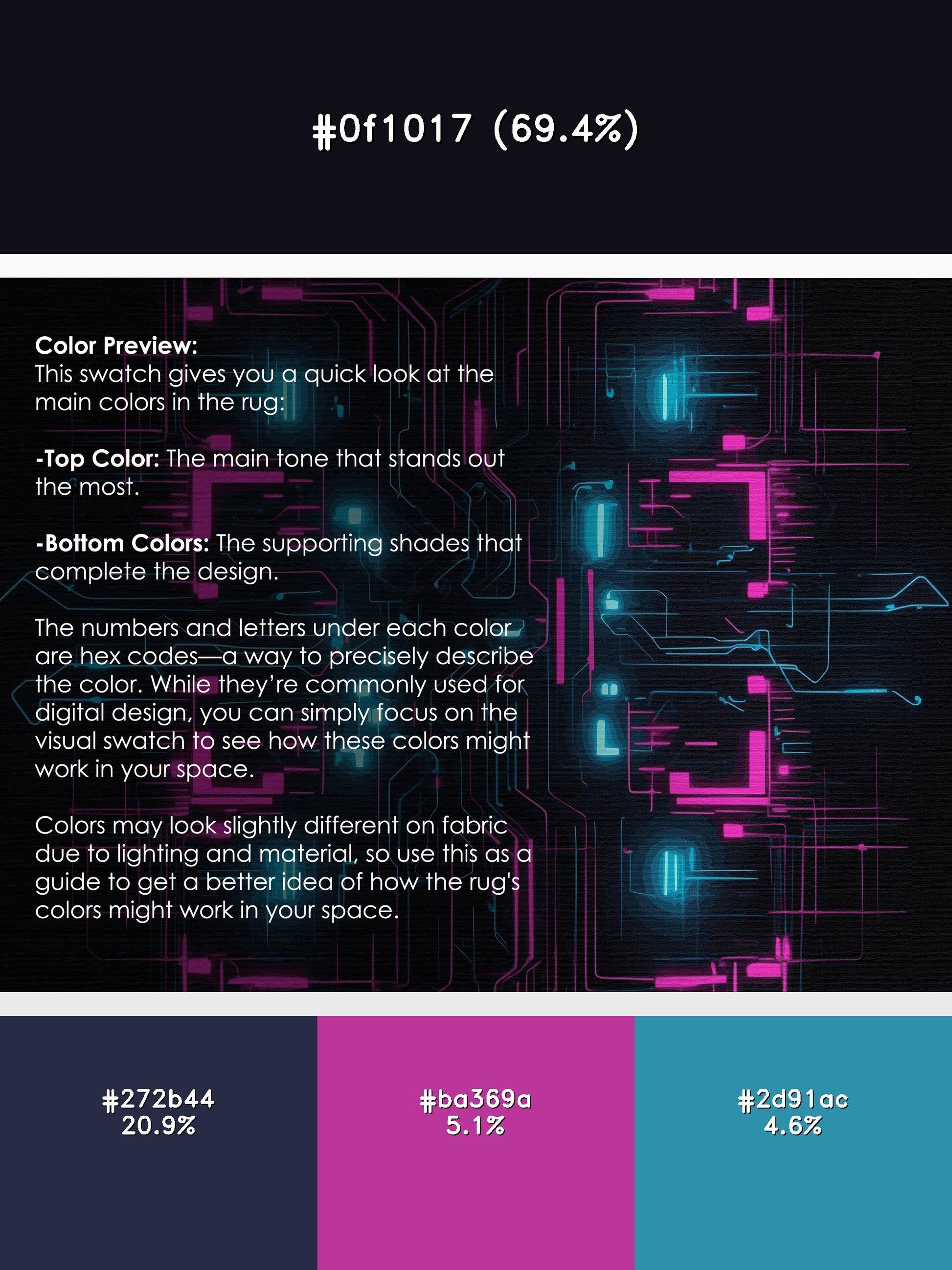 Electric Ripple from the Neon Nexus collection electrifies your space with its bold Dark Slate color (A dark slate blue with a cool and moody aesthetic.), a striking tone in the Blue color family. Inspired by neon-lit cityscapes and cyberpunk design, this rug features sharp geometric patterns and dynamic lines illuminated by vibrant, electric hues. Finished with Black serging a sleek edge that enhances its futuristic appeal this rug is crafted from premium polyester and machine-made in the USA with imported materials. Perfect for modern gaming rooms, creative studios, or contemporary living spaces, this design balances cutting-edge energy with adaptable elegance. Available in multiple sizes, the Neon Nexus collection transforms any room into a bold statement of innovation and style, channeling the vibrant glow of a cyberpunk universe.