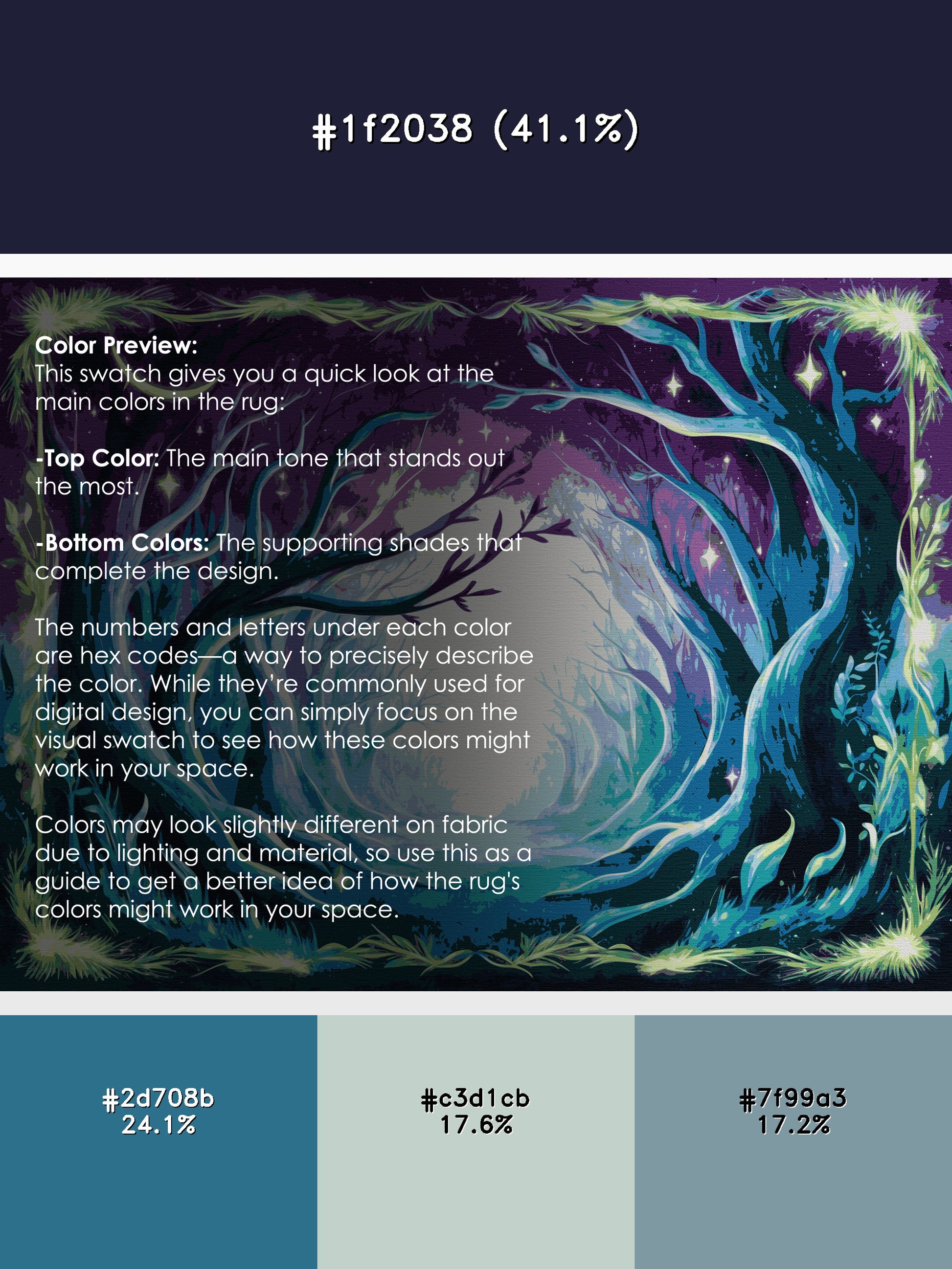 Enchanted Canopy from the Mystic Grove collection captures the tranquil essence of lush forest canopies with its stunning Purple Navy color (A dark purple with strong navy undertones, sophisticated and deep.), a calming tone in the Purple color family. Inspired by flourishing greenery and woodland shadows, this rug features intricate leaf patterns, organic shapes, and layered designs that evoke depth and elegance. Finished with Navy serging a durable edge that enhances its artisanal look this rug is crafted from premium polyester and machine-made in the USA with imported materials. Perfect for creating a serene retreat in living rooms, calming bedrooms, or artistic reading corners, this design brings a harmonious blend of nature and refinement to your space. Available in multiple sizes, the Mystic Grove collection transforms your home into a tranquil haven, offering timeless beauty and versatile style for modern or nature-inspired interiors.