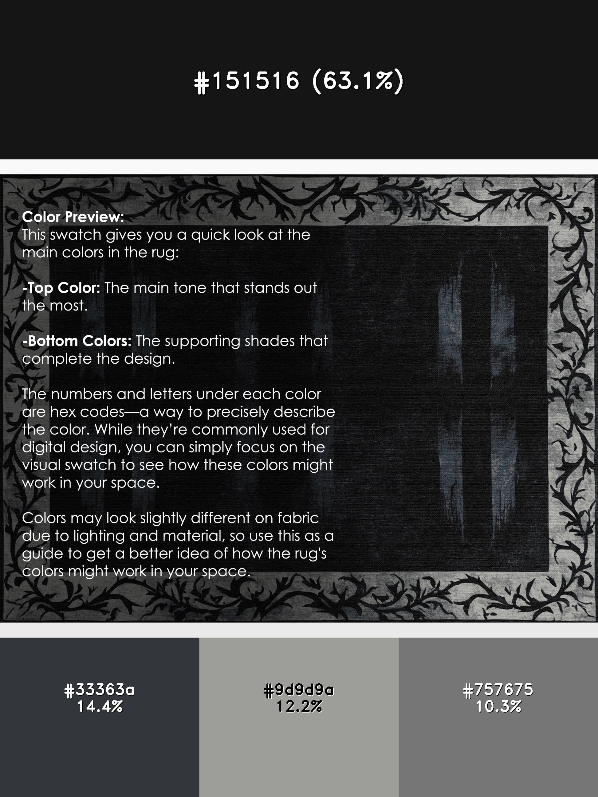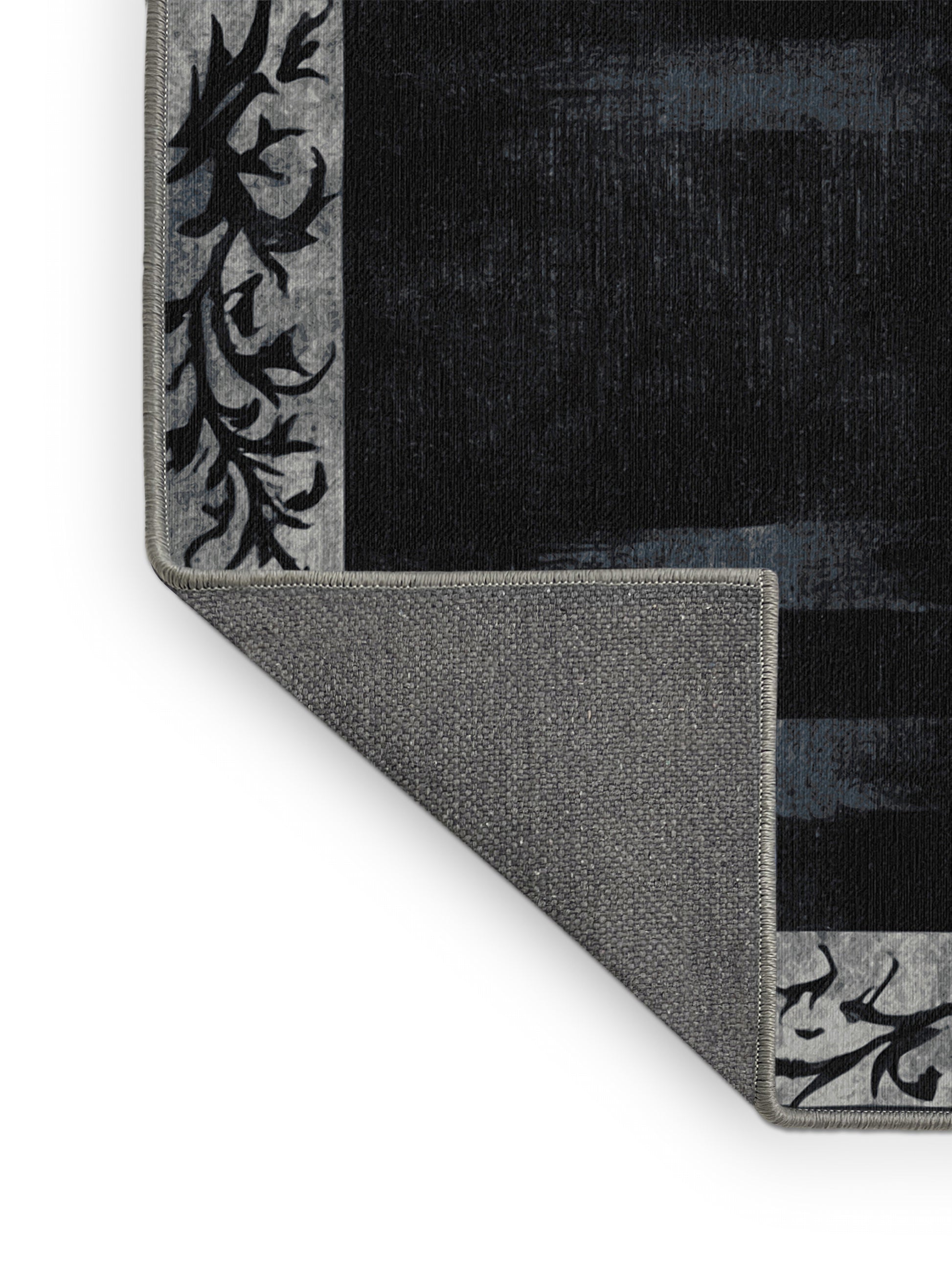 Enchanted Night from the Nocturne Elegance collection exudes timeless sophistication with its captivating Midnight color (A deep, dark color with subtle red undertones, mysterious and bold.), a rich tone in the Black color family. Featuring intricate baroque-inspired patterns and swirling vine designs, this rug creates a sense of depth and refined elegance. Finished with Gray serging a durable edge that enhances its luxurious aesthetic this rug is crafted from premium polyester and machine-made in the USA with imported materials. Perfect for formal dining rooms, chic living areas, or cozy bedrooms, this design balances bold drama with subtle charm, complementing both contemporary and traditional interiors. Available in multiple sizes, the Nocturne Elegance collection transforms your home into a haven of understated grandeur and classic refinement.