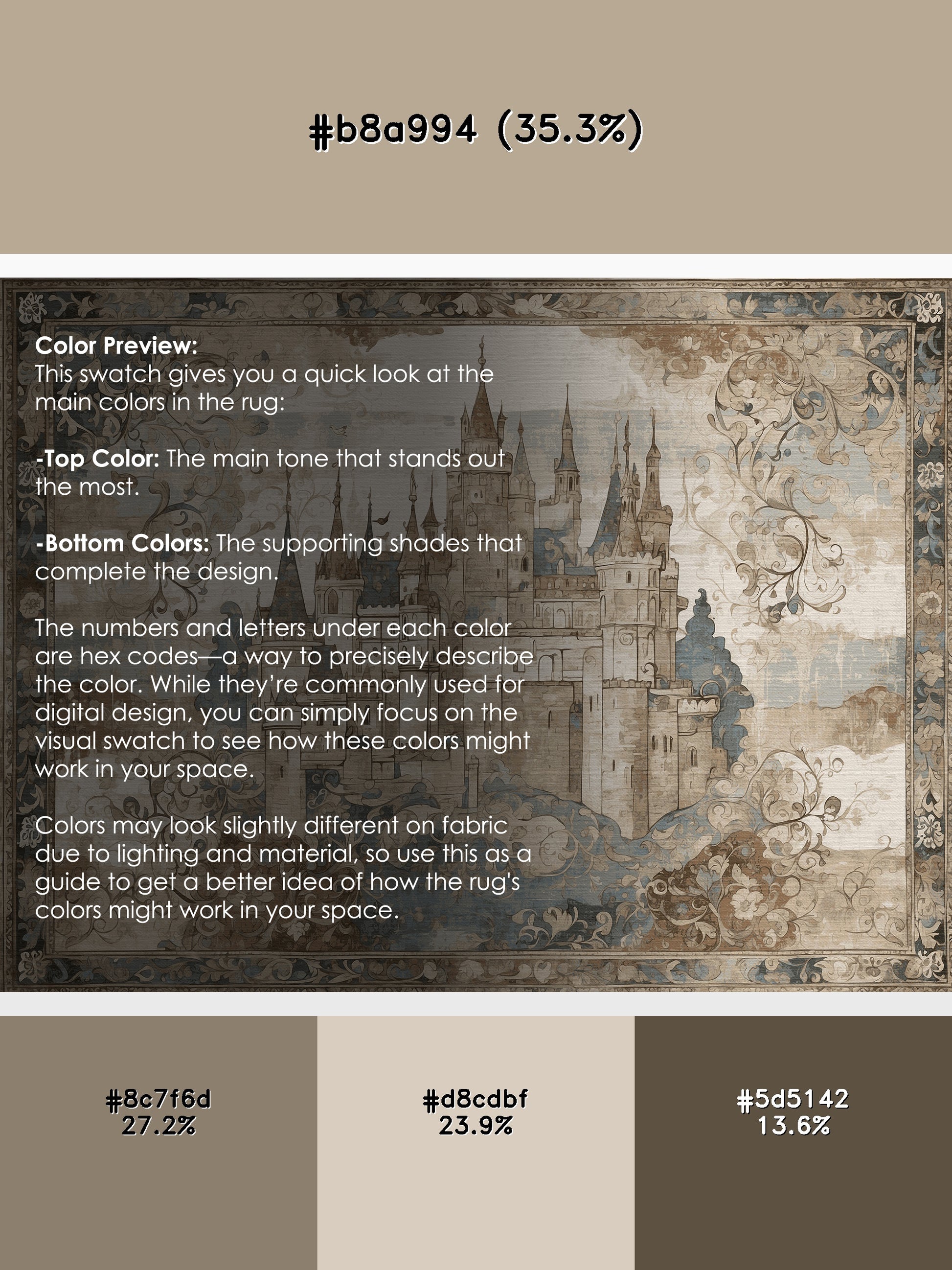 Fabled Spires from the Castle Chronicles collection brings the timeless grandeur of medieval elegance to your space with its striking White Chocolate color (A creamy white with soft, warm tones, like white chocolate.), a rich tone in the White color family. Featuring intricate castle motifs and ornate detailing, this rug is finished with White serging a durable stitched edge that prevents fraying and enhances its refined look. Crafted from premium polyester and machine-made in the USA with imported materials, it delivers lasting quality and effortless sophistication. Perfect for study rooms, traditional living spaces, luxurious offices, and dining areas, this design combines heraldic patterns, vintage artistry, and everyday practicality. Available in multiple sizes, the Castle Chronicles collection offers a stately yet versatile style to transform your home into a regal retreat steeped in history and charm.