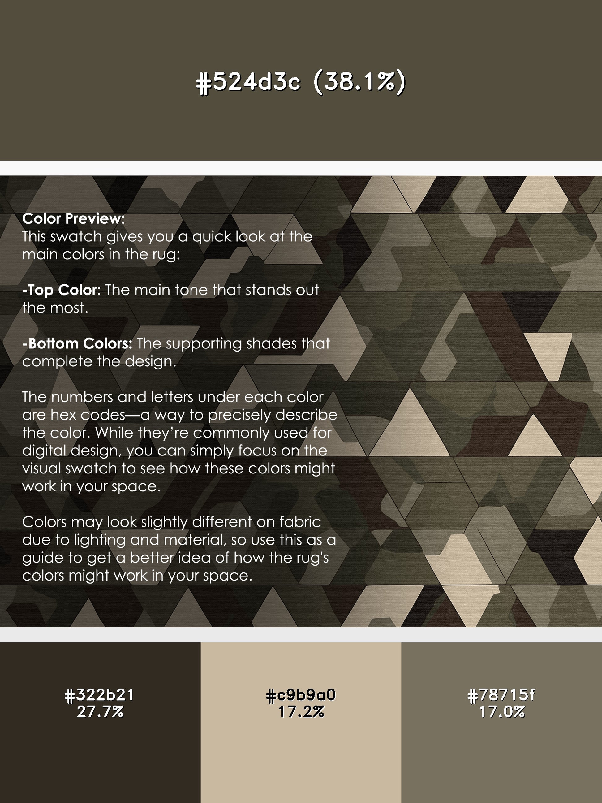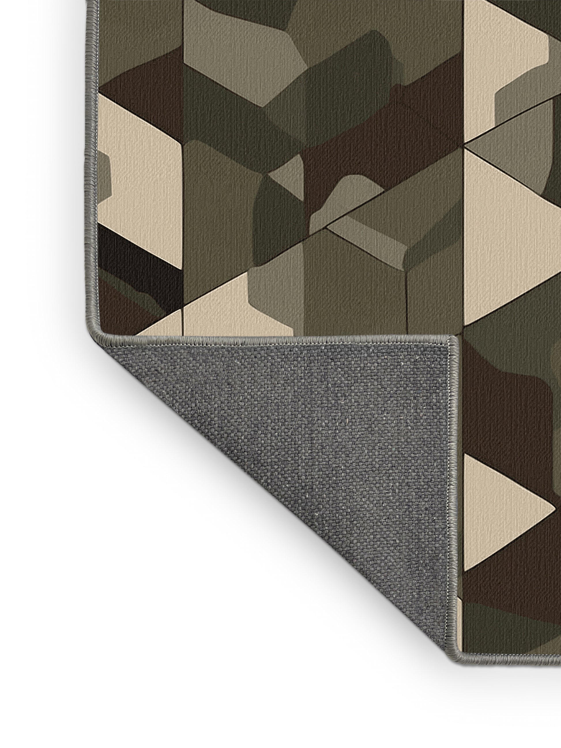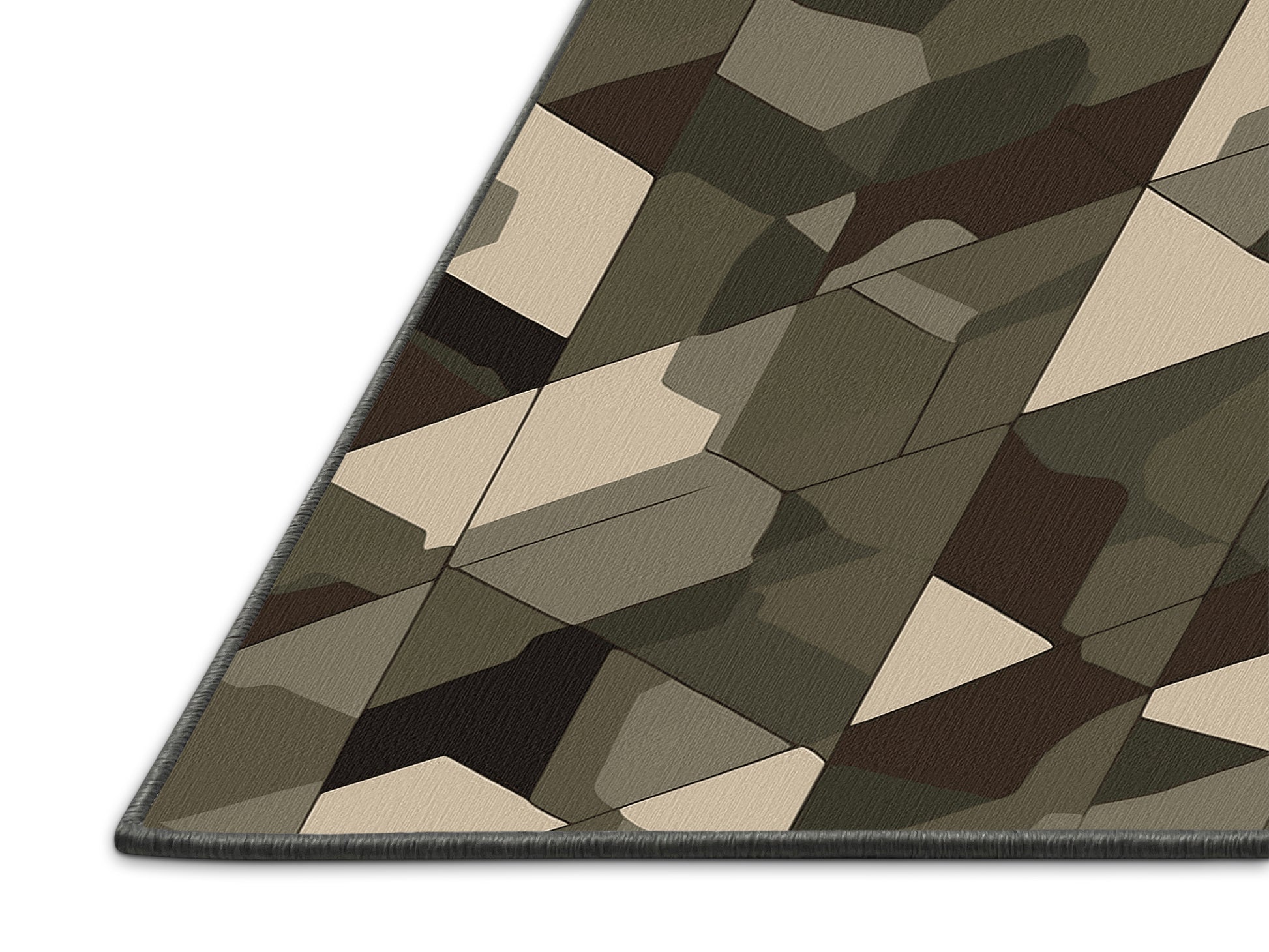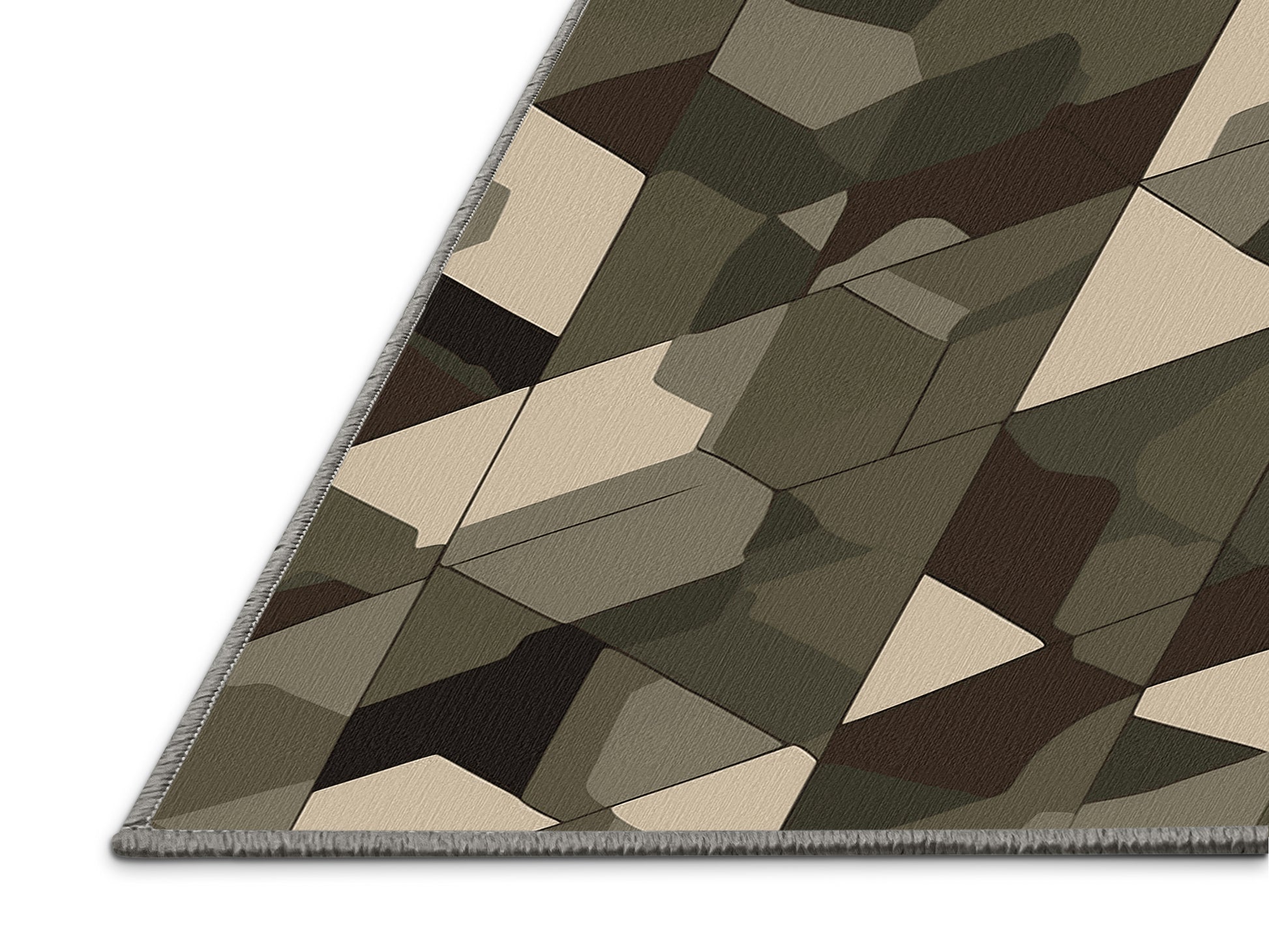 Flank Route from the Tactical Terrain collection brings rugged sophistication to your space with its striking Army Brown color (A muted and earthy brown inspired by military tones.), a bold tone in the Brown color family. Inspired by military camouflage and geometric precision, this rug features angular motifs, sharp black gridlines, and a muted palette that evokes strength and resilience. Finished with Gray serging a durable edge that enhances its contemporary aesthetic this rug is crafted from premium polyester and machine-made in the USA with imported materials. Perfect for modern living rooms, industrial home offices, or creative studios, this design blends tactical flair with versatile style. Available in multiple sizes, the Tactical Terrain collection transforms your home with a distinctive edge and bold character, elevating any decor scheme.