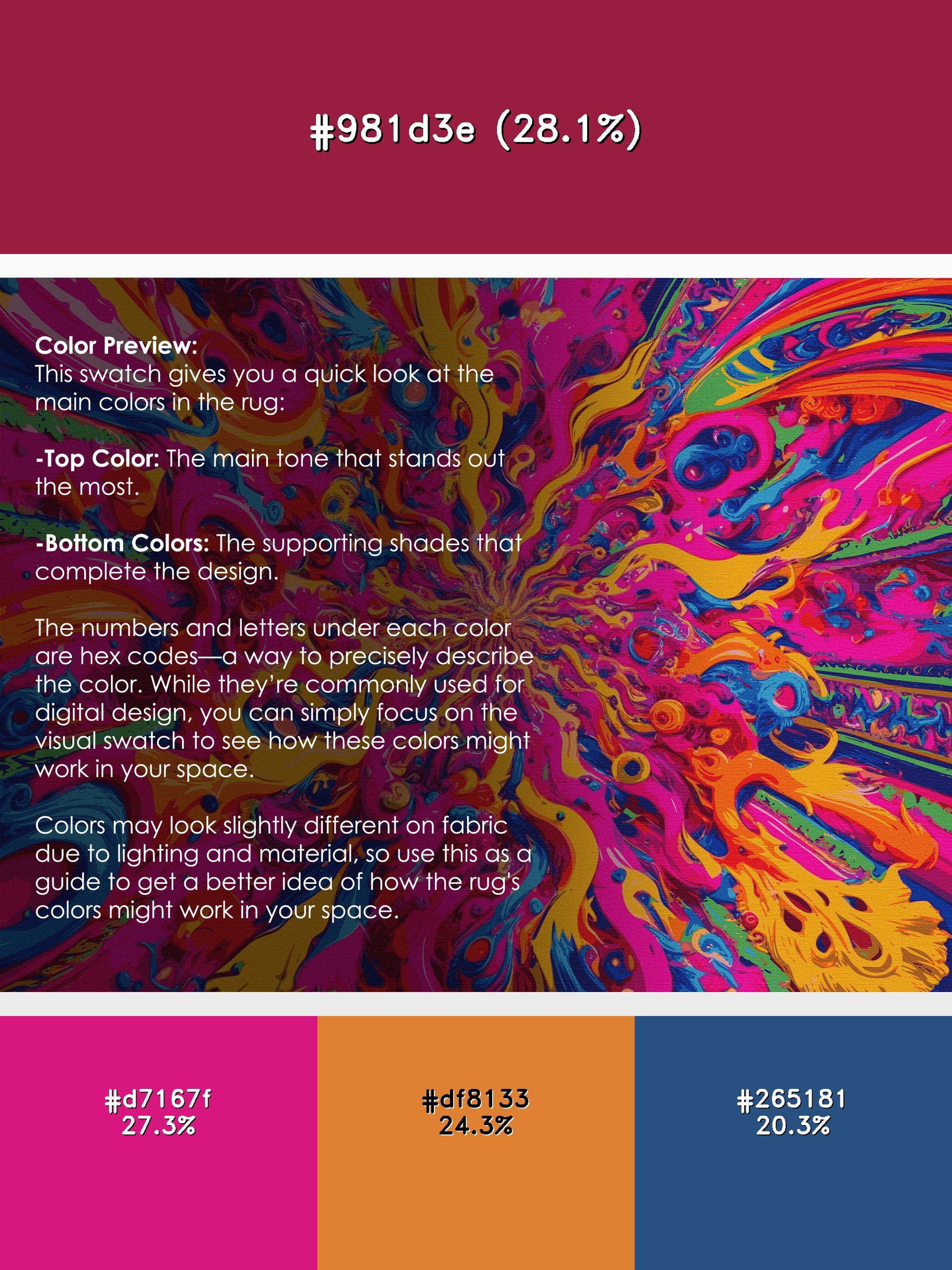 Fractal Flow from the Psychedelia Peaks collection radiates vibrant energy with its bold Pink Violet color (A bold pink with rich violet undertones, vibrant and striking.), a striking tone in the Pink color family. Featuring swirling, kaleidoscopic patterns and electrifying neon hues inspired by the psychedelic art movement, this rug brings a sense of dynamic motion and artistic expression to your space. Finished with Rose serging a durable edge that enhances its playful and vibrant aesthetic this rug is crafted from premium polyester and machine-made in the USA with imported materials. Perfect for eclectic living rooms, retro-inspired spaces, or creative studios, this design transforms any room into a lively haven of individuality and boldness. Available in multiple sizes, the Psychedelia Peaks collection adds a dramatic, colorful statement to your decor, turning your home into a canvas of unrestrained creativity.