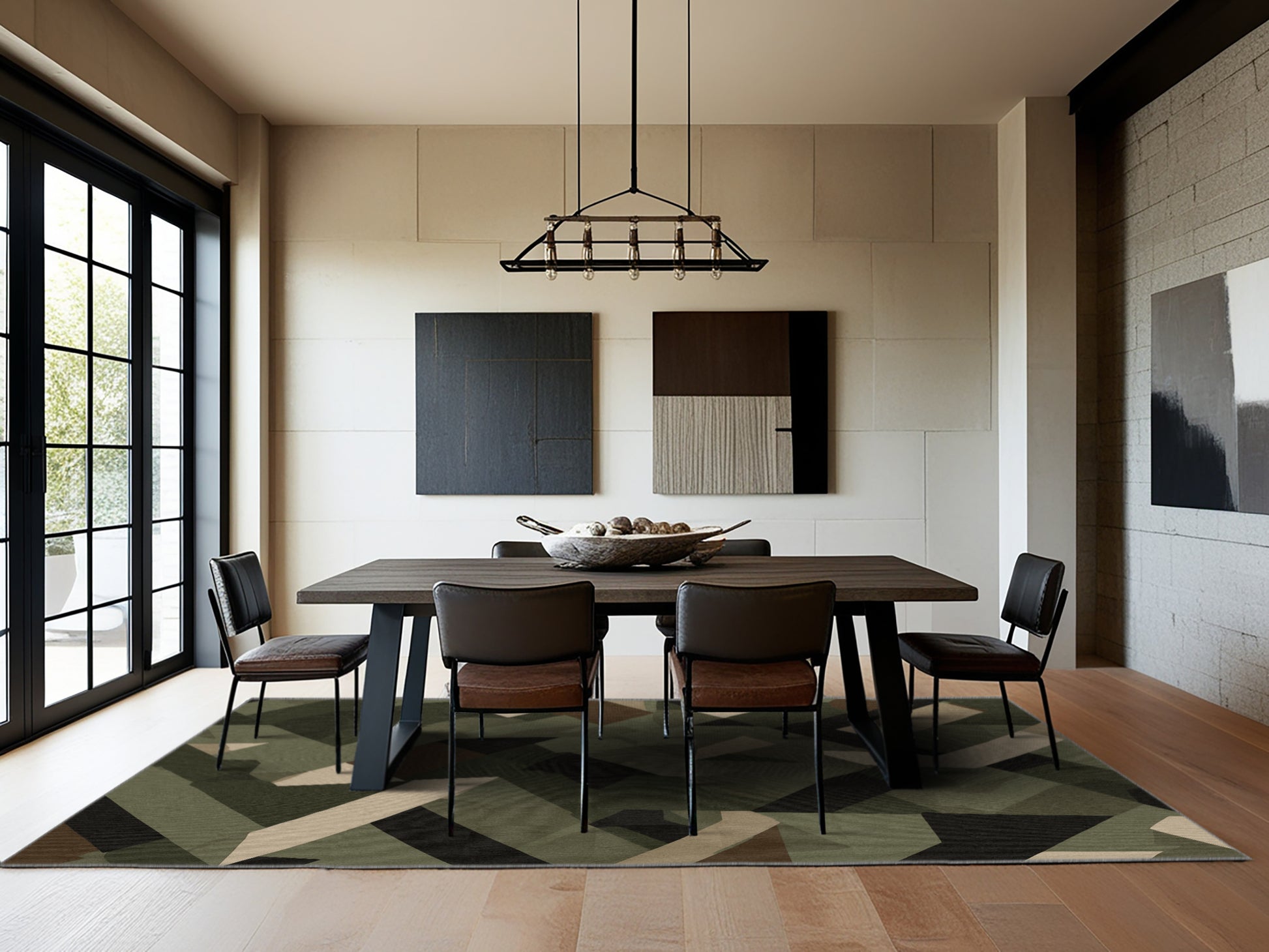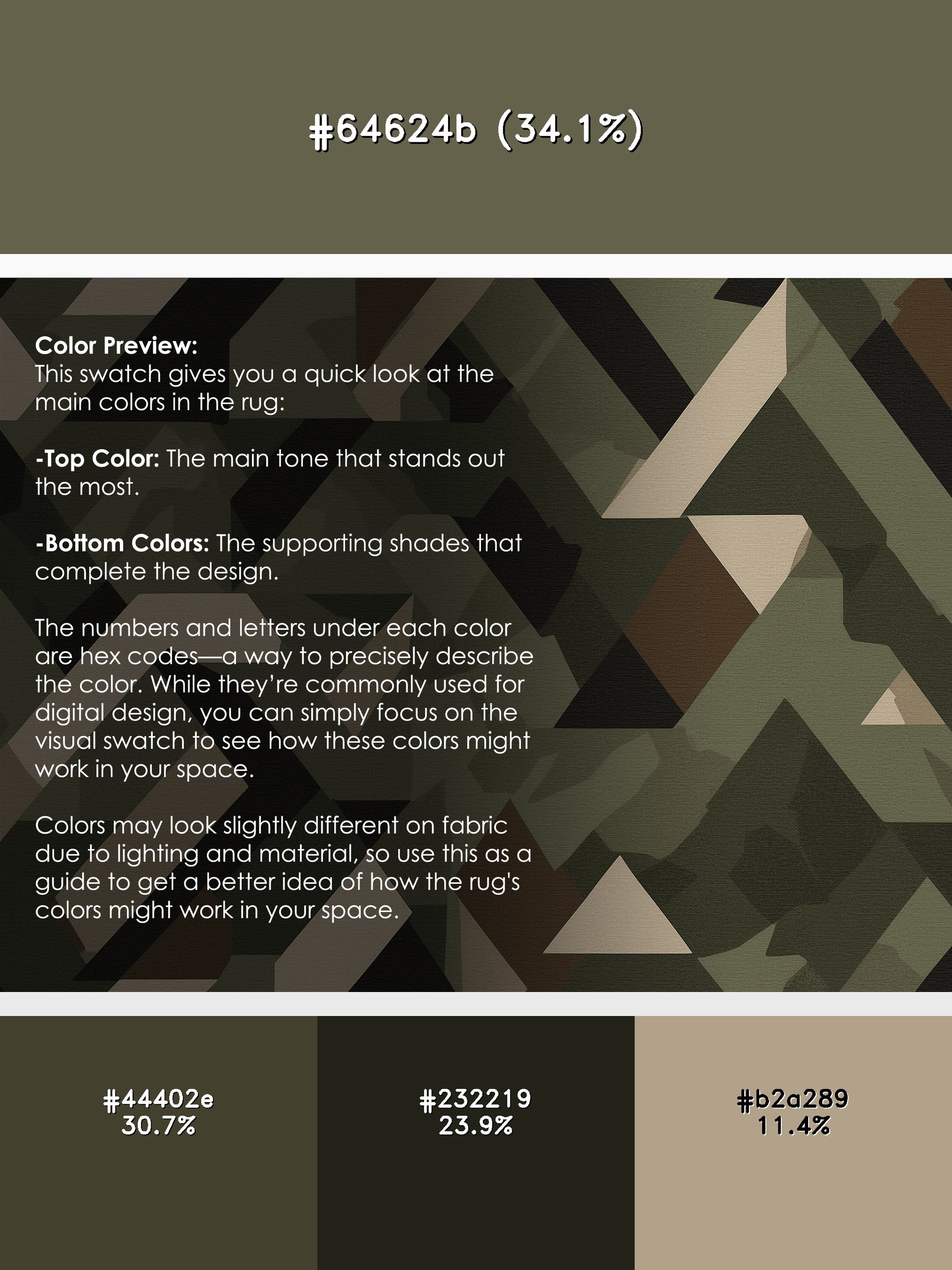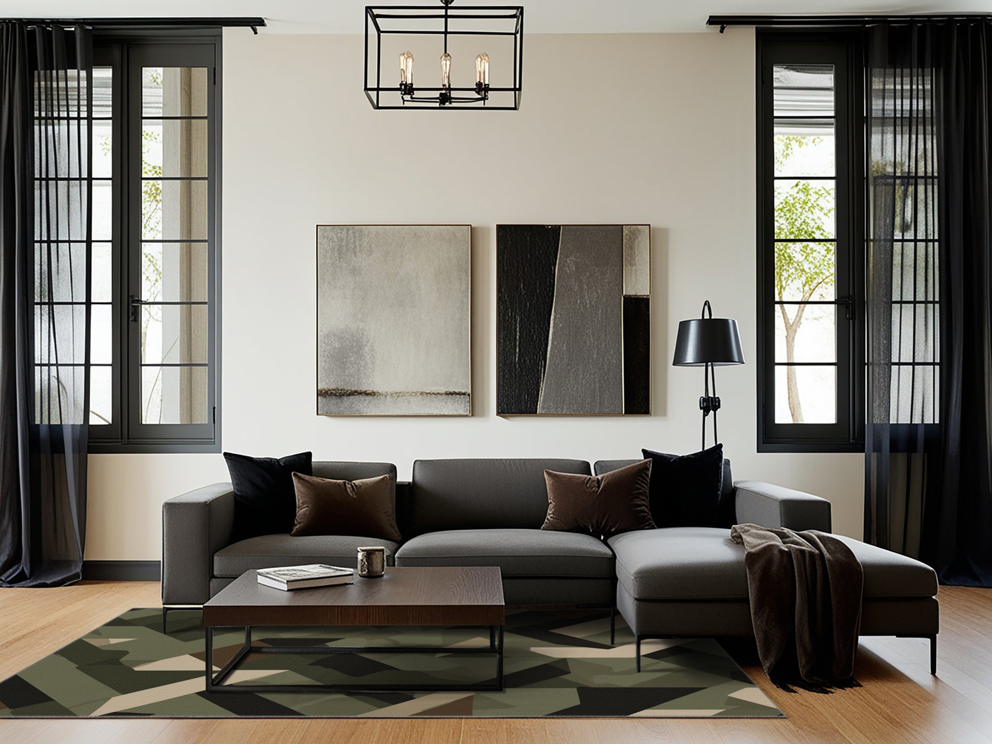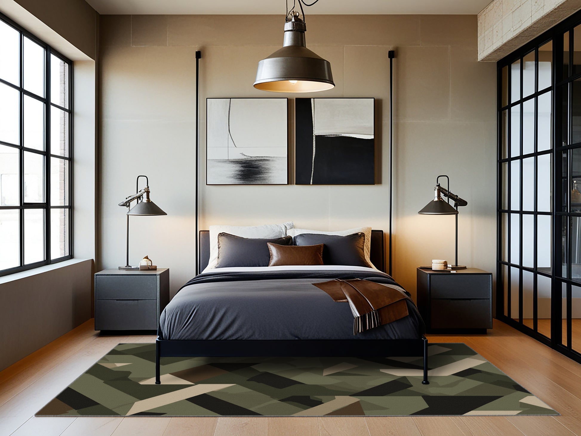 Fragment Peak from the Tactical Terrain collection brings rugged sophistication to your space with its striking Army Brown color (A muted and earthy brown inspired by military tones.), a bold tone in the Brown color family. Inspired by military camouflage and geometric precision, this rug features angular motifs, sharp black gridlines, and a muted palette that evokes strength and resilience. Finished with Gray serging a durable edge that enhances its contemporary aesthetic this rug is crafted from premium polyester and machine-made in the USA with imported materials. Perfect for modern living rooms, industrial home offices, or creative studios, this design blends tactical flair with versatile style. Available in multiple sizes, the Tactical Terrain collection transforms your home with a distinctive edge and bold character, elevating any decor scheme.