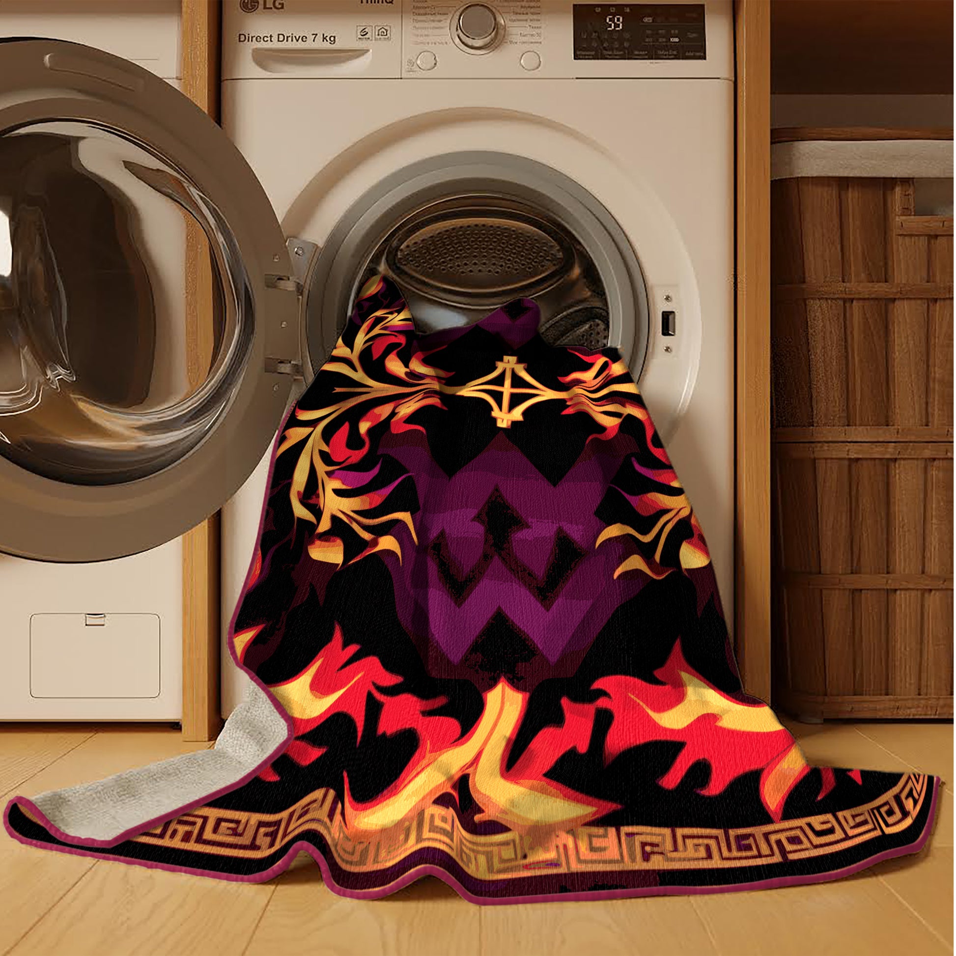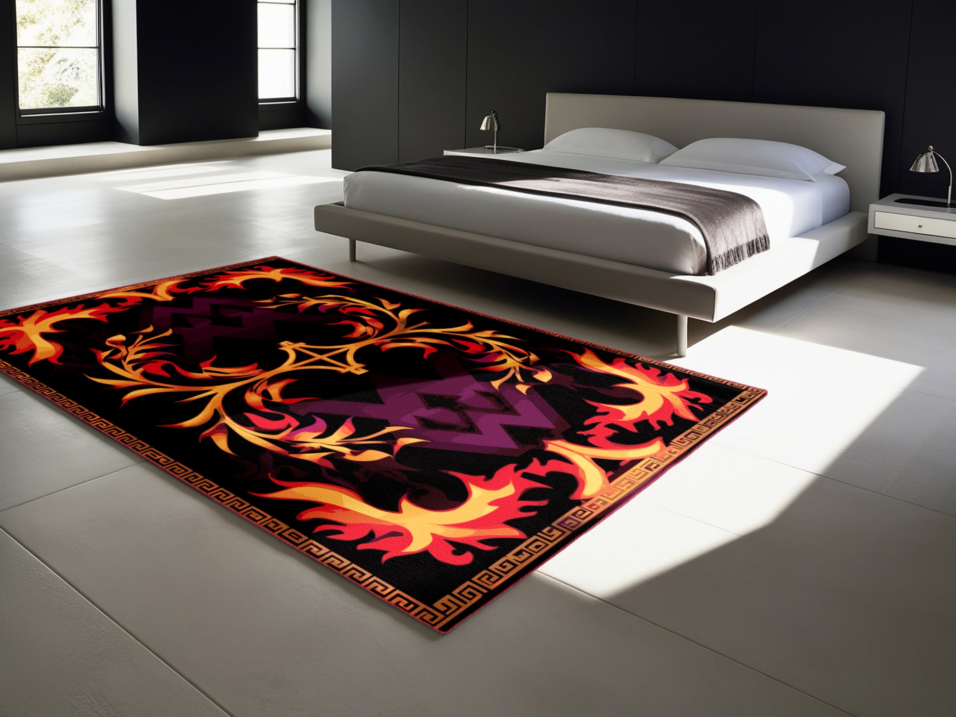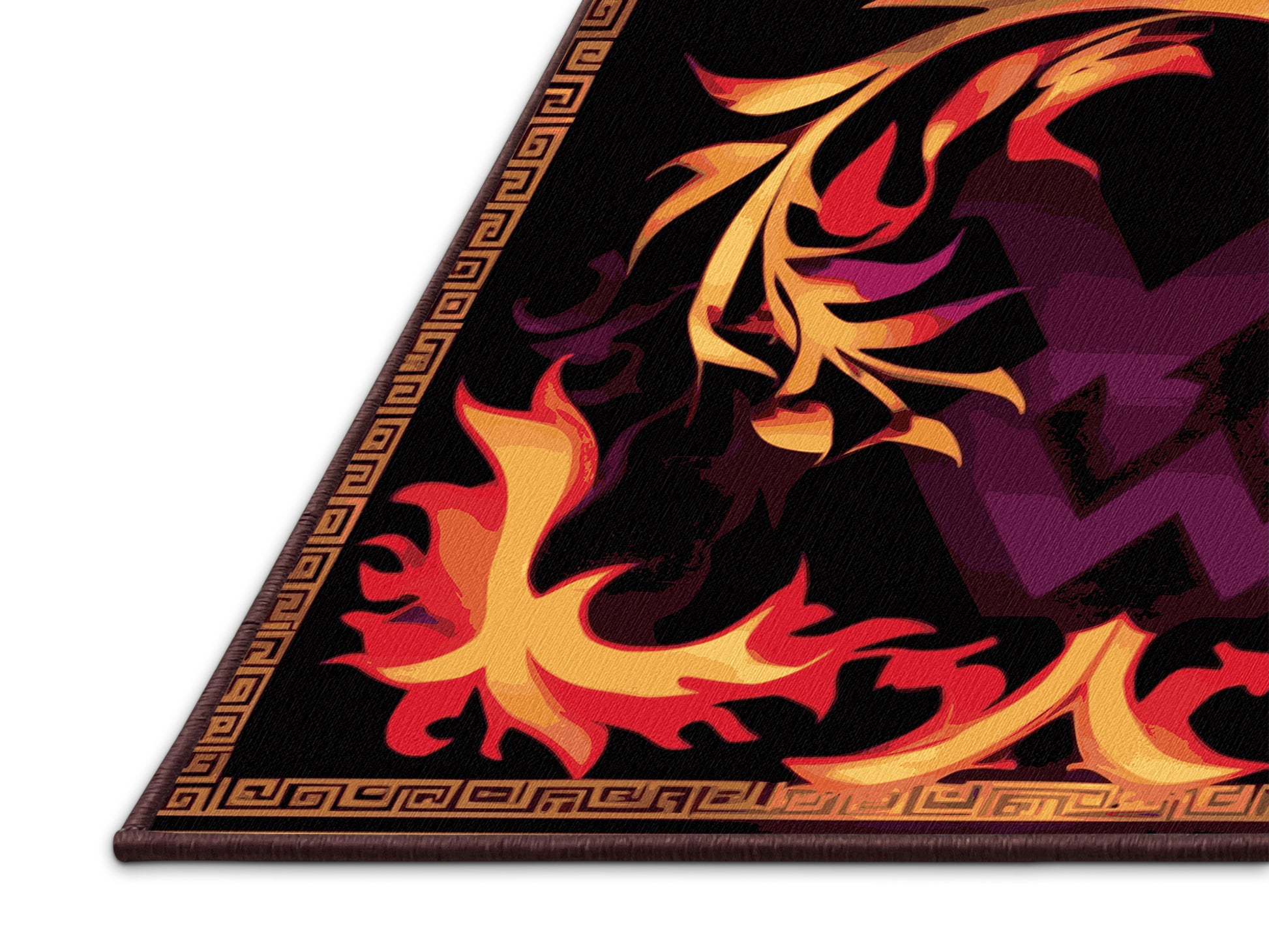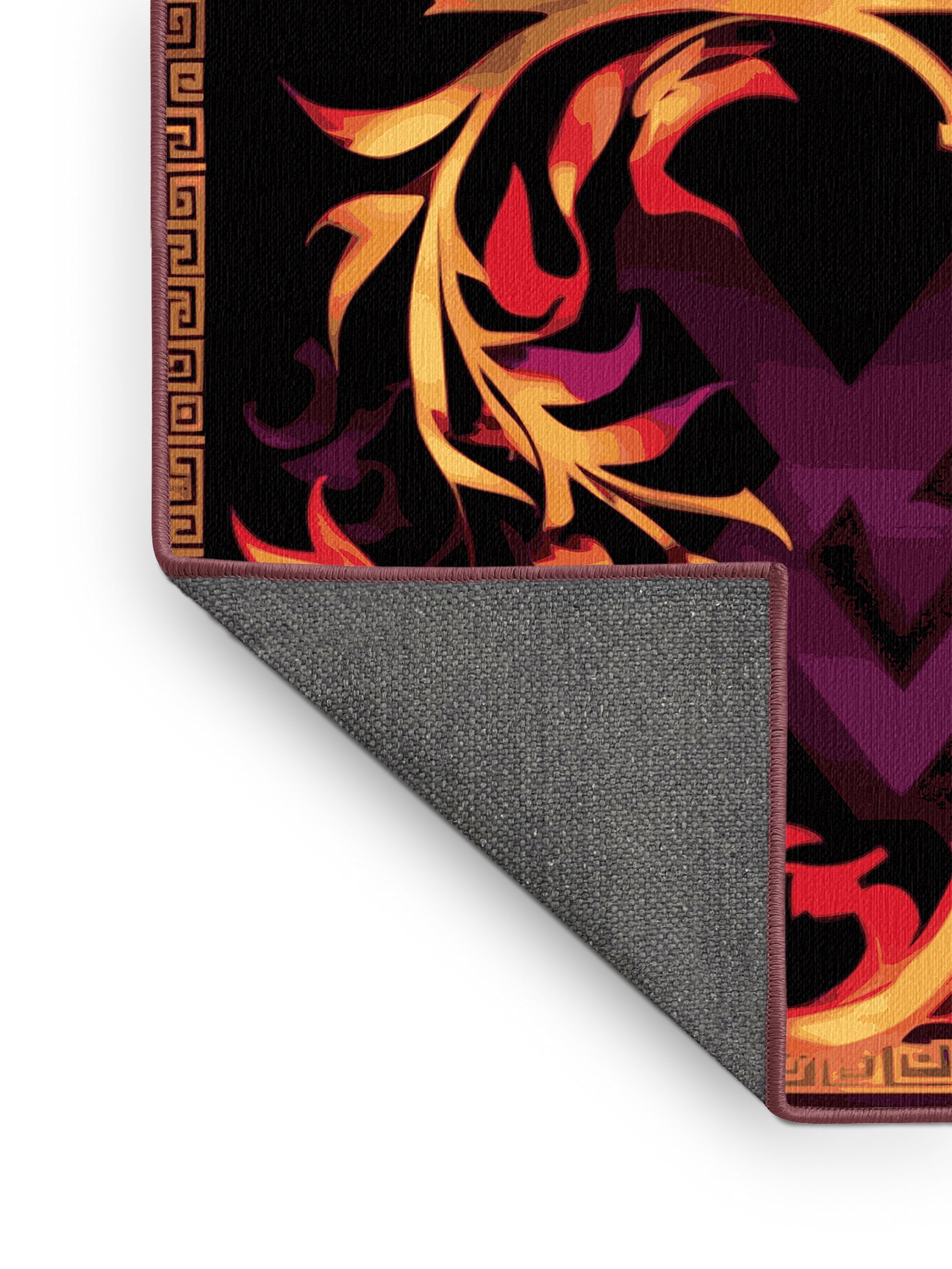 Golden Cascade from the Gilded Mythos collection embodies the drama and opulence of ancient mythology with its captivating Velvet Maroon color (A soft and warm maroon with a velvety finish.), a bold tone in the Purple color family. Featuring intricate patterns reminiscent of mythological symbols and lavish gilded accents, this rug is finished with Rose serging a durable stitched edge that prevents fraying and enhances its regal aesthetic. Crafted from premium polyester and machine-made in the USA with imported materials, it offers both timeless elegance and lasting durability. Perfect for grand living spaces, formal dining rooms, or statement entryways, this design weaves together sophistication and mystique to create a bold focal point. Available in multiple sizes, the Gilded Mythos collection transforms any room into a space of mythical grandeur and artistic allure.