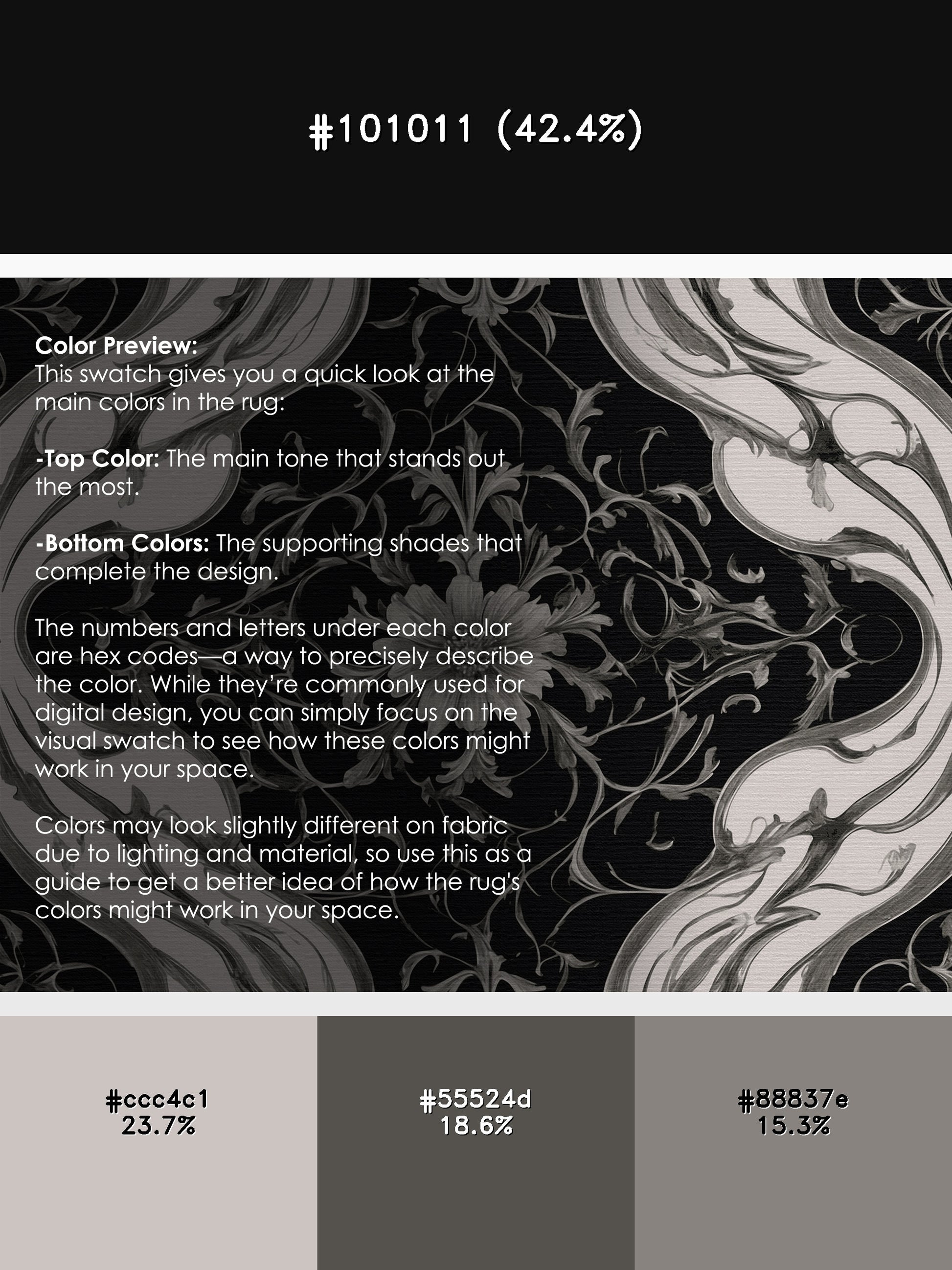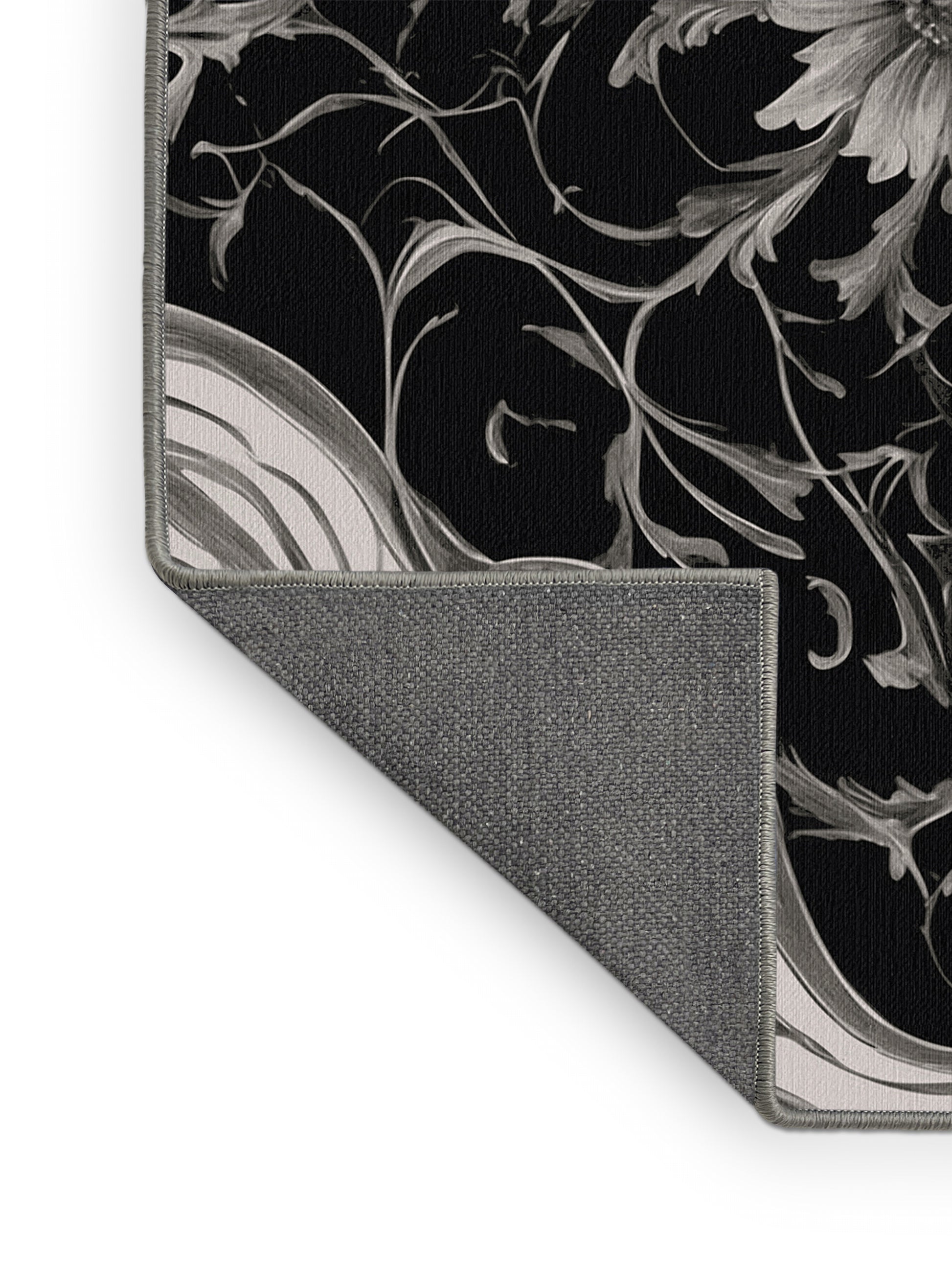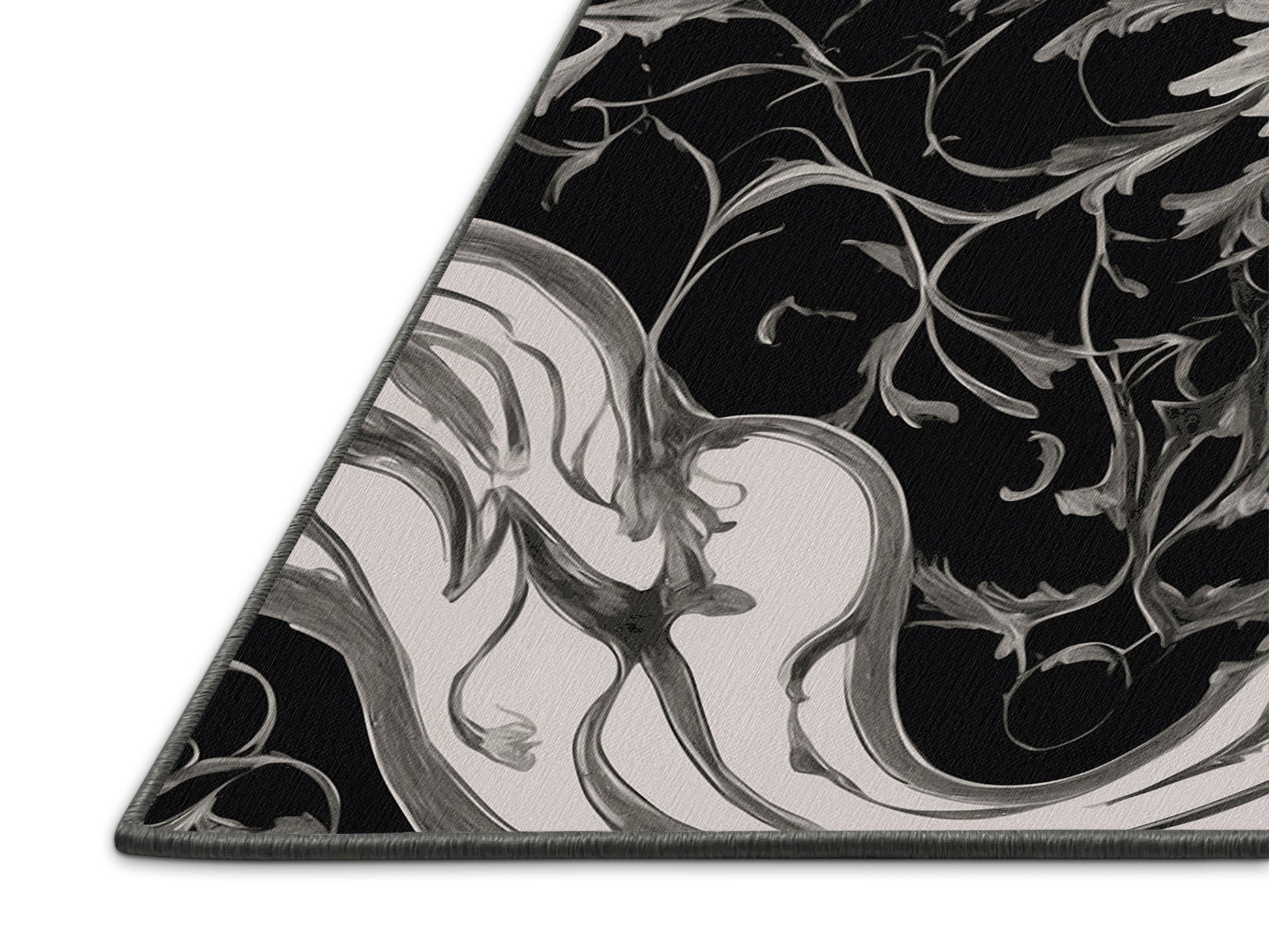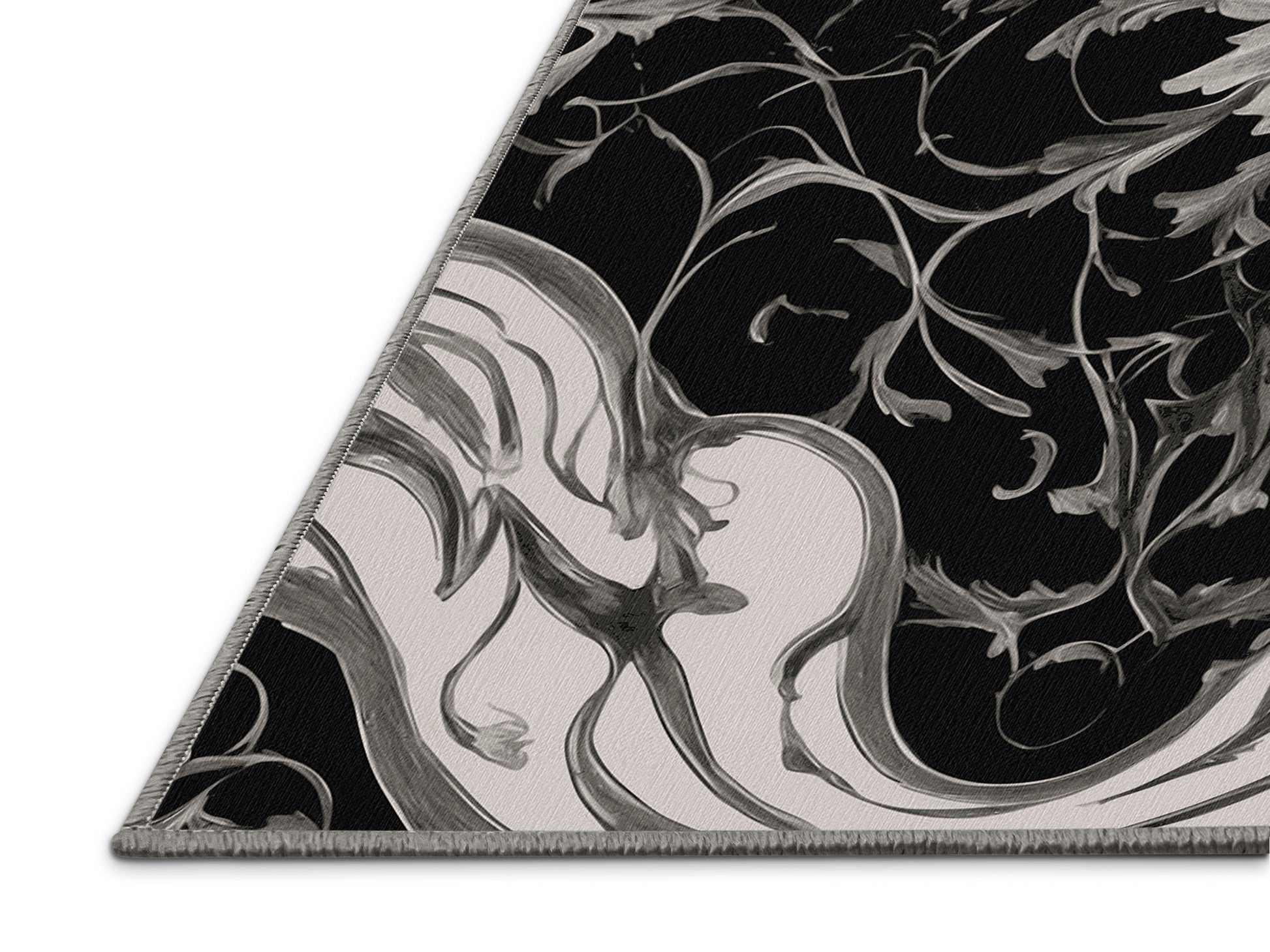 Granite Shadows from the Nocturne Elegance collection exudes timeless sophistication with its captivating Night color (A rich, dark black with a hint of depth, evoking the stillness of night.), a rich tone in the Black color family. Featuring intricate baroque-inspired patterns and swirling vine designs, this rug creates a sense of depth and refined elegance. Finished with Gray serging a durable edge that enhances its luxurious aesthetic this rug is crafted from premium polyester and machine-made in the USA with imported materials. Perfect for formal dining rooms, chic living areas, or cozy bedrooms, this design balances bold drama with subtle charm, complementing both contemporary and traditional interiors. Available in multiple sizes, the Nocturne Elegance collection transforms your home into a haven of understated grandeur and classic refinement.