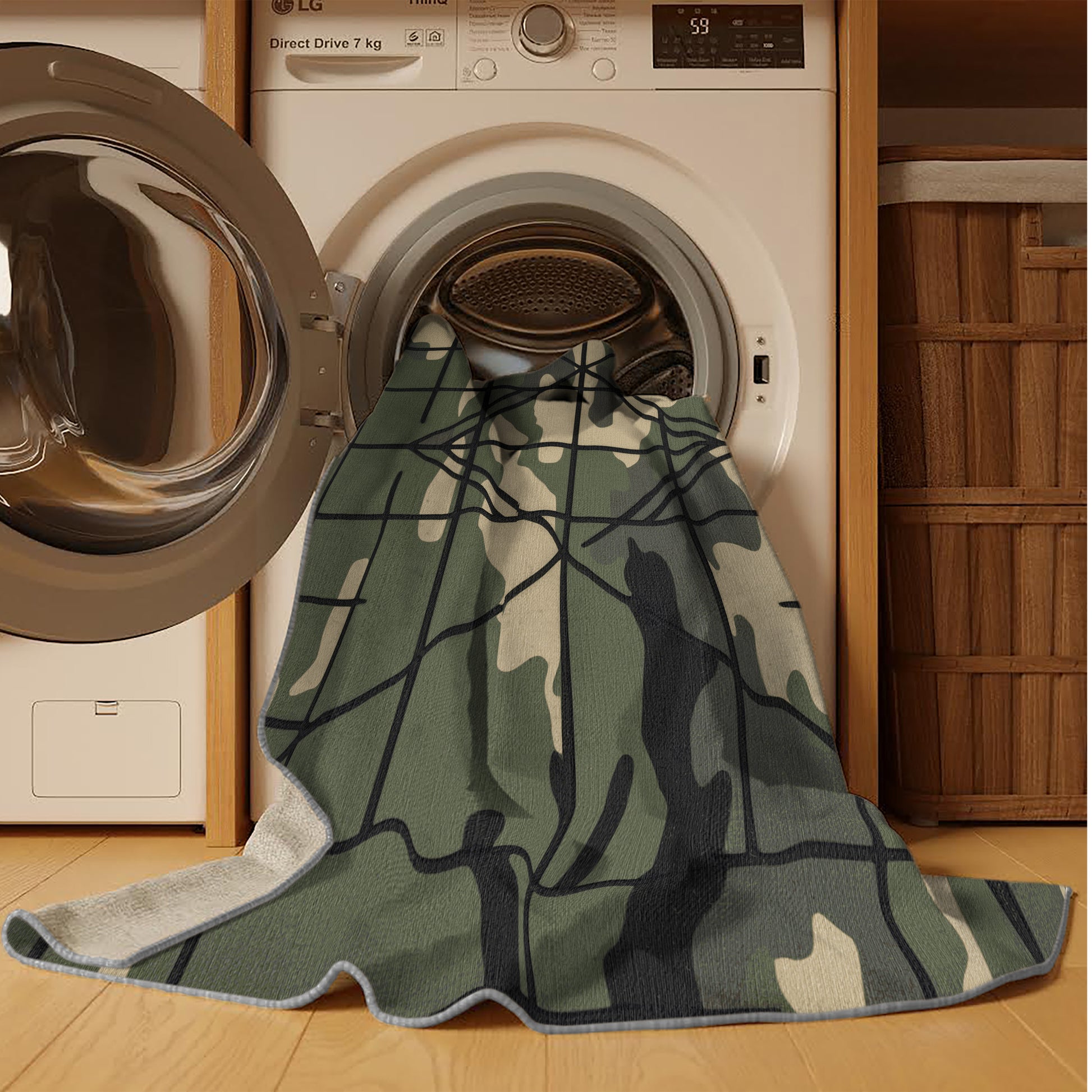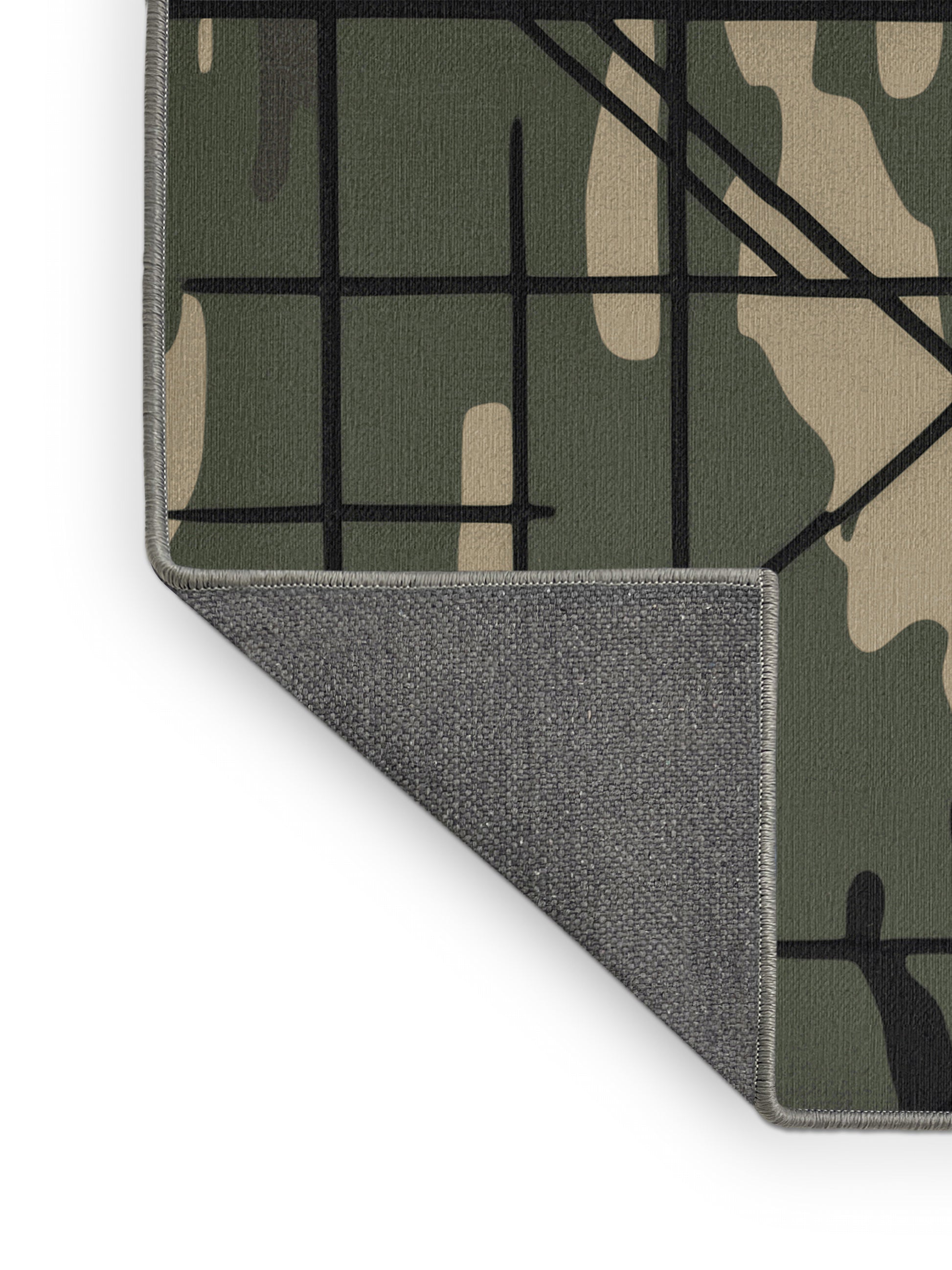Grid Horizon from the Tactical Terrain collection brings rugged sophistication to your space with its striking Sage Green color (A soft and muted green with a touch of gray, calm and soothing.), a bold tone in the Green color family. Inspired by military camouflage and geometric precision, this rug features angular motifs, sharp black gridlines, and a muted palette that evokes strength and resilience. Finished with Gray serging a durable edge that enhances its contemporary aesthetic this rug is crafted from premium polyester and machine-made in the USA with imported materials. Perfect for modern living rooms, industrial home offices, or creative studios, this design blends tactical flair with versatile style. Available in multiple sizes, the Tactical Terrain collection transforms your home with a distinctive edge and bold character, elevating any decor scheme.