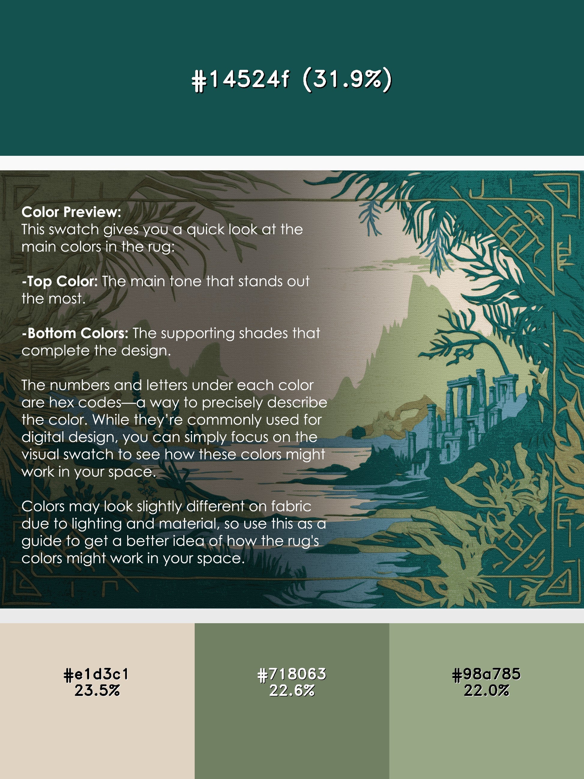 Hero's Legacy from the Hero's Path collection takes you on an epic journey of adventure and timeless wonder with its captivating Camouflage Green color (A muted and earthy green, perfect for outdoor and natural themes.), a bold tone in the Green color family. Inspired by mythical quests and heroic landscapes, this rug features intricate symbols and dynamic designs that evoke a sense of exploration and creativity. Finished with SageGreen serging a durable stitched edge that prevents fraying and enhances its artistic appeal this rug is crafted from premium polyester and machine-made in the USA with imported materials. Perfect for creating a bold statement in living rooms, inspiring creativity in home offices, or elevating entertainment areas, this design combines fantasy, elegance, and practicality. Available in multiple sizes, the Hero's Path collection transforms your space into a realm of imagination and discovery with its adventurous spirit and artistic flair.