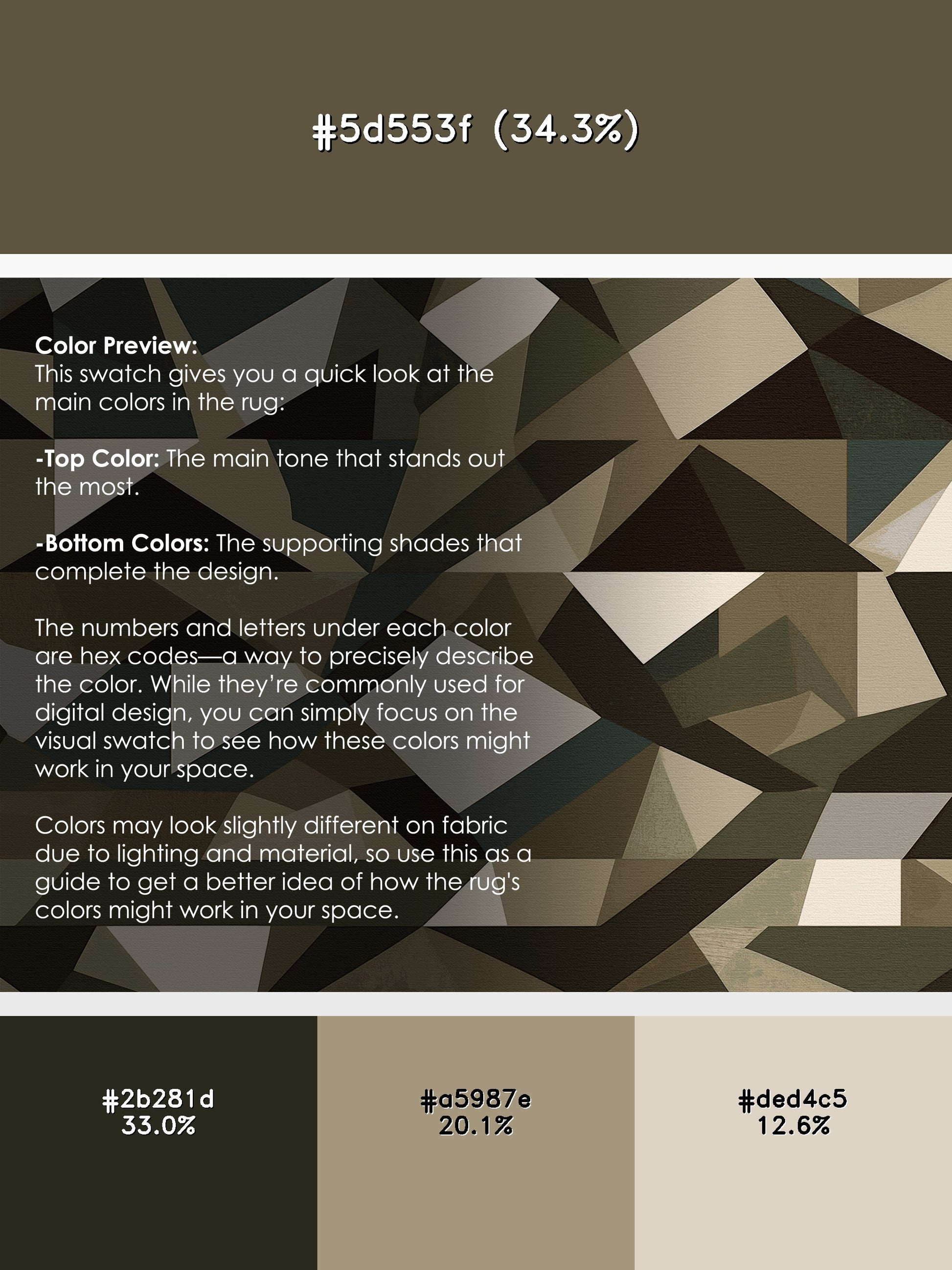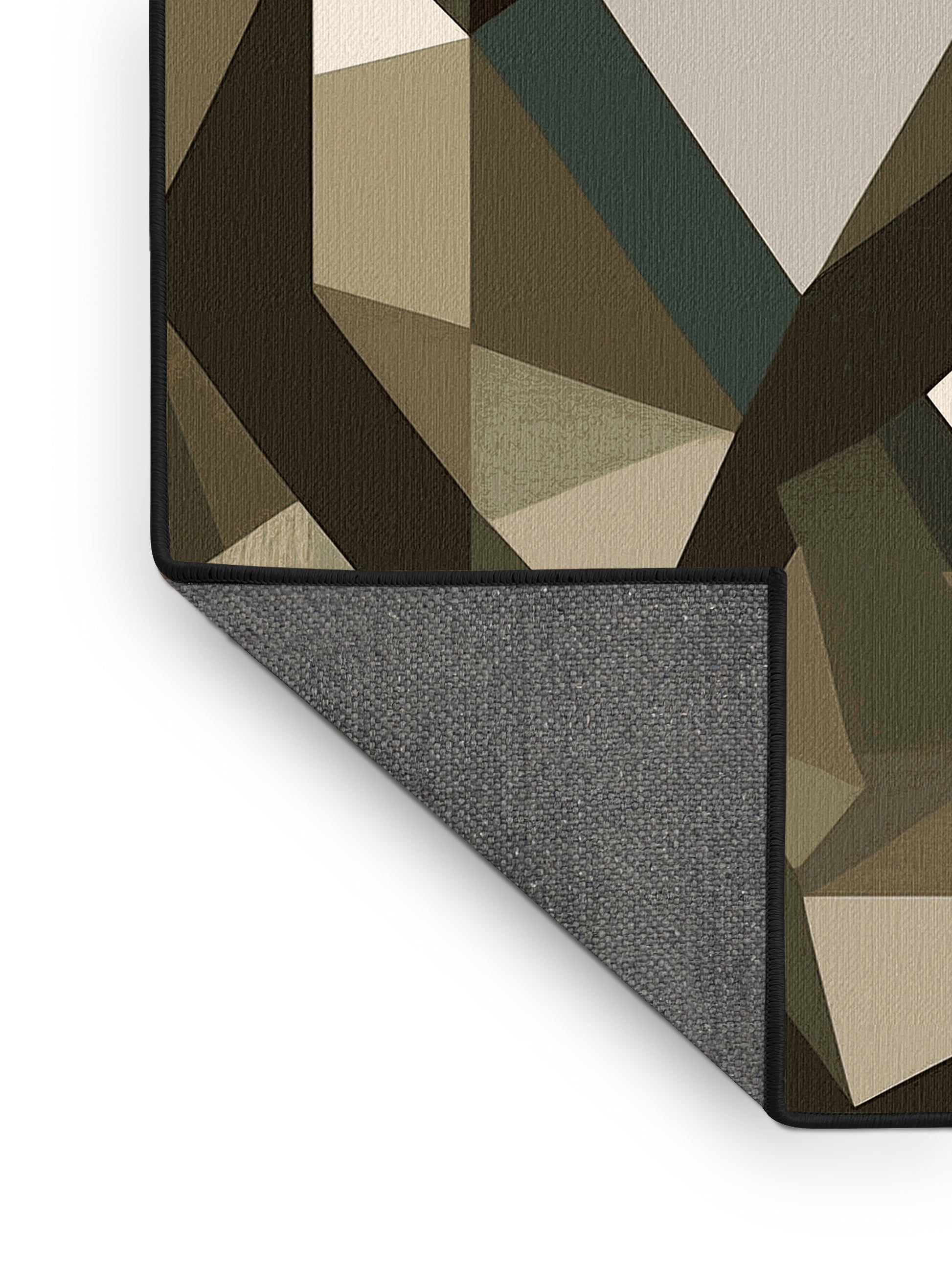 Hunter Terrain from the Tactical Terrain collection brings rugged sophistication to your space with its striking Taupe color (A muted brown with gray undertones, versatile and timeless.), a bold tone in the Brown color family. Inspired by military camouflage and geometric precision, this rug features angular motifs, sharp black gridlines, and a muted palette that evokes strength and resilience. Finished with Black serging a durable edge that enhances its contemporary aesthetic this rug is crafted from premium polyester and machine-made in the USA with imported materials. Perfect for modern living rooms, industrial home offices, or creative studios, this design blends tactical flair with versatile style. Available in multiple sizes, the Tactical Terrain collection transforms your home with a distinctive edge and bold character, elevating any decor scheme.