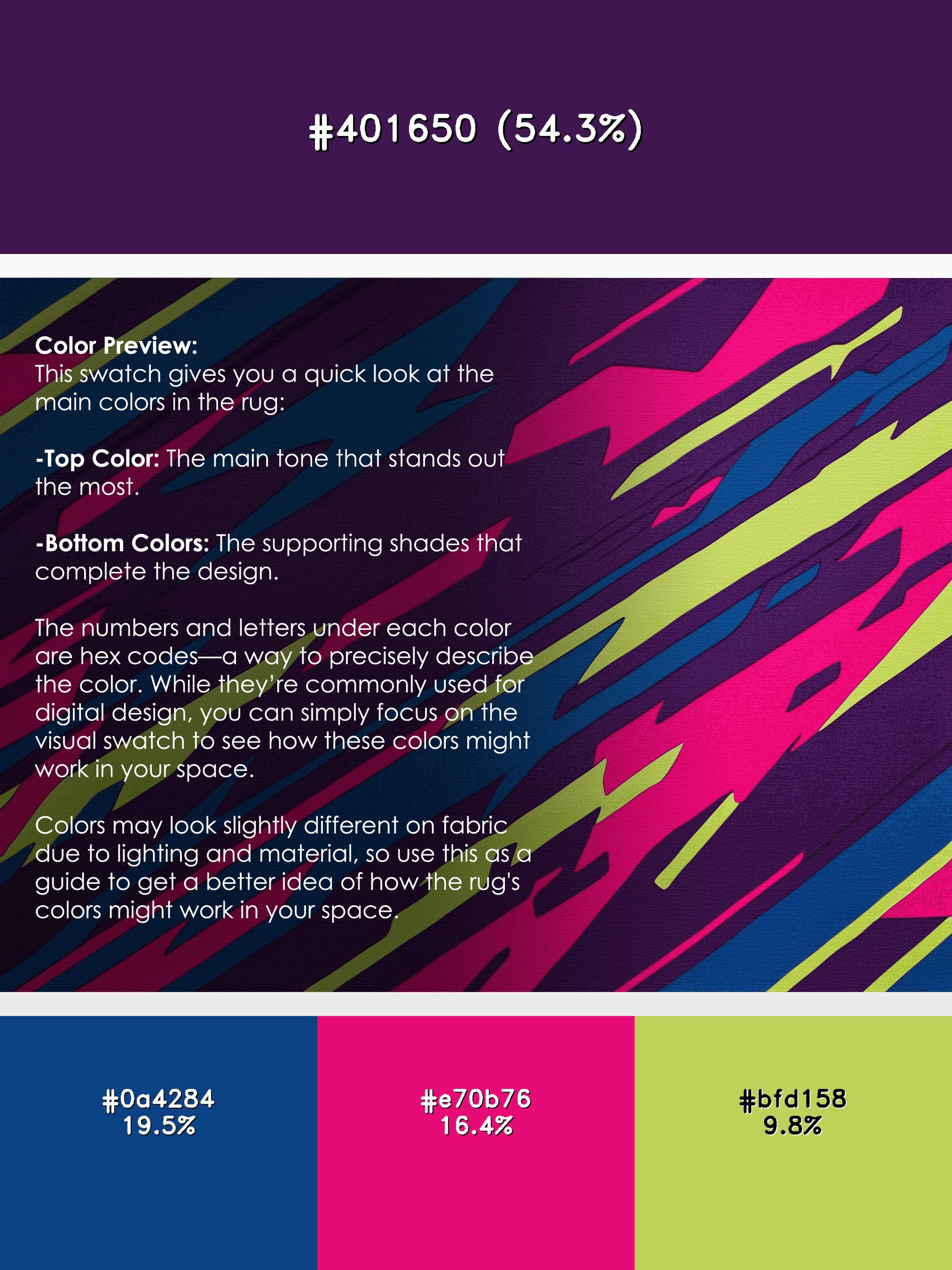 Hyper Flux from the Neon Nexus collection electrifies your space with its bold Purple Haze color (A soft and dreamy purple with hazy undertones, romantic and subtle.), a striking tone in the Purple color family. Inspired by neon-lit cityscapes and cyberpunk design, this rug features sharp geometric patterns and dynamic lines illuminated by vibrant, electric hues. Finished with Navy serging a sleek edge that enhances its futuristic appeal this rug is crafted from premium polyester and machine-made in the USA with imported materials. Perfect for modern gaming rooms, creative studios, or contemporary living spaces, this design balances cutting-edge energy with adaptable elegance. Available in multiple sizes, the Neon Nexus collection transforms any room into a bold statement of innovation and style, channeling the vibrant glow of a cyberpunk universe.