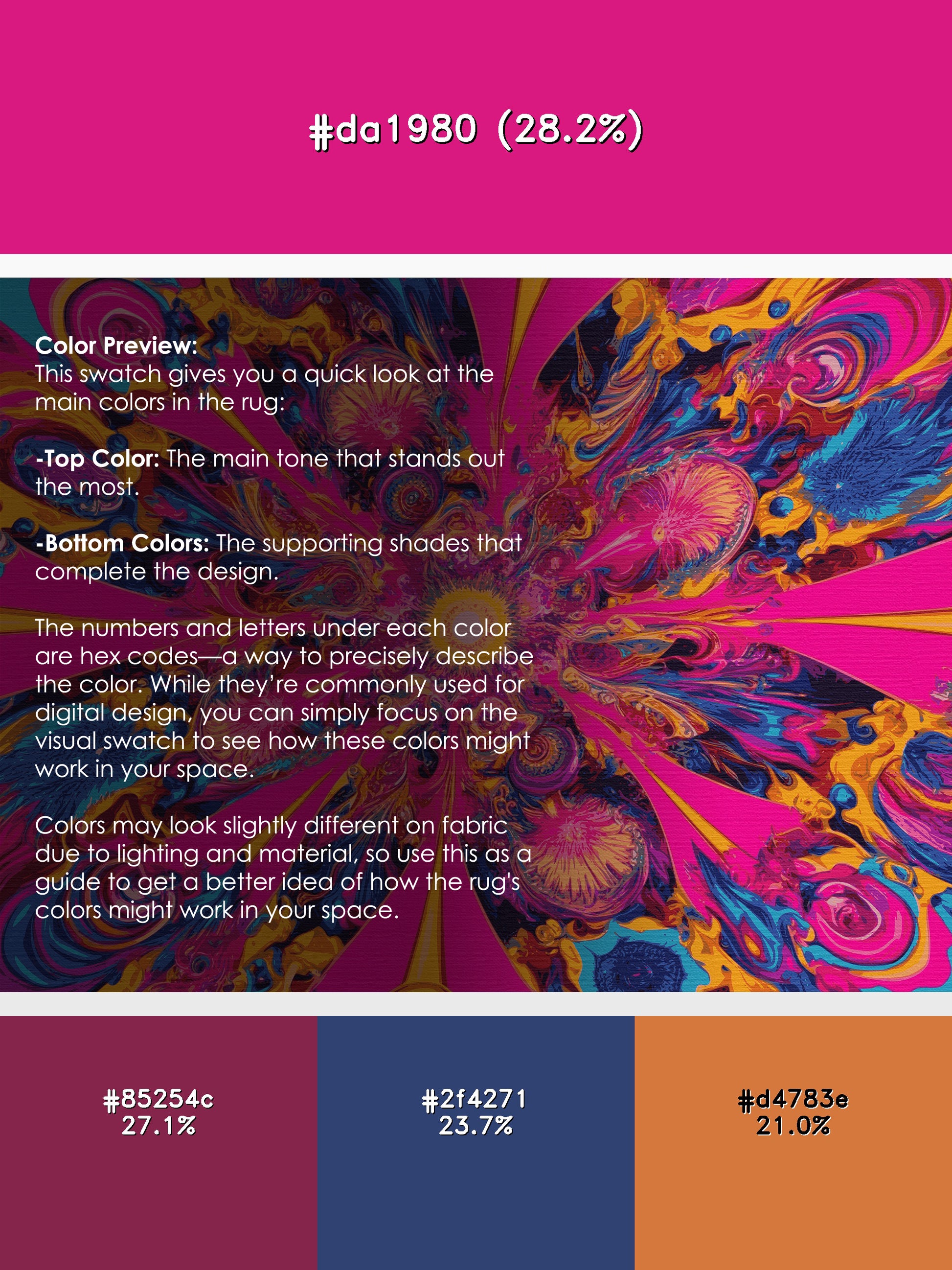 Hypno Pulse from the Psychedelia Peaks collection radiates vibrant energy with its bold Rogue Pink color (A deep and dramatic pink with bold and daring undertones.), a striking tone in the Pink color family. Featuring swirling, kaleidoscopic patterns and electrifying neon hues inspired by the psychedelic art movement, this rug brings a sense of dynamic motion and artistic expression to your space. Finished with Rose serging a durable edge that enhances its playful and vibrant aesthetic this rug is crafted from premium polyester and machine-made in the USA with imported materials. Perfect for eclectic living rooms, retro-inspired spaces, or creative studios, this design transforms any room into a lively haven of individuality and boldness. Available in multiple sizes, the Psychedelia Peaks collection adds a dramatic, colorful statement to your decor, turning your home into a canvas of unrestrained creativity.