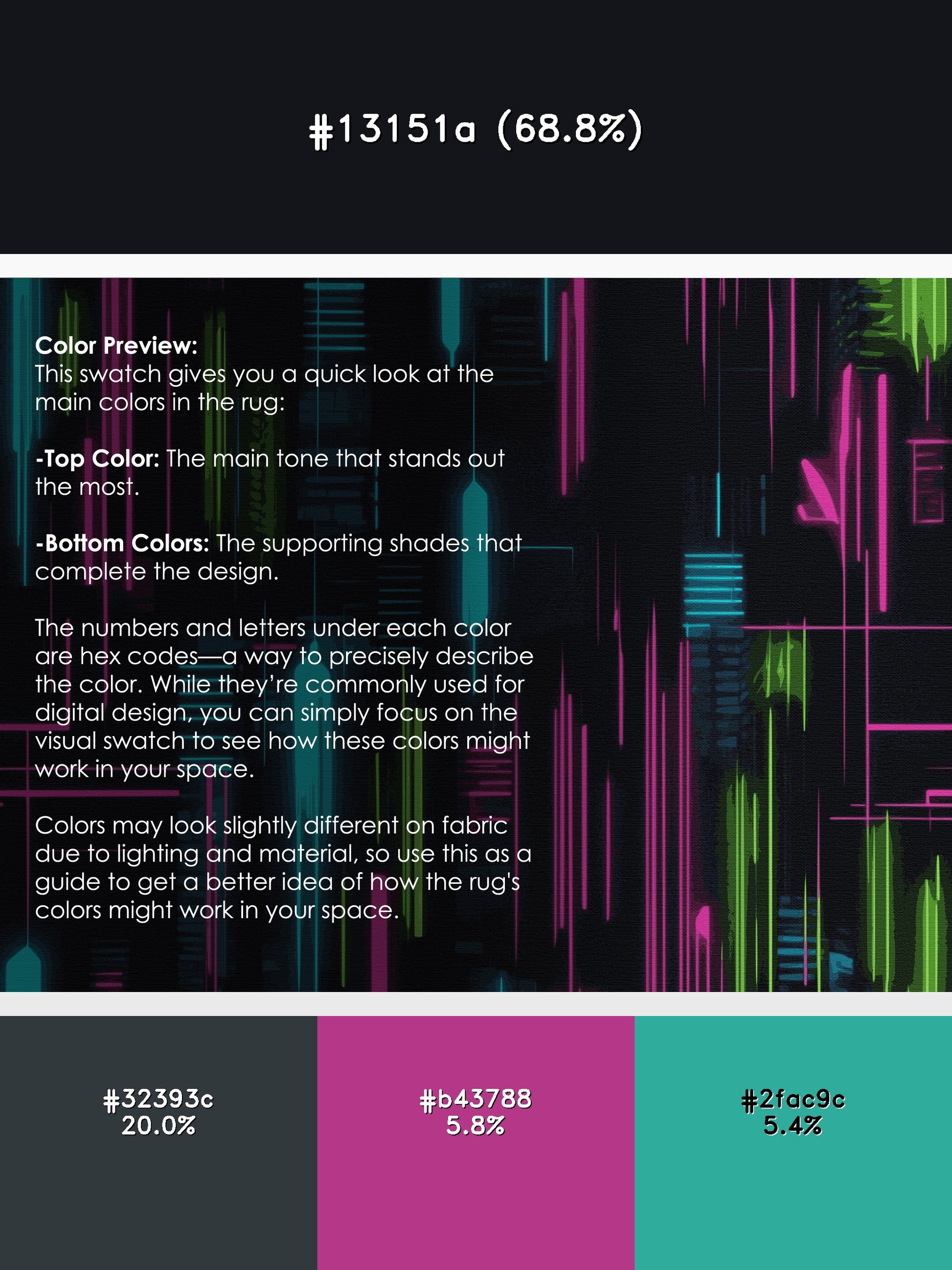 Laser Burst from the Neon Nexus collection electrifies your space with its bold Gunmetal color (A deep, metallic gray with hints of green and blue.), a striking tone in the Gray color family. Inspired by neon-lit cityscapes and cyberpunk design, this rug features sharp geometric patterns and dynamic lines illuminated by vibrant, electric hues. Finished with Black serging a sleek edge that enhances its futuristic appeal this rug is crafted from premium polyester and machine-made in the USA with imported materials. Perfect for modern gaming rooms, creative studios, or contemporary living spaces, this design balances cutting-edge energy with adaptable elegance. Available in multiple sizes, the Neon Nexus collection transforms any room into a bold statement of innovation and style, channeling the vibrant glow of a cyberpunk universe.