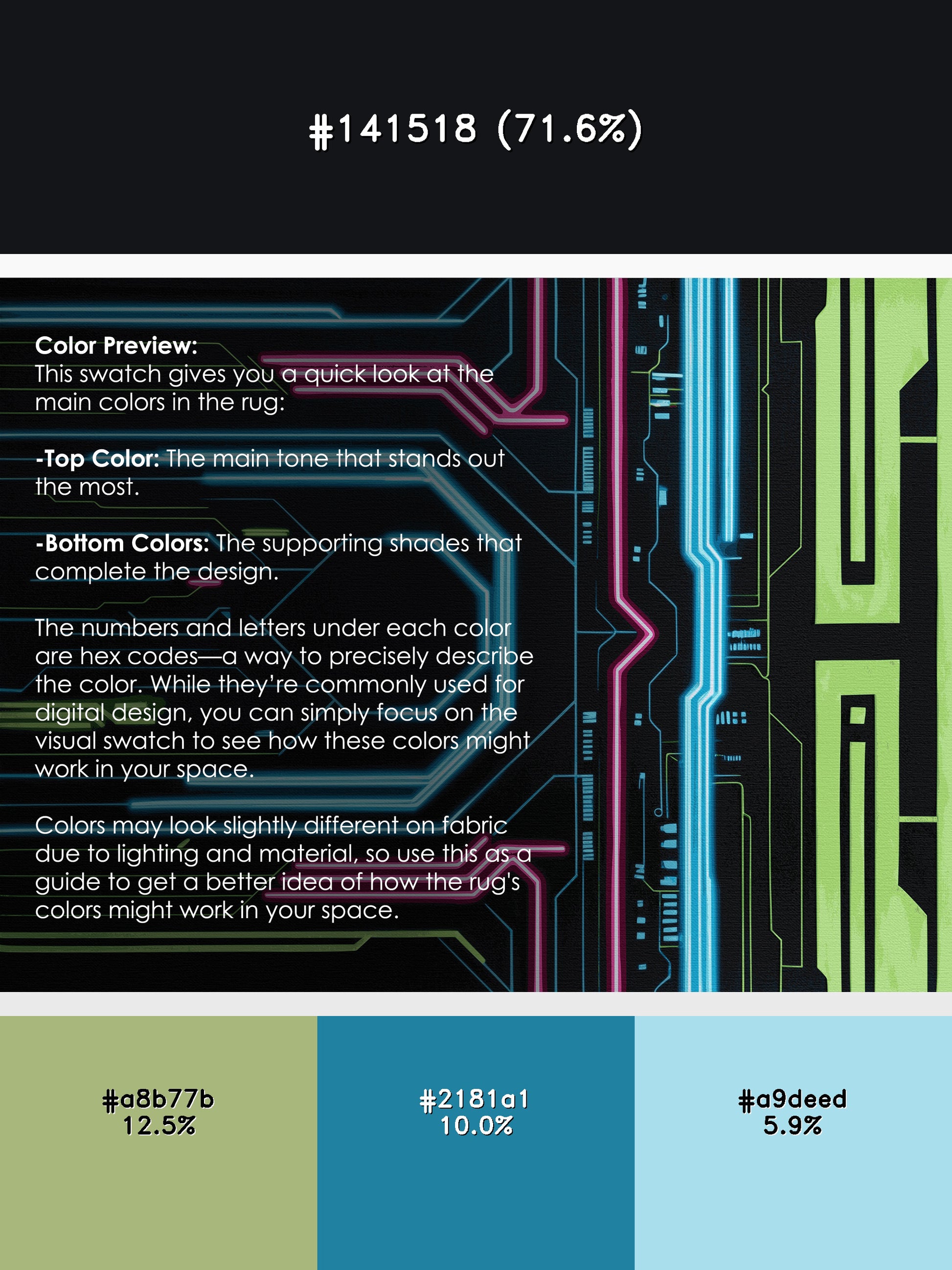 Lumina Horizon from the Neon Nexus collection electrifies your space with its bold Gunmetal color (A deep, metallic gray with hints of green and blue.), a striking tone in the Gray color family. Inspired by neon-lit cityscapes and cyberpunk design, this rug features sharp geometric patterns and dynamic lines illuminated by vibrant, electric hues. Finished with Black serging a sleek edge that enhances its futuristic appeal this rug is crafted from premium polyester and machine-made in the USA with imported materials. Perfect for modern gaming rooms, creative studios, or contemporary living spaces, this design balances cutting-edge energy with adaptable elegance. Available in multiple sizes, the Neon Nexus collection transforms any room into a bold statement of innovation and style, channeling the vibrant glow of a cyberpunk universe.
