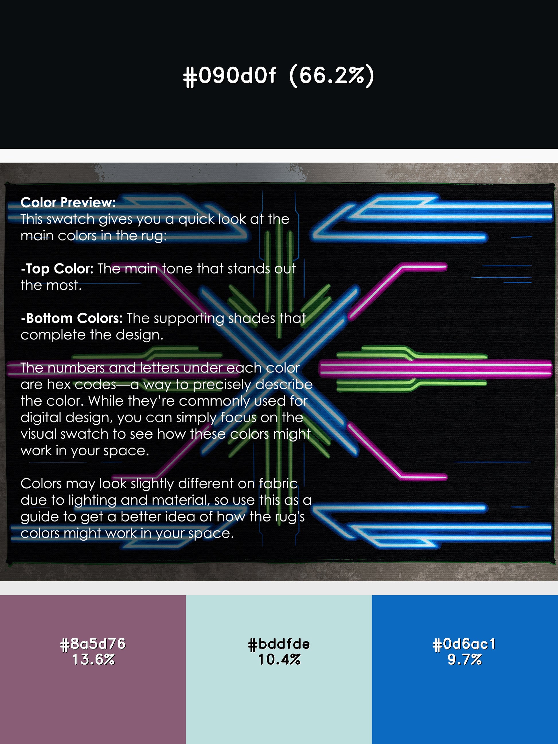 Luminal Orbit from the Neon Nexus collection electrifies your space with its bold Night Blue color (A rich, dark blue inspired by the color of the night sky.), a striking tone in the Blue color family. Inspired by neon-lit cityscapes and cyberpunk design, this rug features sharp geometric patterns and dynamic lines illuminated by vibrant, electric hues. Finished with Black serging a sleek edge that enhances its futuristic appeal this rug is crafted from premium polyester and machine-made in the USA with imported materials. Perfect for modern gaming rooms, creative studios, or contemporary living spaces, this design balances cutting-edge energy with adaptable elegance. Available in multiple sizes, the Neon Nexus collection transforms any room into a bold statement of innovation and style, channeling the vibrant glow of a cyberpunk universe.