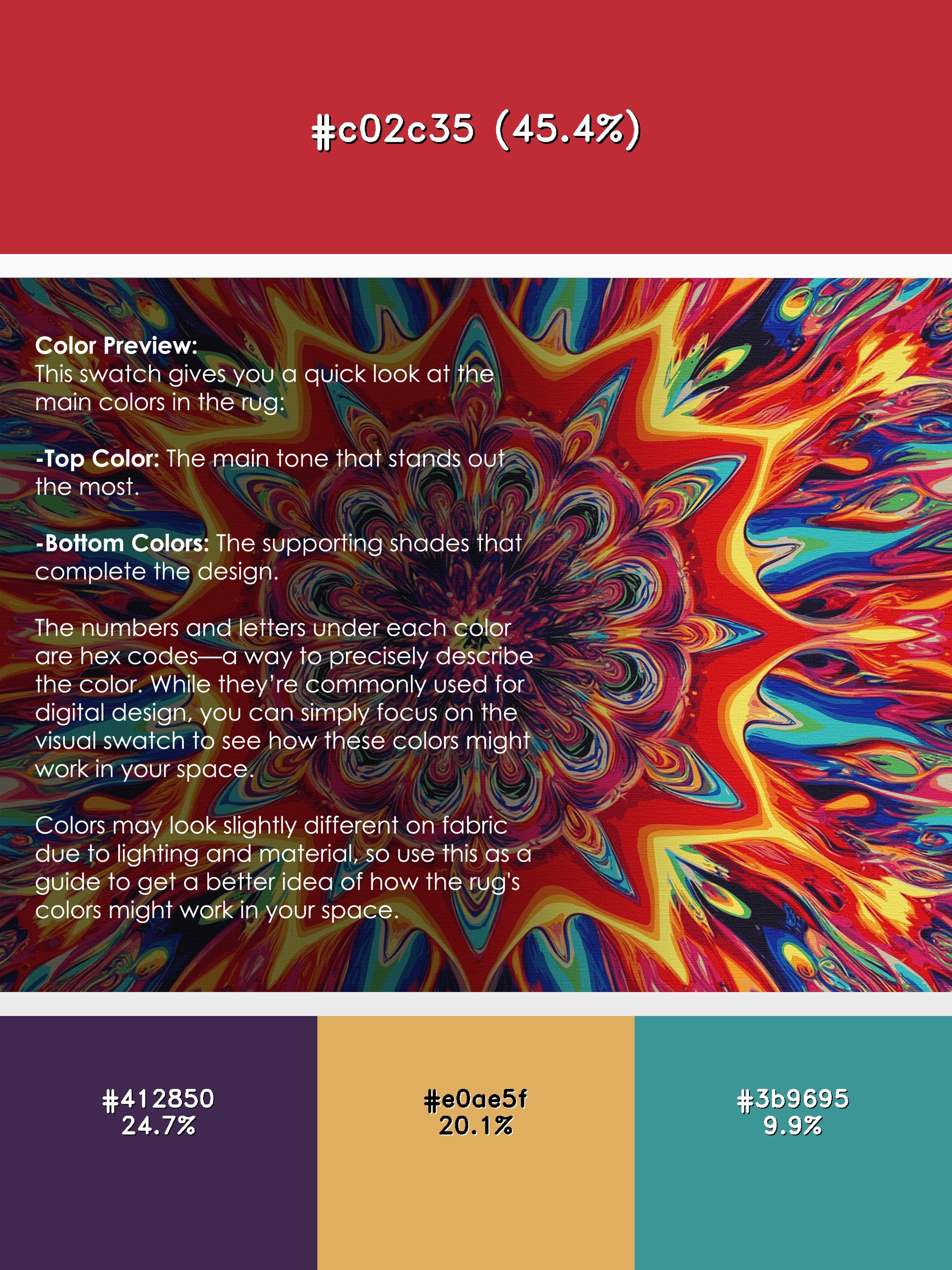 Luminous Bloom from the Psychedelia Peaks collection radiates vibrant energy with its bold Cherry Red color (A deep and bold red inspired by ripe cherries.), a striking tone in the Red color family. Featuring swirling, kaleidoscopic patterns and electrifying neon hues inspired by the psychedelic art movement, this rug brings a sense of dynamic motion and artistic expression to your space. Finished with Rose serging a durable edge that enhances its playful and vibrant aesthetic this rug is crafted from premium polyester and machine-made in the USA with imported materials. Perfect for eclectic living rooms, retro-inspired spaces, or creative studios, this design transforms any room into a lively haven of individuality and boldness. Available in multiple sizes, the Psychedelia Peaks collection adds a dramatic, colorful statement to your decor, turning your home into a canvas of unrestrained creativity.