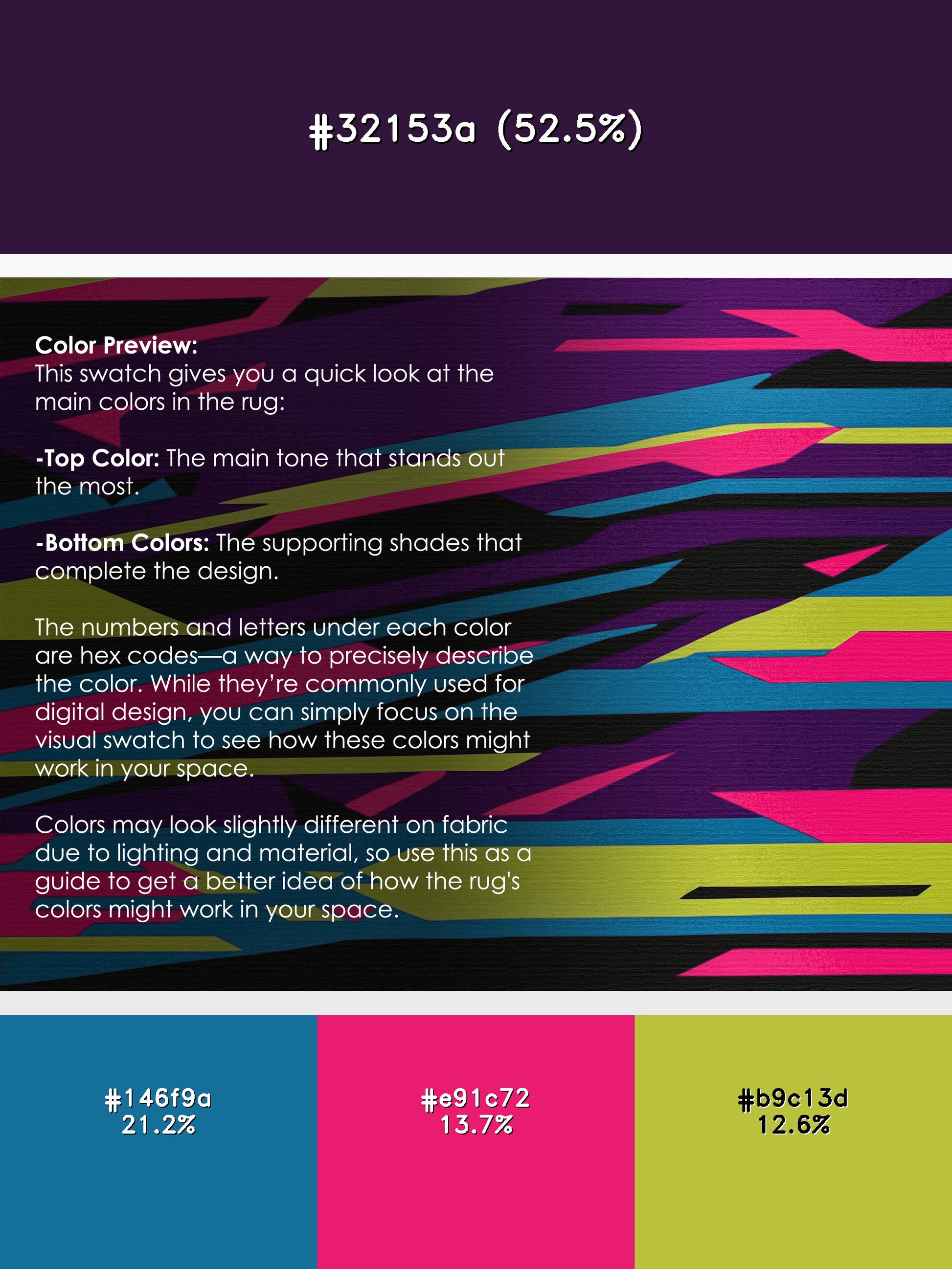 Luminous Stride from the Neon Nexus collection electrifies your space with its bold Purple Jam color (A rich and deep purple with a vibrant, jam-like hue.), a striking tone in the Purple color family. Inspired by neon-lit cityscapes and cyberpunk design, this rug features sharp geometric patterns and dynamic lines illuminated by vibrant, electric hues. Finished with Navy serging a sleek edge that enhances its futuristic appeal this rug is crafted from premium polyester and machine-made in the USA with imported materials. Perfect for modern gaming rooms, creative studios, or contemporary living spaces, this design balances cutting-edge energy with adaptable elegance. Available in multiple sizes, the Neon Nexus collection transforms any room into a bold statement of innovation and style, channeling the vibrant glow of a cyberpunk universe.