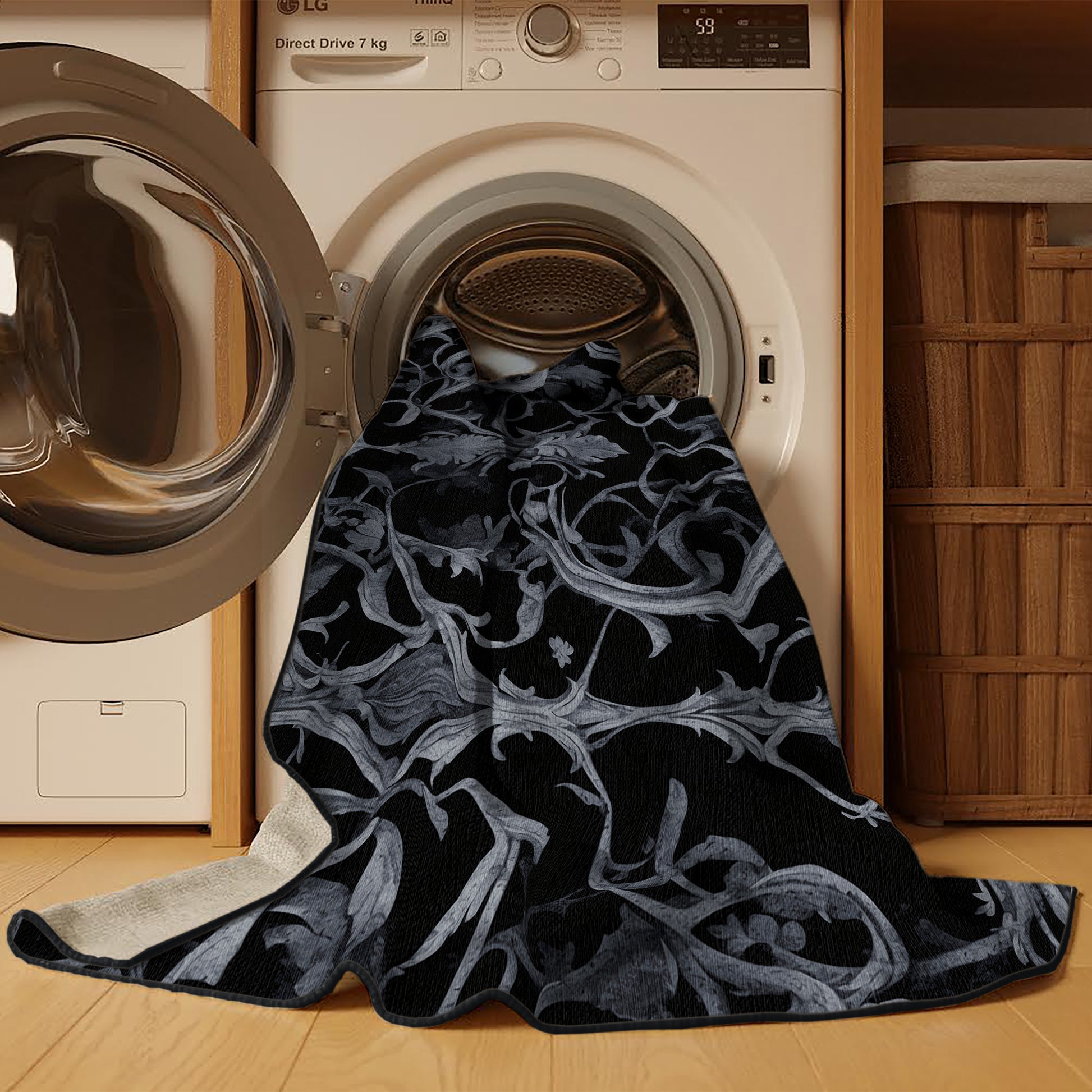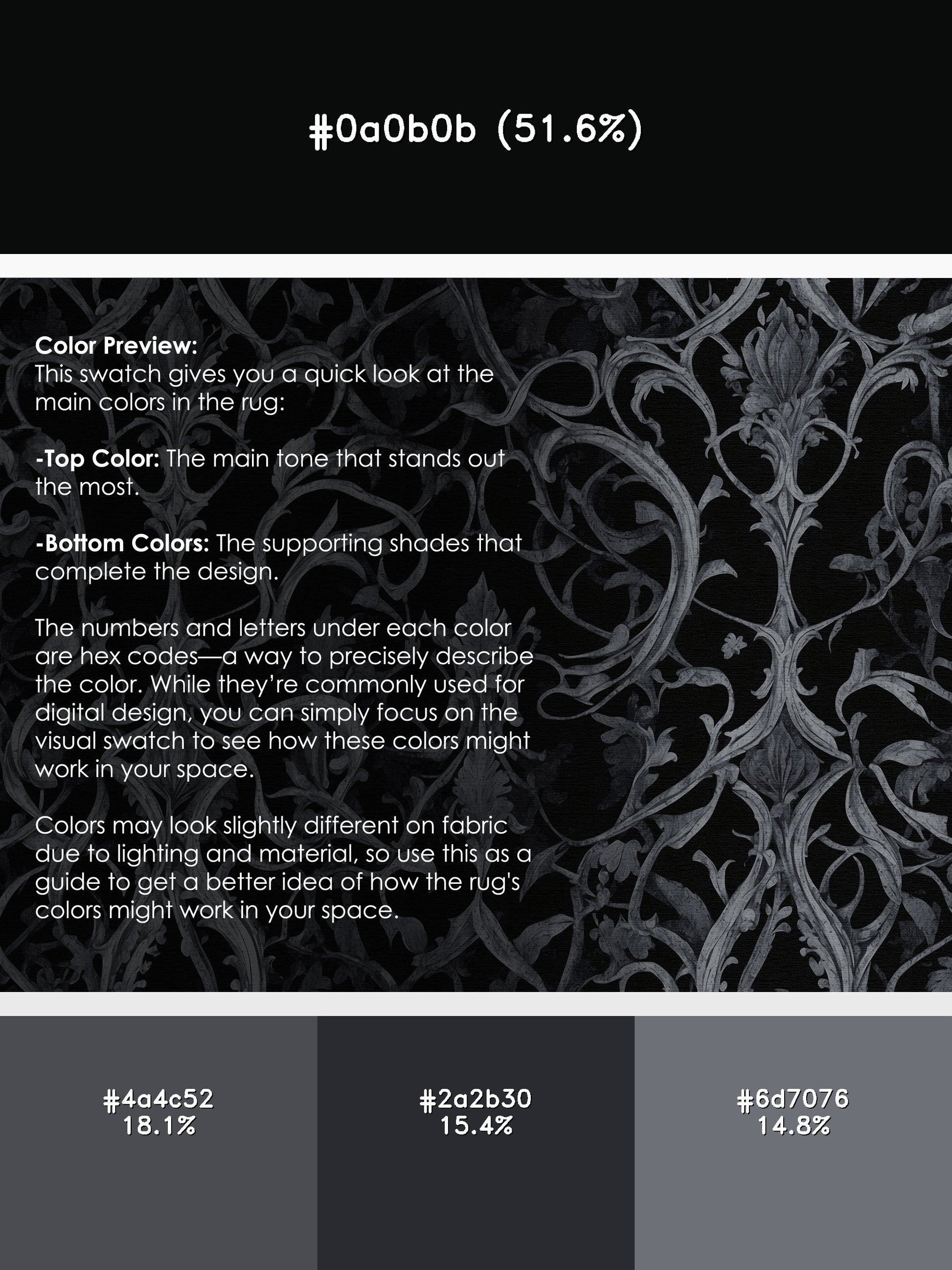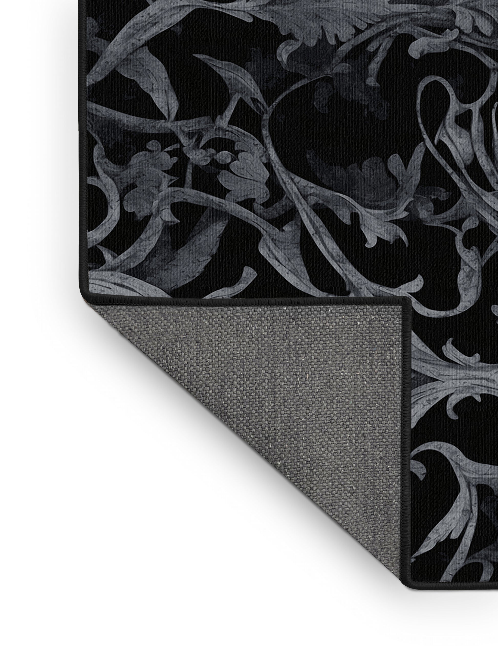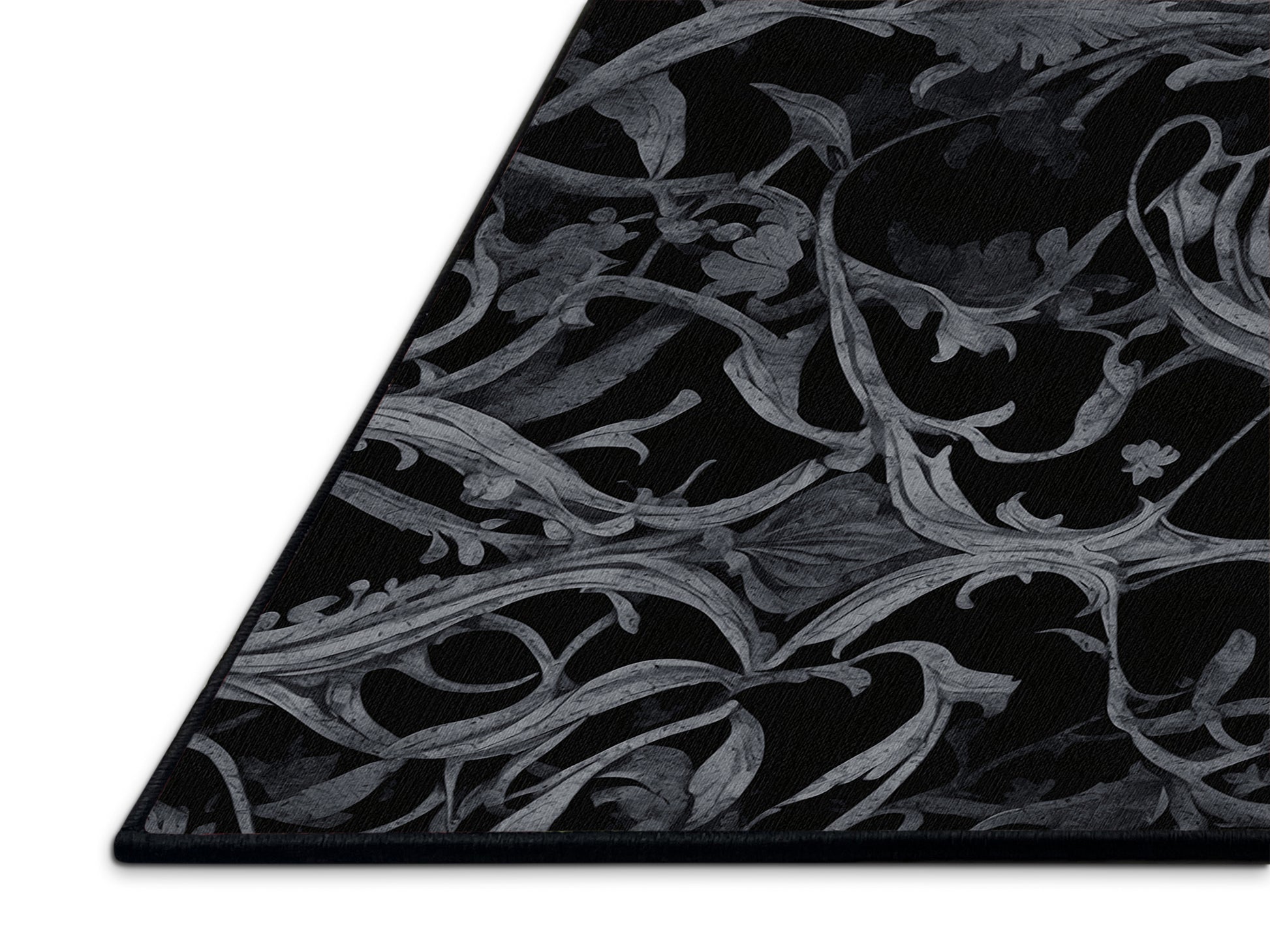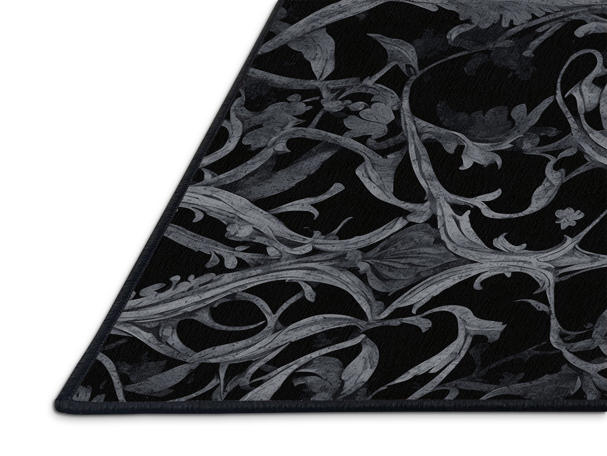 Moonlit Noir from the Nocturne Elegance collection exudes timeless sophistication with its captivating Gunmetal color (A deep, metallic gray with hints of green and blue.), a rich tone in the Gray color family. Featuring intricate baroque-inspired patterns and swirling vine designs, this rug creates a sense of depth and refined elegance. Finished with Black serging a durable edge that enhances its luxurious aesthetic this rug is crafted from premium polyester and machine-made in the USA with imported materials. Perfect for formal dining rooms, chic living areas, or cozy bedrooms, this design balances bold drama with subtle charm, complementing both contemporary and traditional interiors. Available in multiple sizes, the Nocturne Elegance collection transforms your home into a haven of understated grandeur and classic refinement.