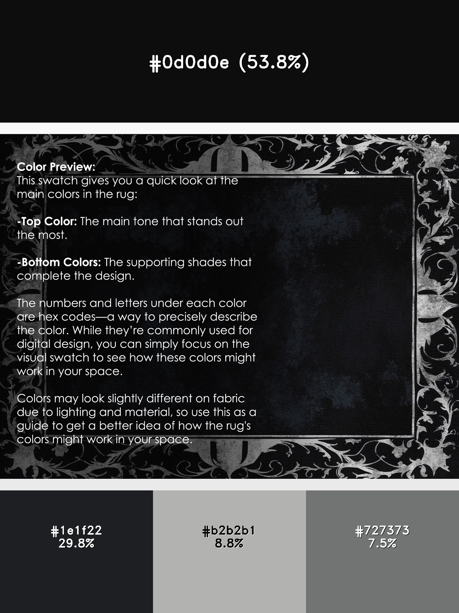 Mystic Veil from the Nocturne Elegance collection exudes timeless sophistication with its captivating Night color (A rich, dark black with a hint of depth, evoking the stillness of night.), a rich tone in the Black color family. Featuring intricate baroque-inspired patterns and swirling vine designs, this rug creates a sense of depth and refined elegance. Finished with Gray serging a durable edge that enhances its luxurious aesthetic this rug is crafted from premium polyester and machine-made in the USA with imported materials. Perfect for formal dining rooms, chic living areas, or cozy bedrooms, this design balances bold drama with subtle charm, complementing both contemporary and traditional interiors. Available in multiple sizes, the Nocturne Elegance collection transforms your home into a haven of understated grandeur and classic refinement.