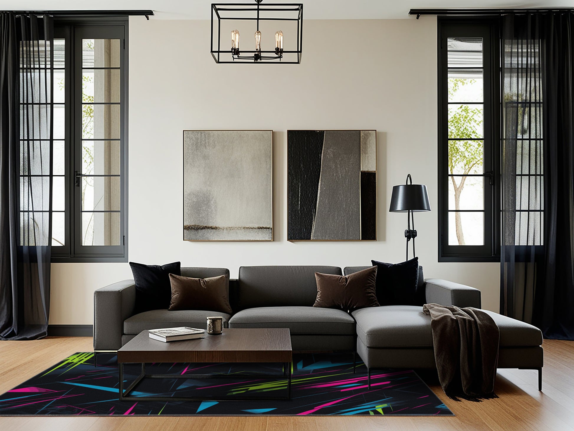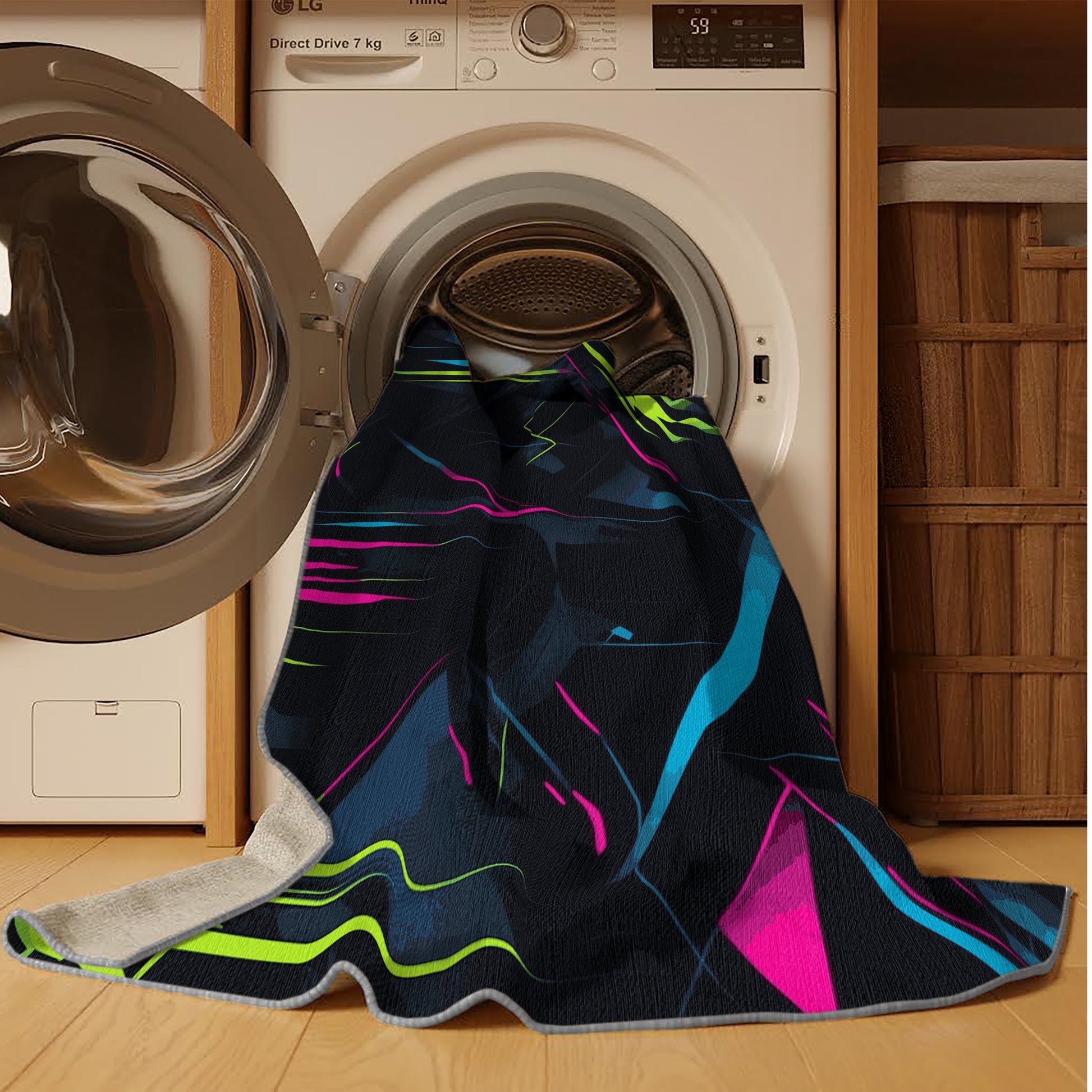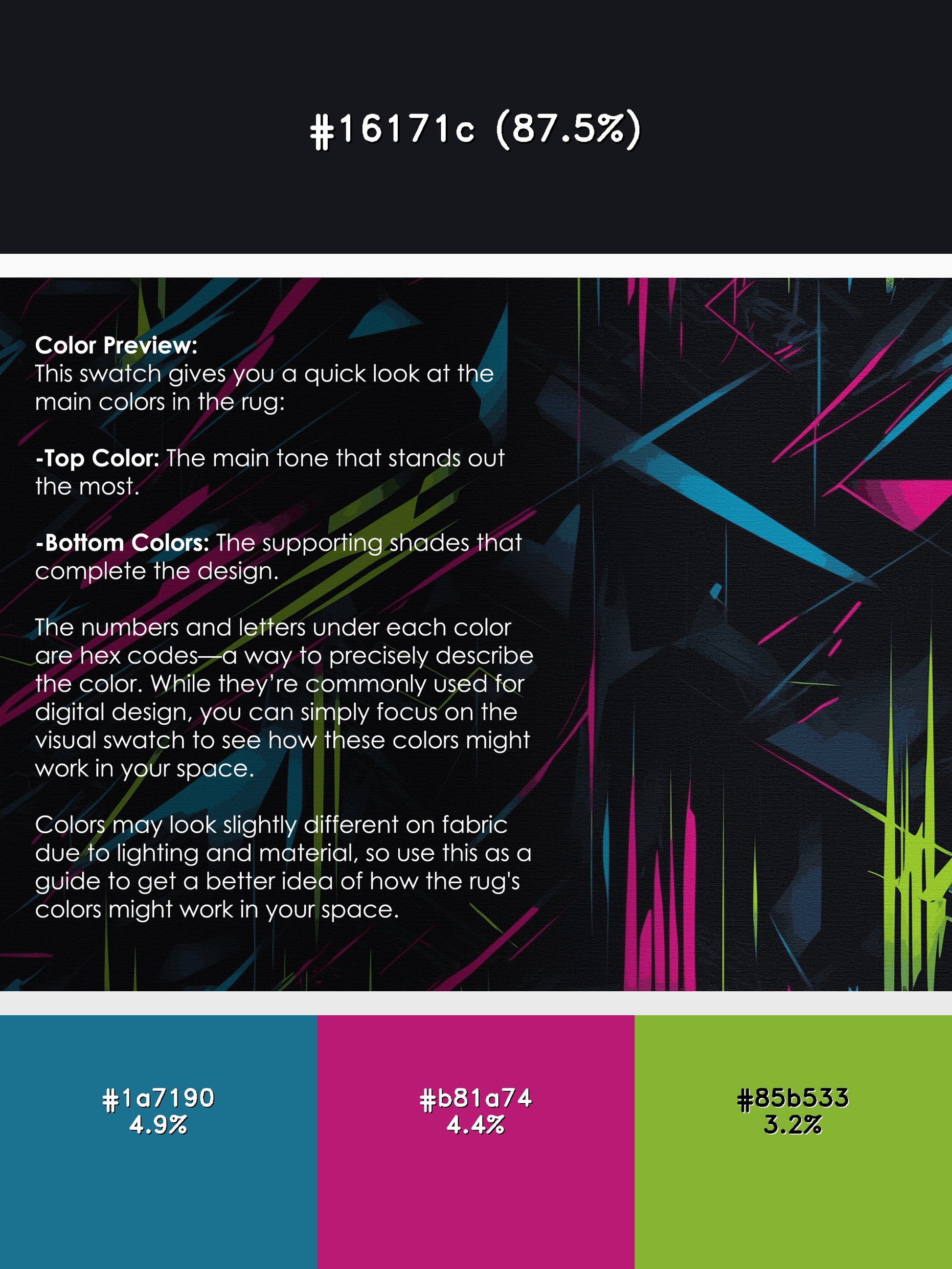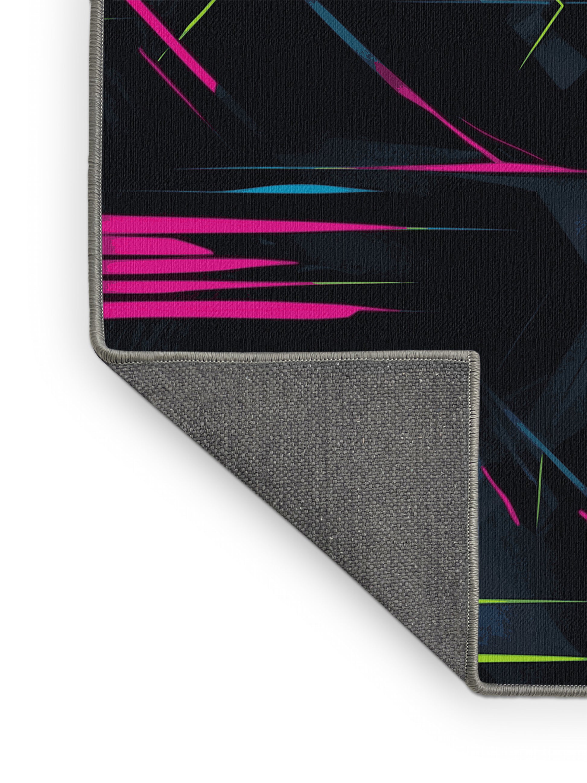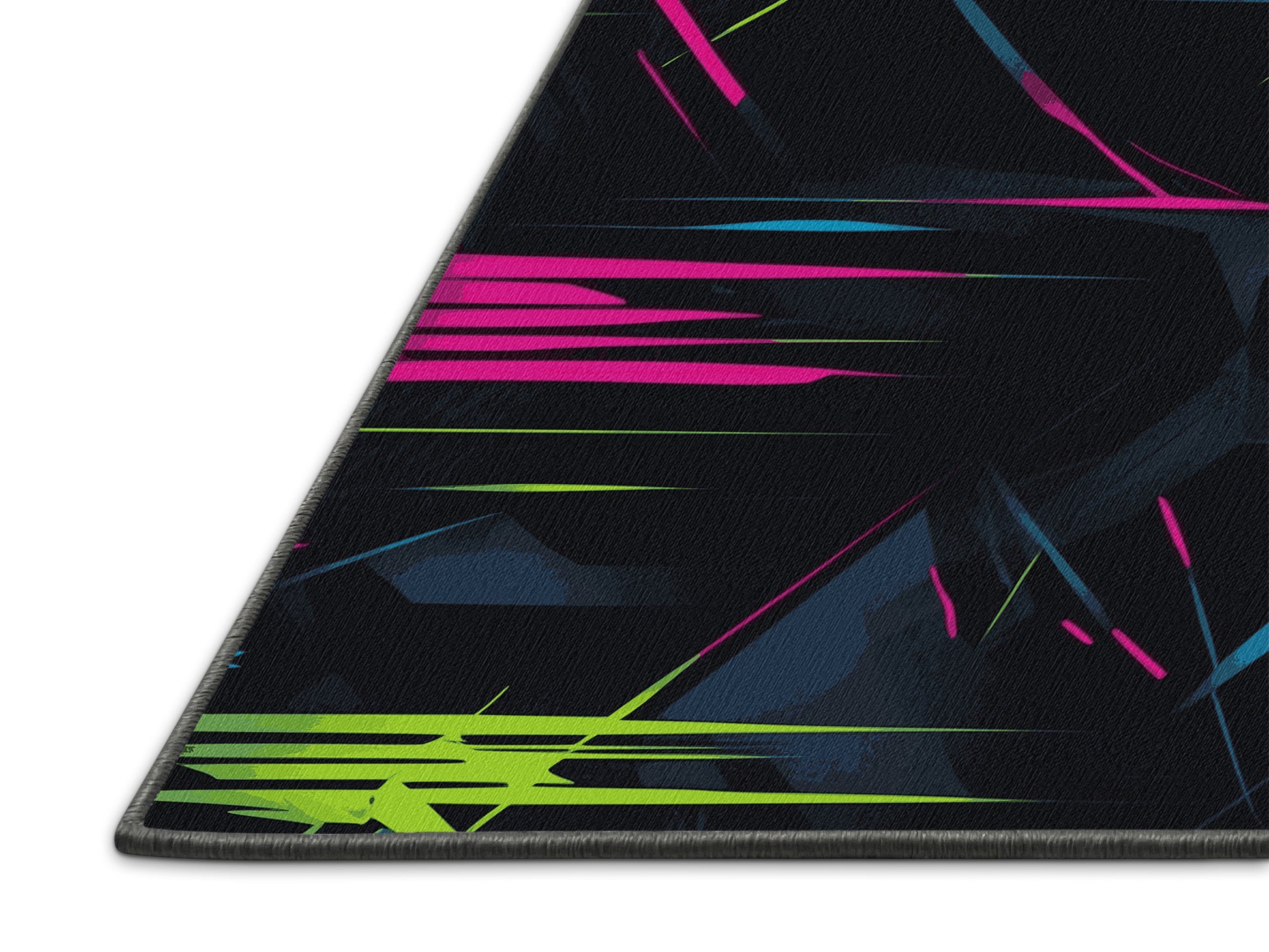 Neon Splinter from the Neon Nexus collection electrifies your space with its bold Mist Blue color (A soft, grayish blue that's calming and delicate.), a striking tone in the Blue color family. Inspired by neon-lit cityscapes and cyberpunk design, this rug features sharp geometric patterns and dynamic lines illuminated by vibrant, electric hues. Finished with Gray serging a sleek edge that enhances its futuristic appeal this rug is crafted from premium polyester and machine-made in the USA with imported materials. Perfect for modern gaming rooms, creative studios, or contemporary living spaces, this design balances cutting-edge energy with adaptable elegance. Available in multiple sizes, the Neon Nexus collection transforms any room into a bold statement of innovation and style, channeling the vibrant glow of a cyberpunk universe.