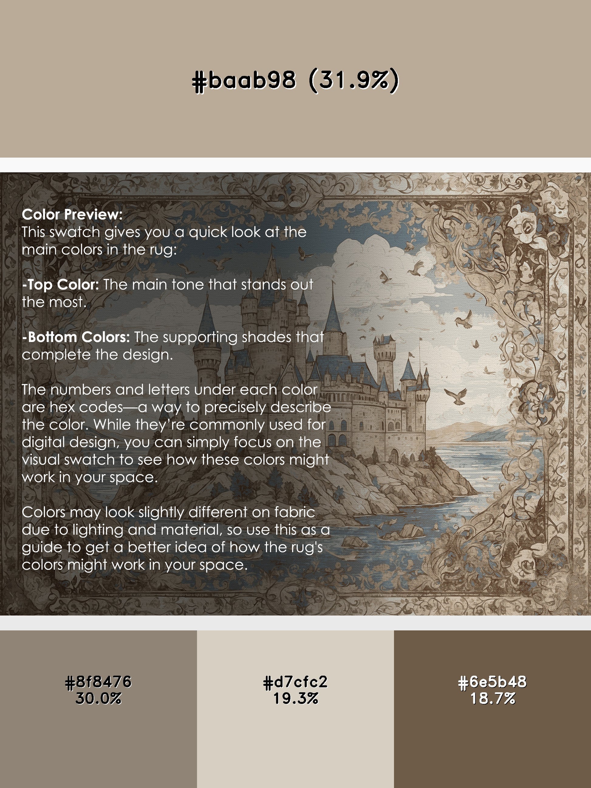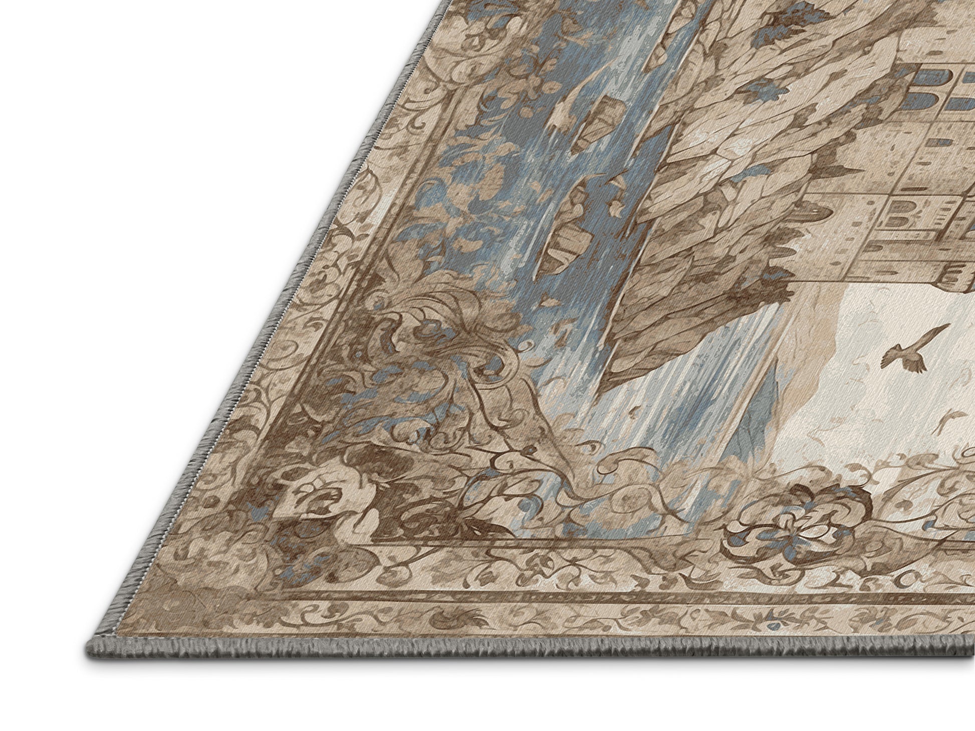 Noble Ascent from the Castle Chronicles collection brings the timeless grandeur of medieval elegance to your space with its striking Sandstone color (A soft and warm beige inspired by natural sandstone.), a rich tone in the Beige color family. Featuring intricate castle motifs and ornate detailing, this rug is finished with Gray serging a durable stitched edge that prevents fraying and enhances its refined look. Crafted from premium polyester and machine-made in the USA with imported materials, it delivers lasting quality and effortless sophistication. Perfect for study rooms, traditional living spaces, luxurious offices, and dining areas, this design combines heraldic patterns, vintage artistry, and everyday practicality. Available in multiple sizes, the Castle Chronicles collection offers a stately yet versatile style to transform your home into a regal retreat steeped in history and charm.
