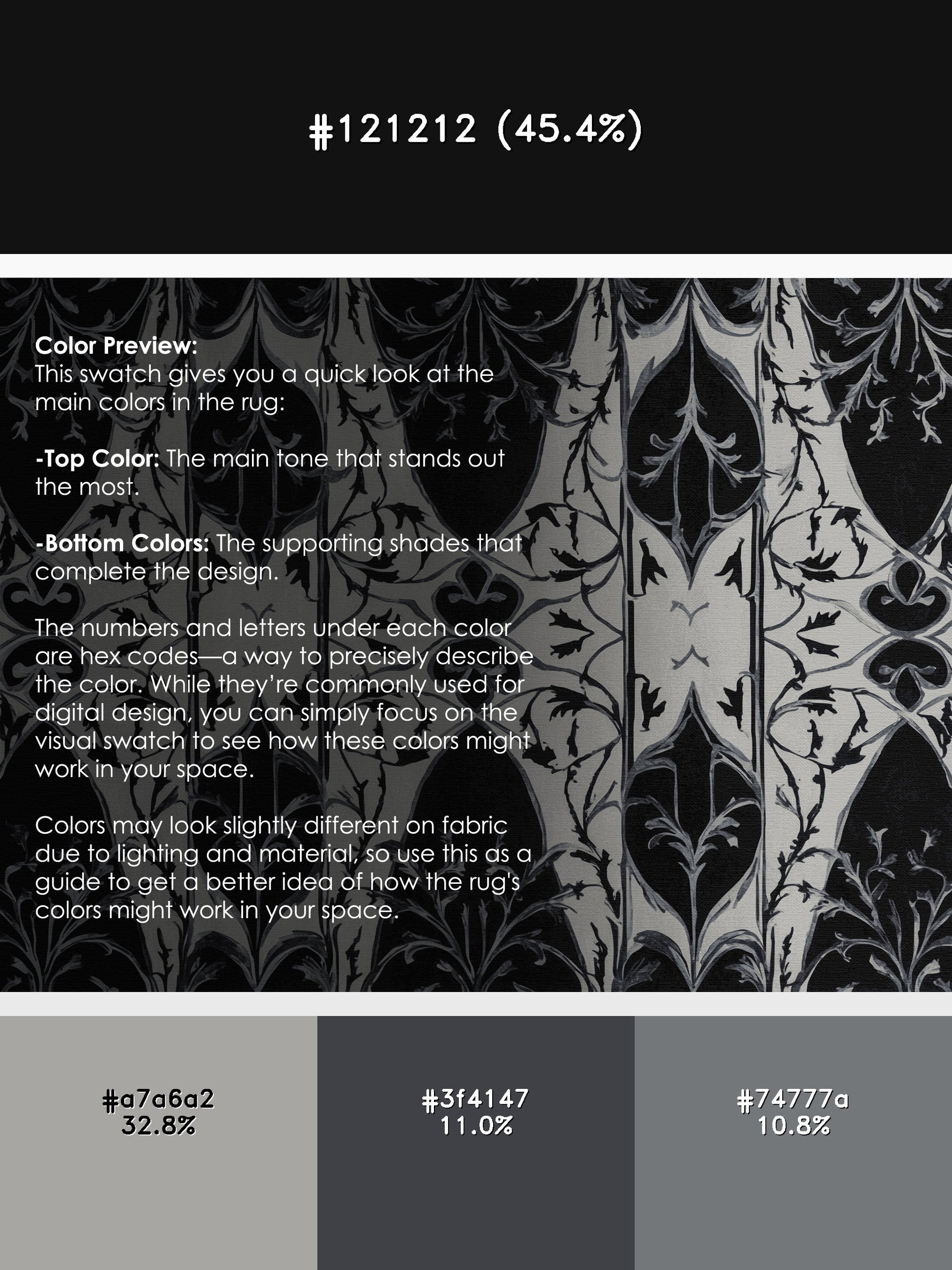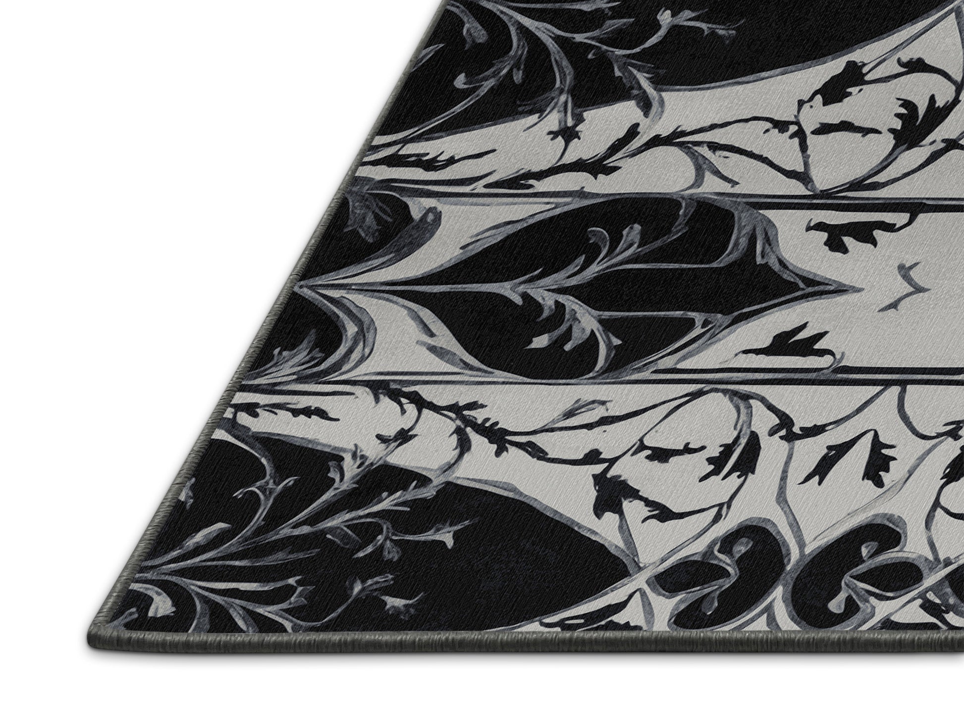 Obsidian Scroll from the Nocturne Elegance collection exudes timeless sophistication with its captivating Night color (A rich, dark black with a hint of depth, evoking the stillness of night.), a rich tone in the Black color family. Featuring intricate baroque-inspired patterns and swirling vine designs, this rug creates a sense of depth and refined elegance. Finished with Gray serging a durable edge that enhances its luxurious aesthetic this rug is crafted from premium polyester and machine-made in the USA with imported materials. Perfect for formal dining rooms, chic living areas, or cozy bedrooms, this design balances bold drama with subtle charm, complementing both contemporary and traditional interiors. Available in multiple sizes, the Nocturne Elegance collection transforms your home into a haven of understated grandeur and classic refinement.